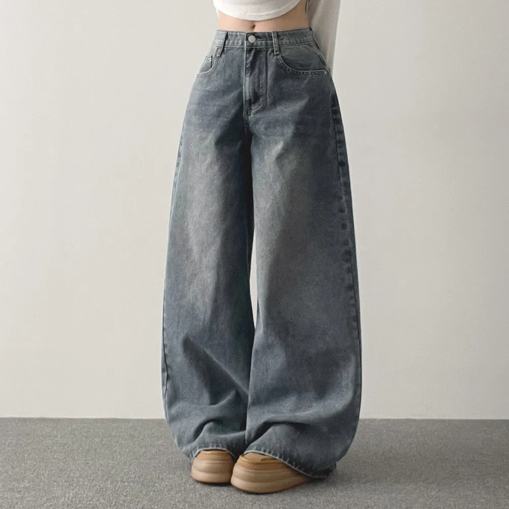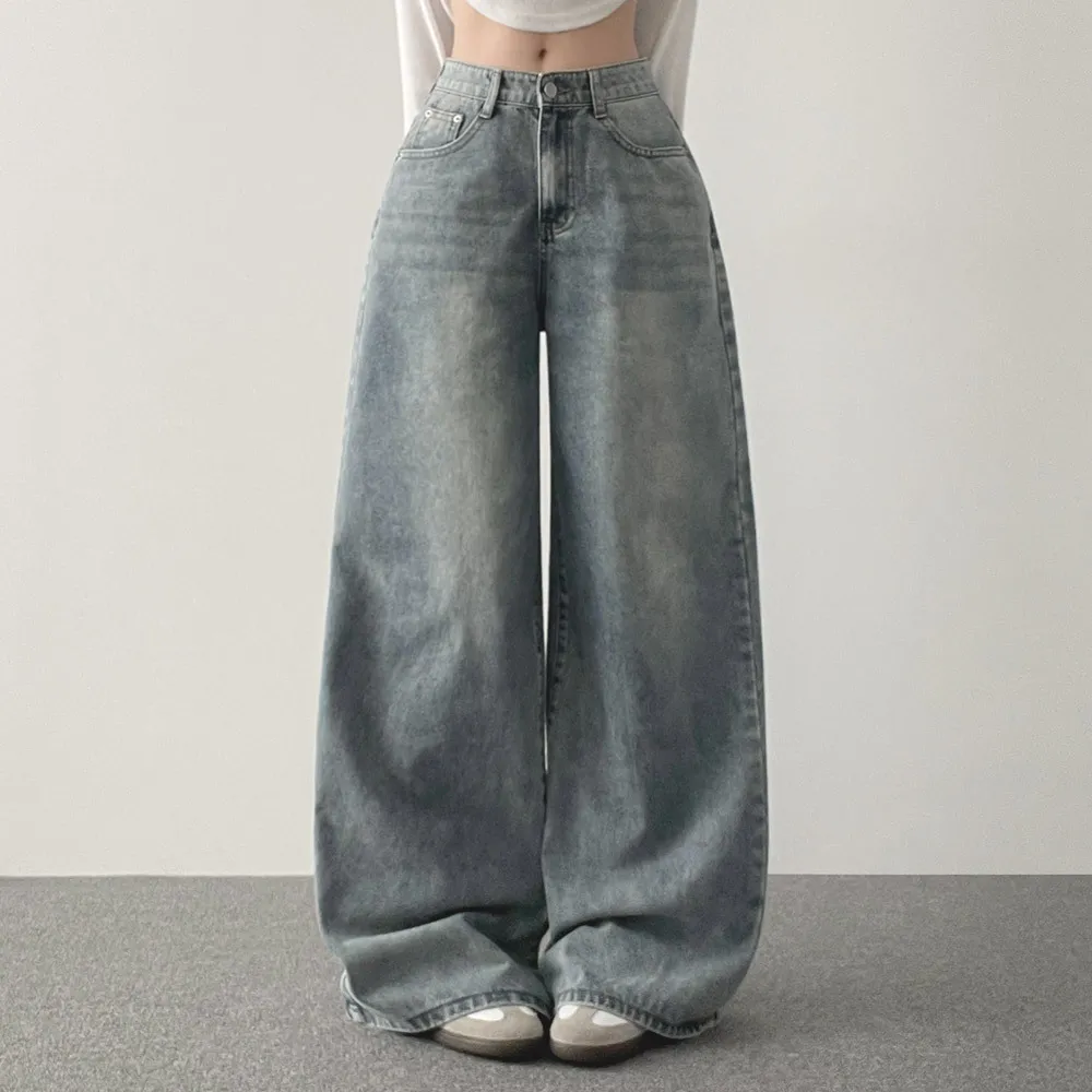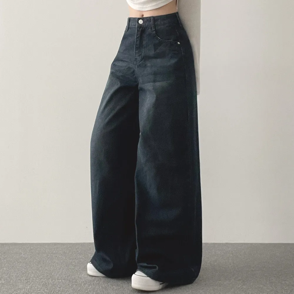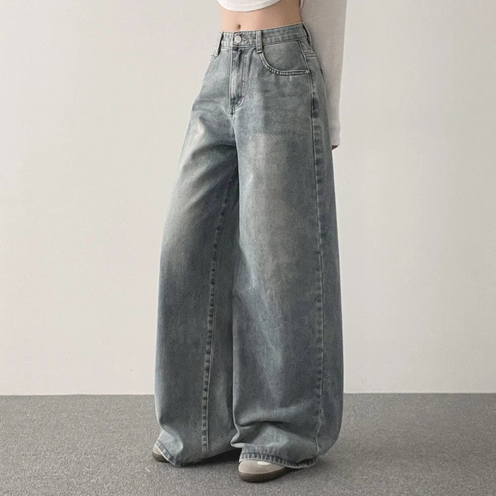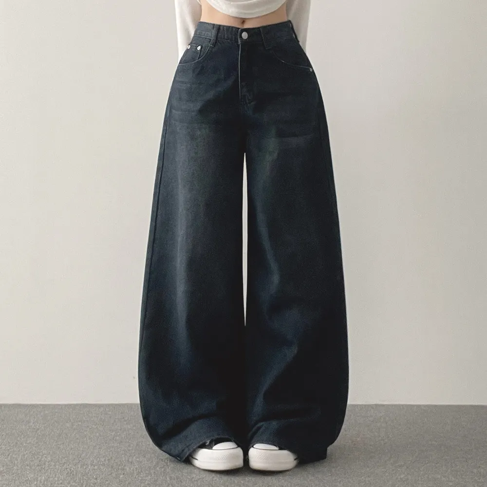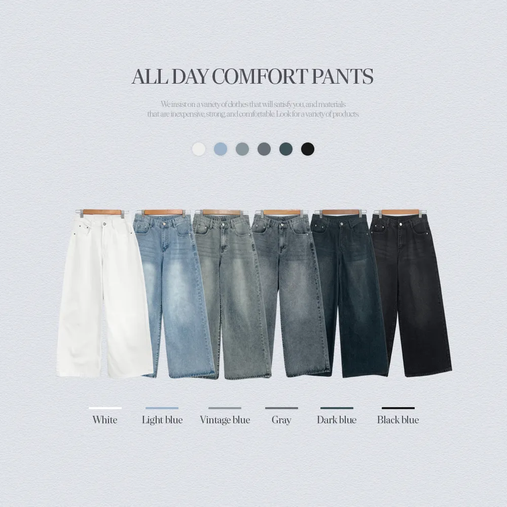 デニムコットンウォッシングポケットリベットバックポケットストレートワイドジップアップバックルループヒドゥンバンディングライトブルーディープブルーデニムパンツ[選べる丈]