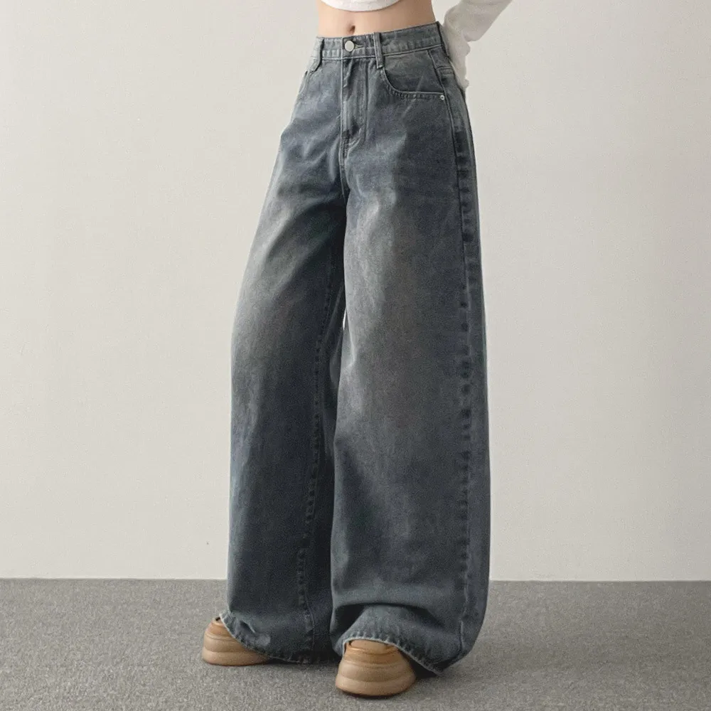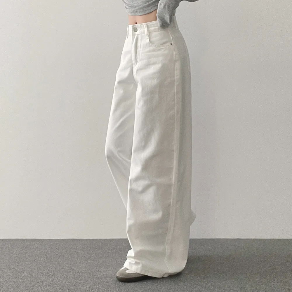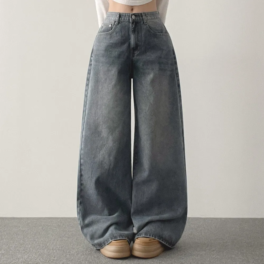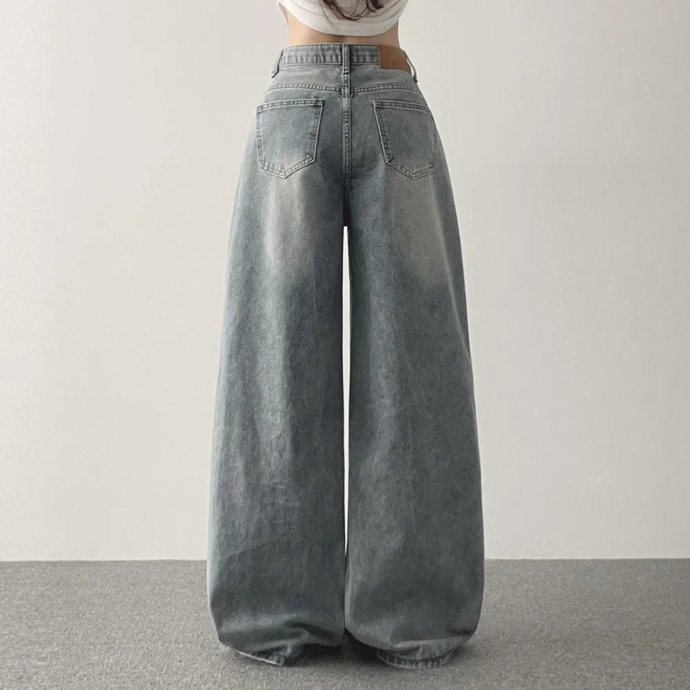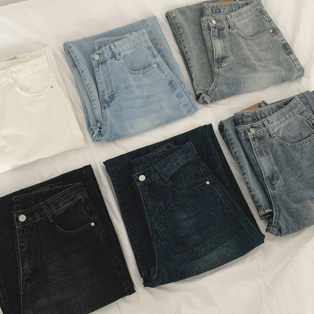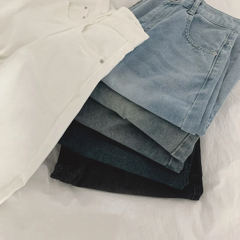 デニムコットンウォッシングポケットリベットバックポケットストレートワイドジップアップバックルループヒドゥンバンディングライトブルーディープブルーデニムパンツ[選べる丈]