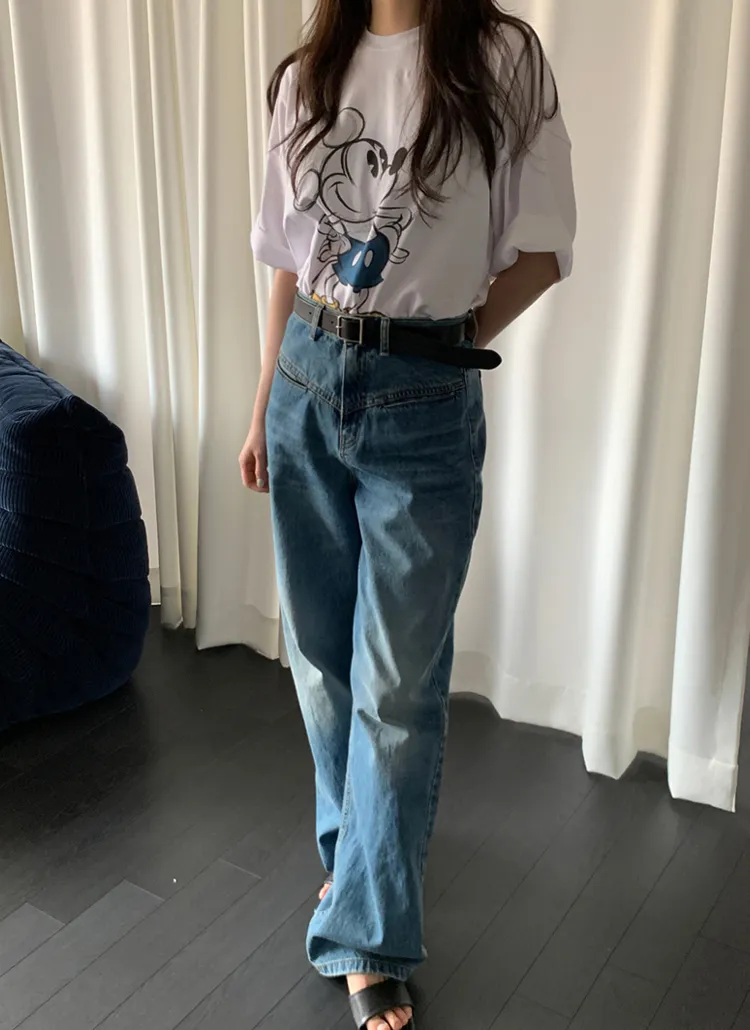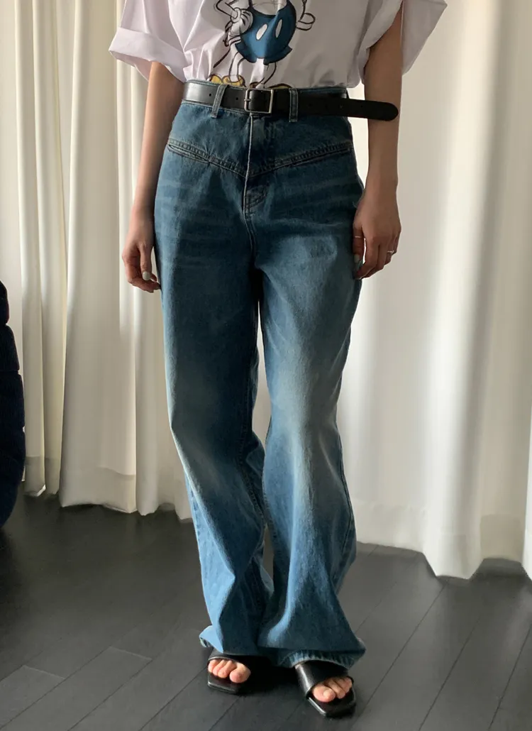 デニムコットンウォッシングポケットリベットバックポケットストレートワイドジップアップバックルループヒドゥンバンディングライトブルーディープブルーデニムパンツ[選べる丈]