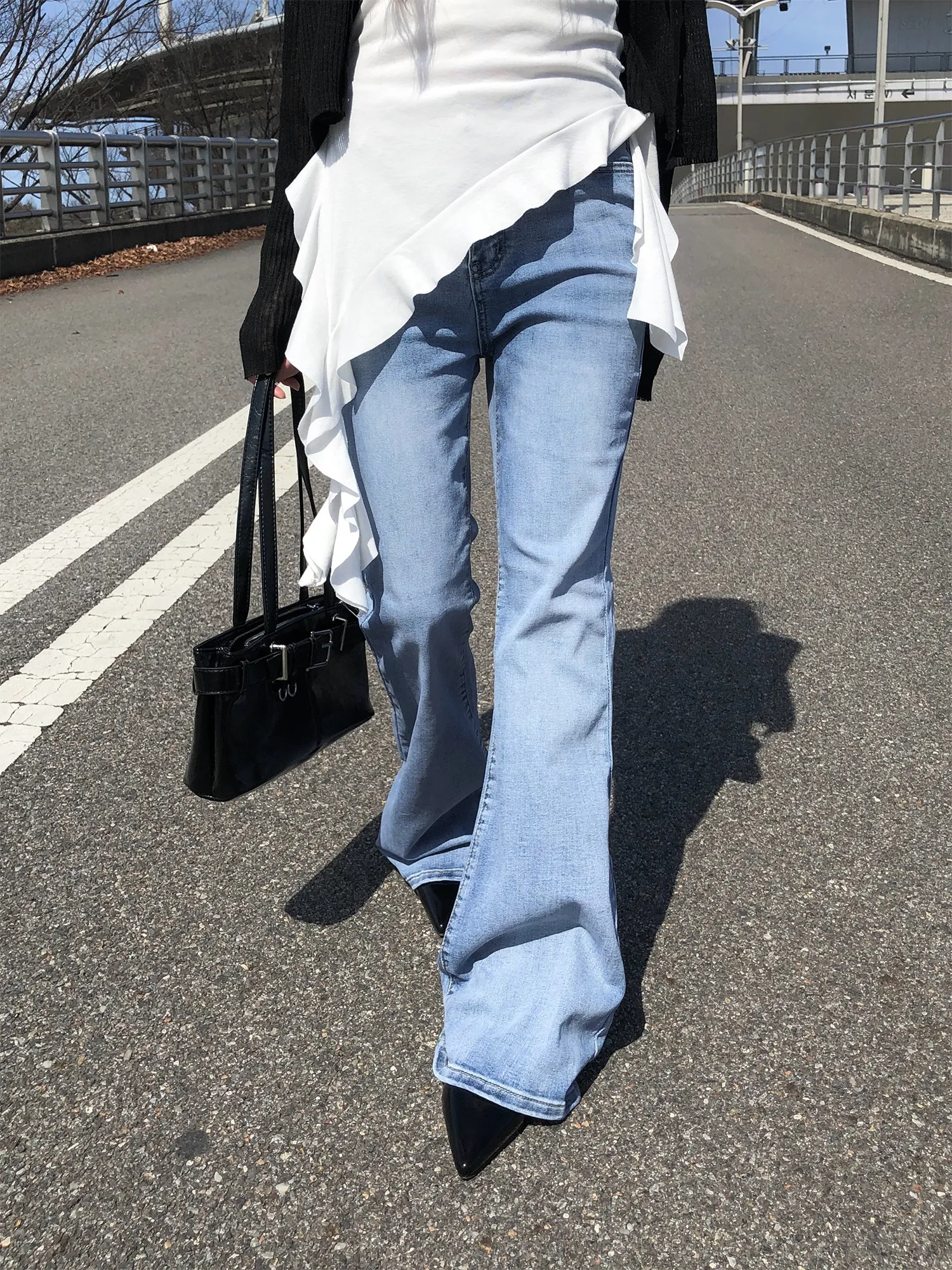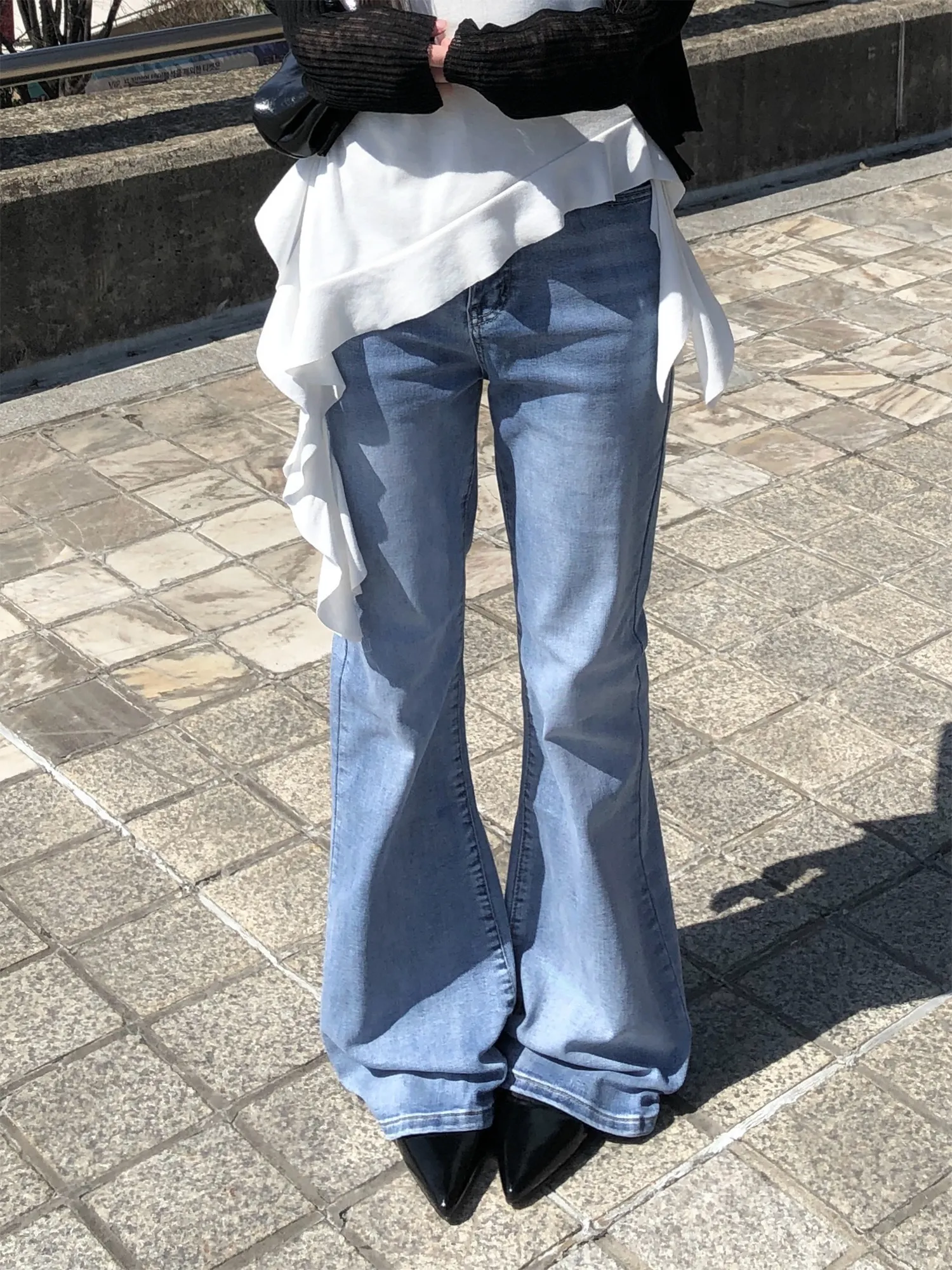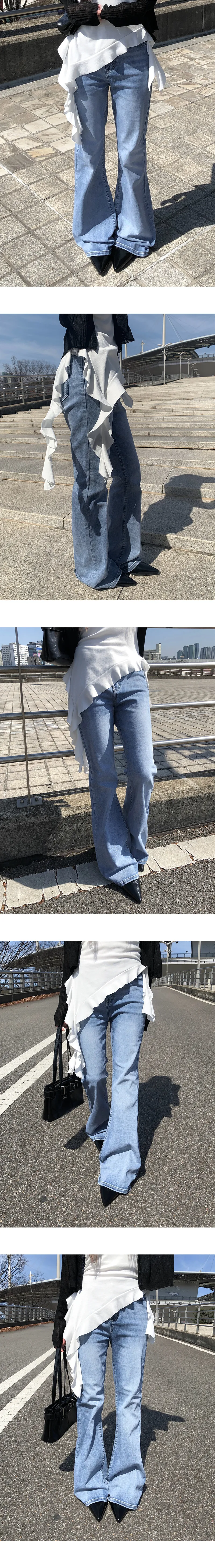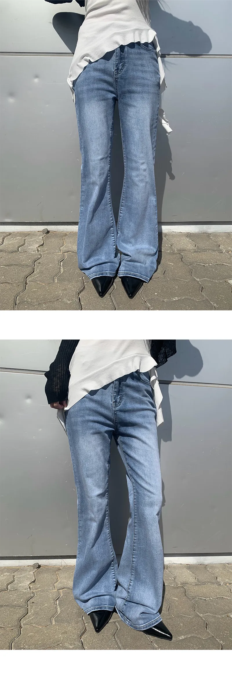 ストレッチデニムジップアップバックルウォッシングポケット骨盤パッドスリムロングフラップポケットリベットループバックポケットブーツカットライトブルーデニムパンツ