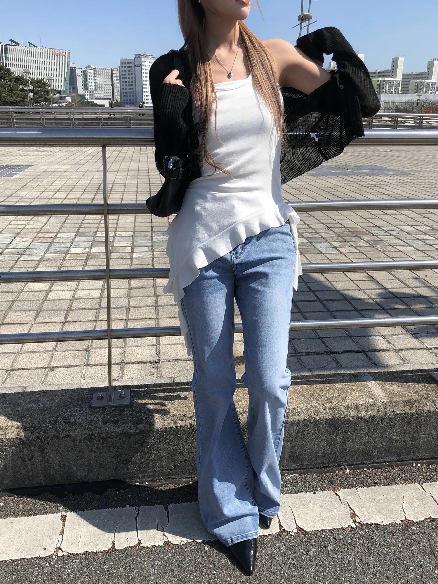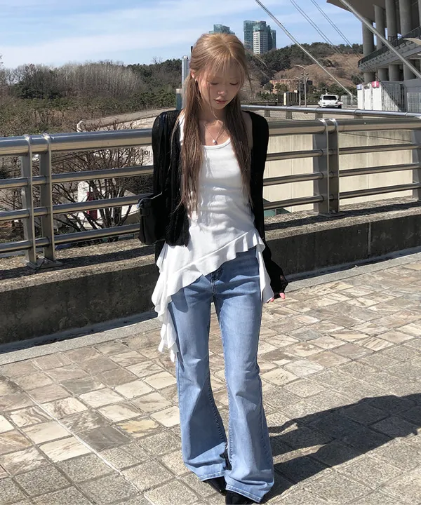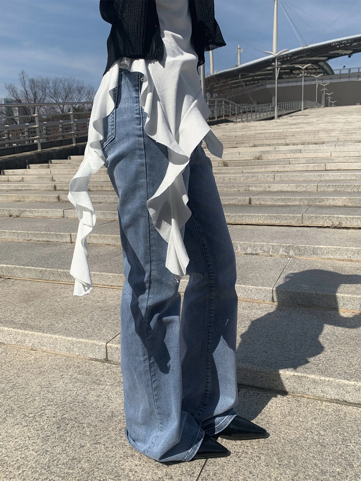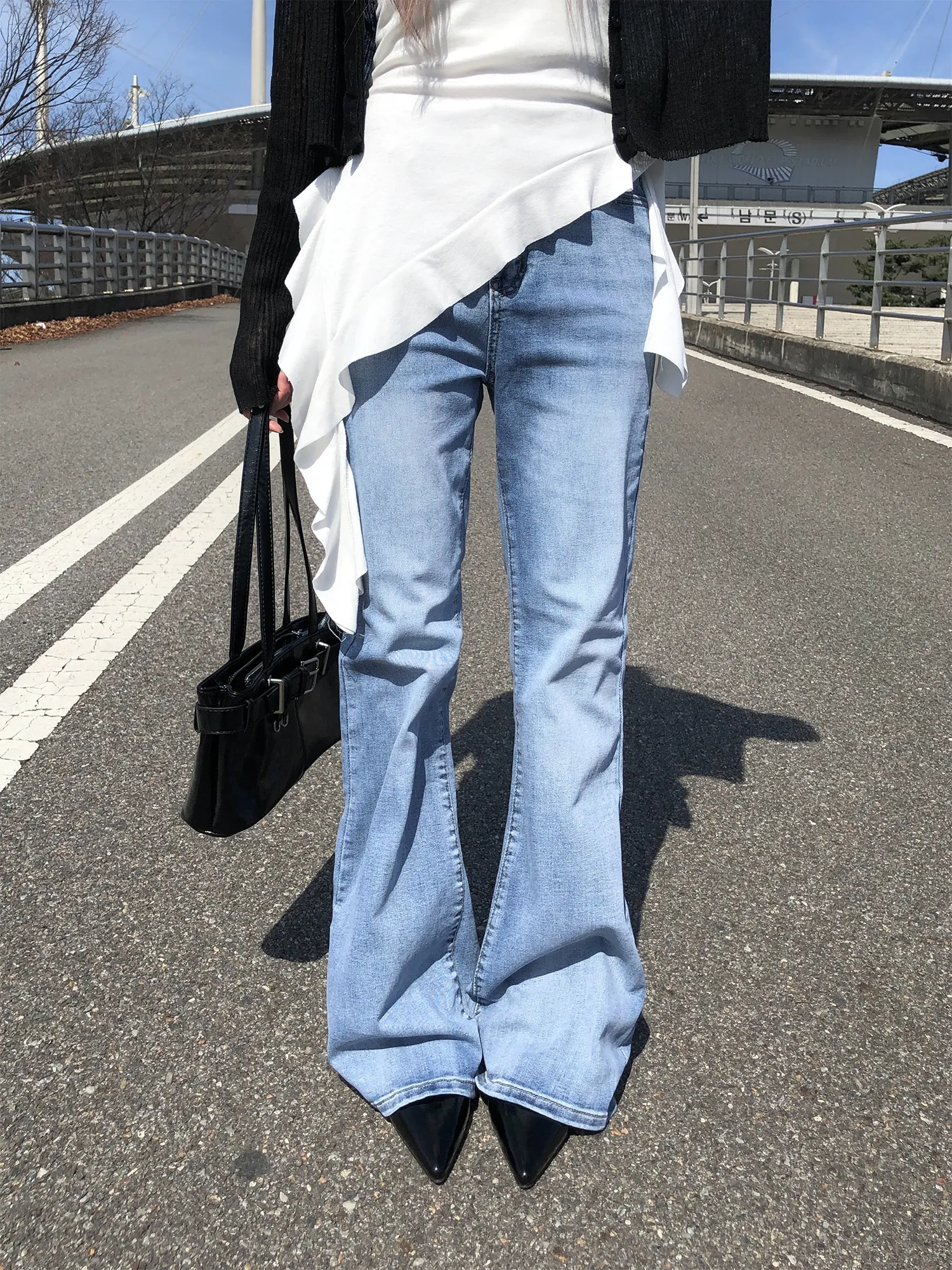 ストレッチデニムジップアップバックルウォッシングポケット骨盤パッドスリムロングフラップポケットリベットループバックポケットブーツカットライトブルーデニムパンツ