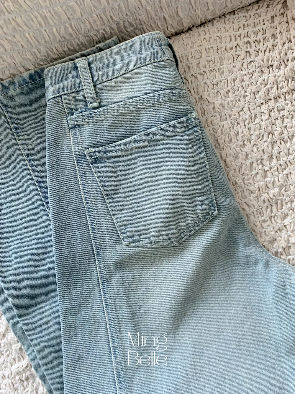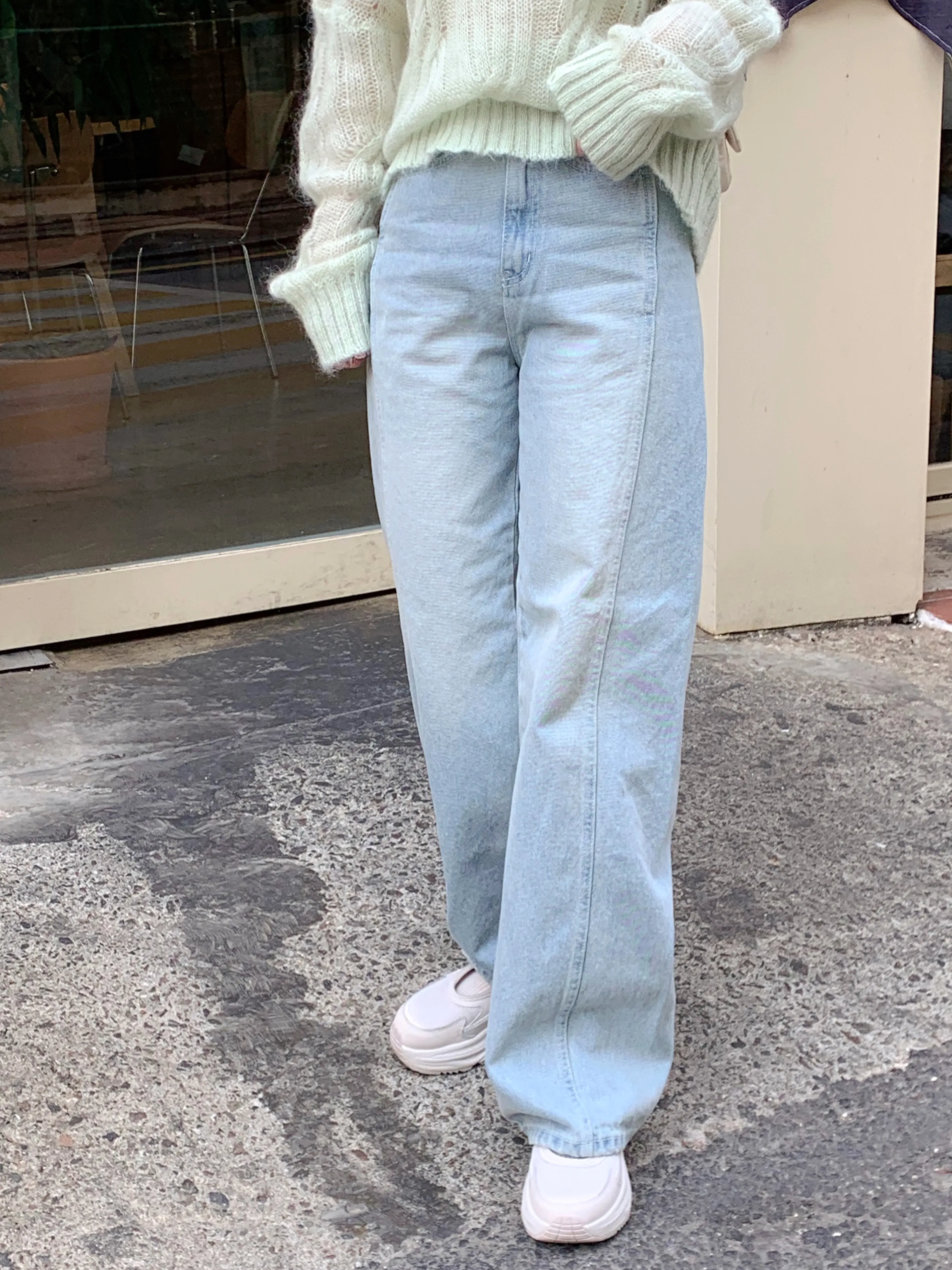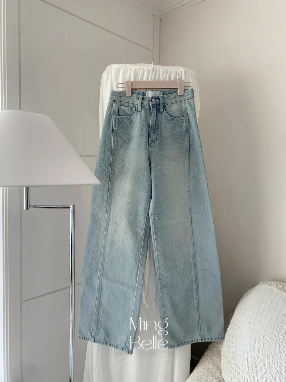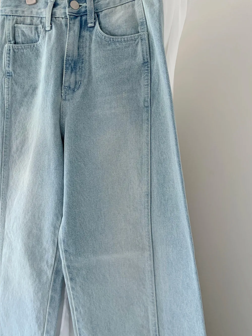 デニムコットンウォッシングポケットリベットバックポケットストレートワイドジップアップバックルループヒドゥンバンディングライトブルーディープブルーデニムパンツ[選べる丈]