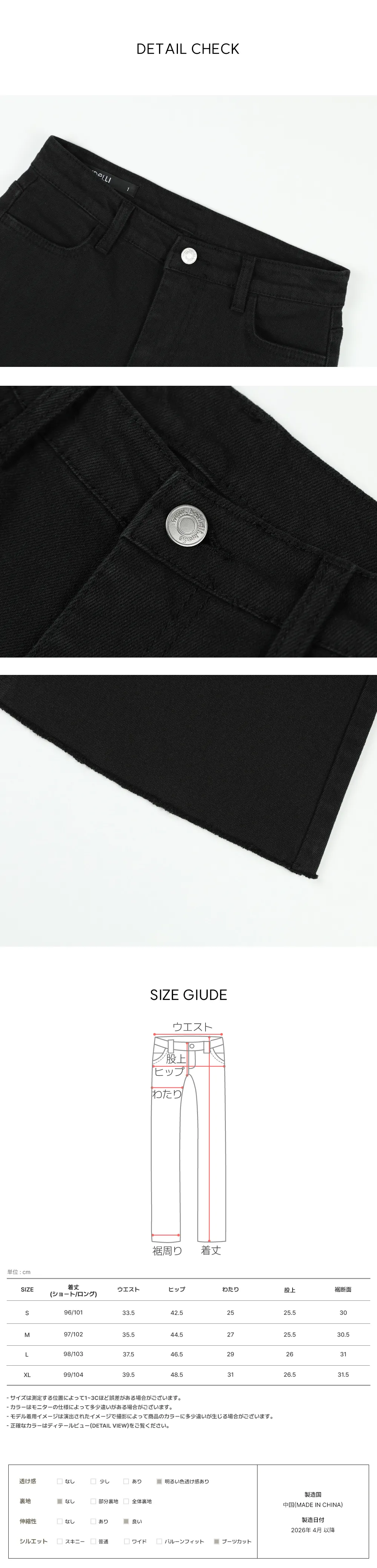 | Size | ウエスト | ヒップ | 裾幅 | わたり | 股上 | 着丈 |