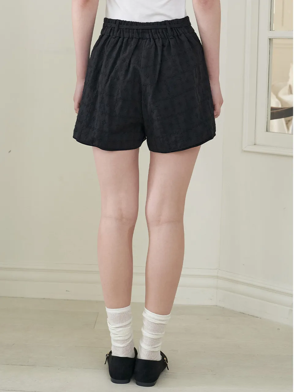 - ウエスト後ろゴム仕様で、快適な着脱を実現