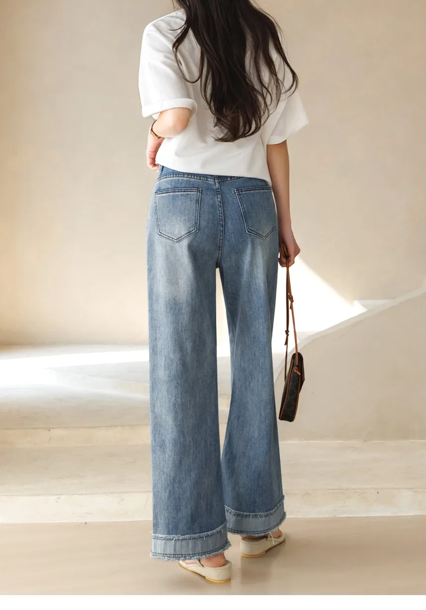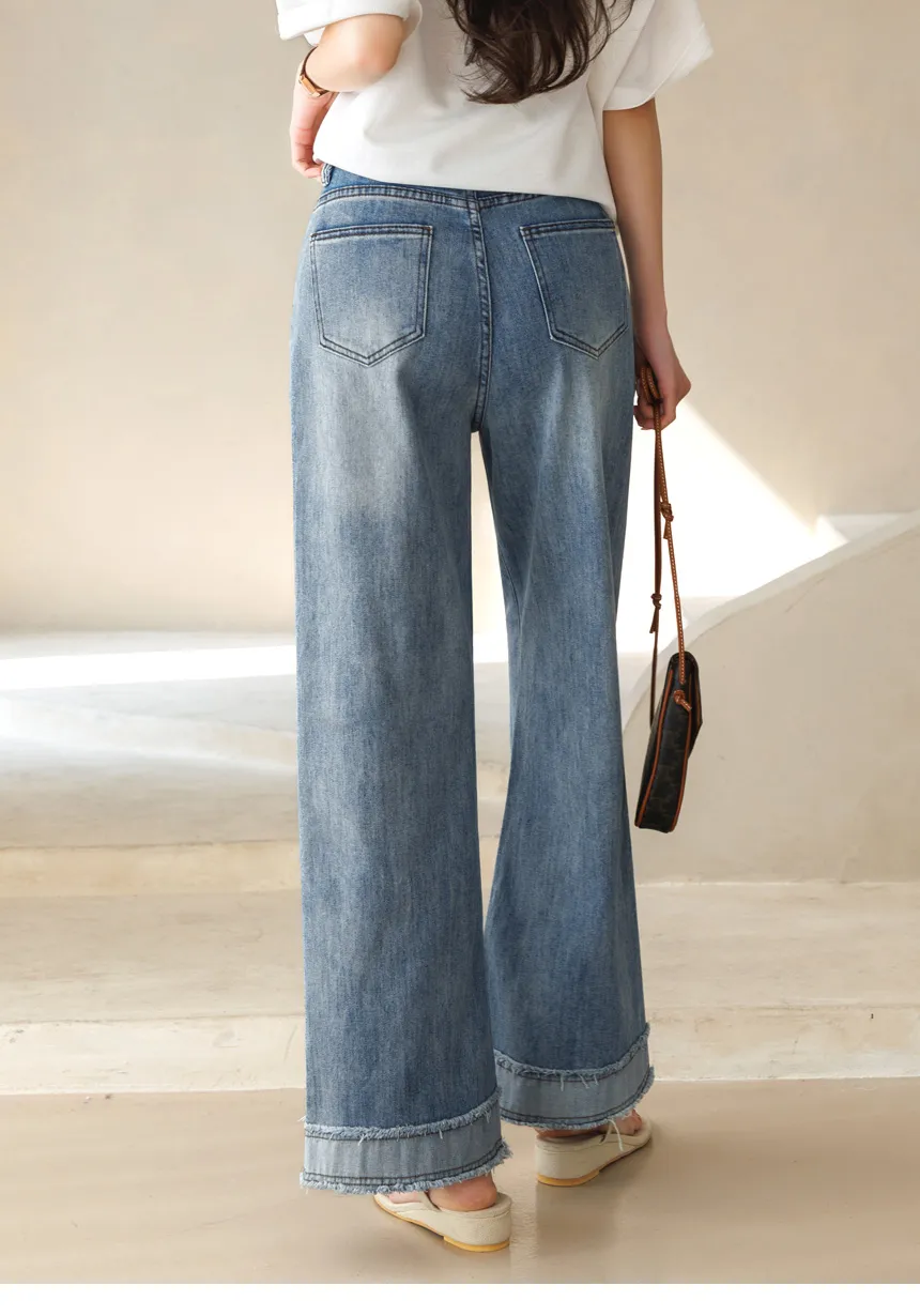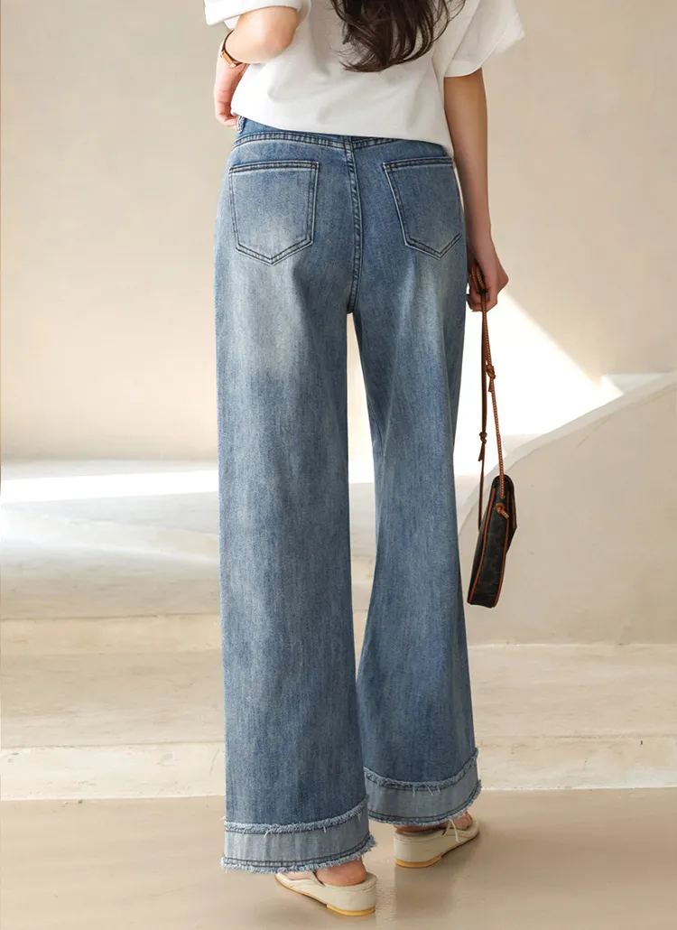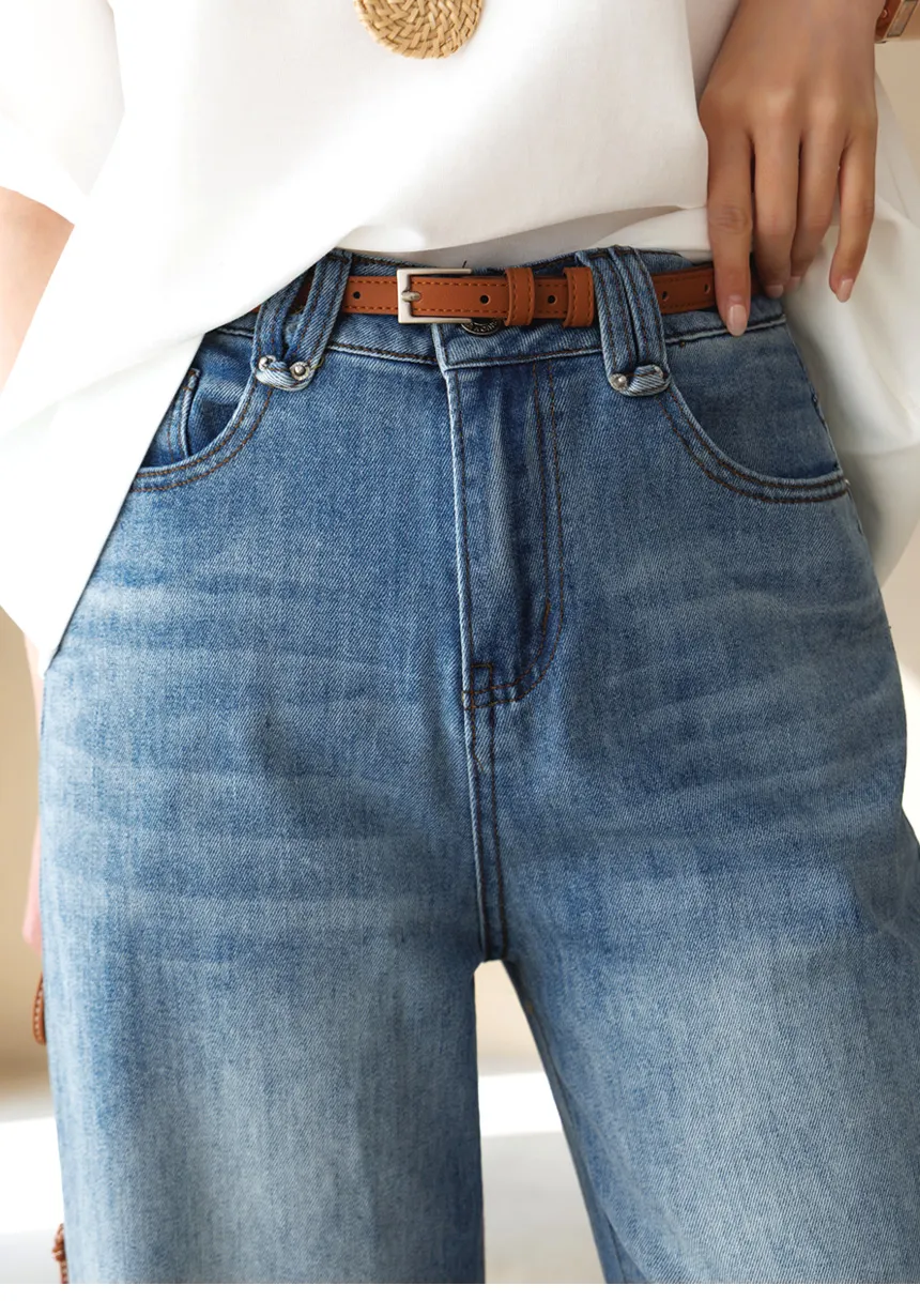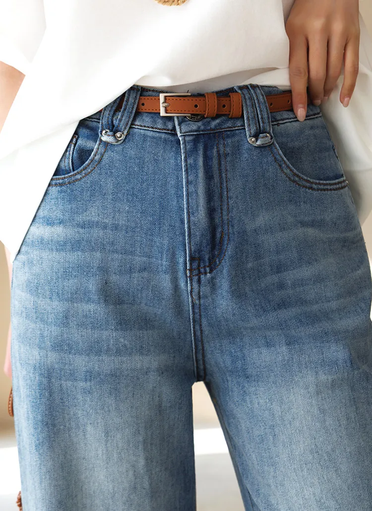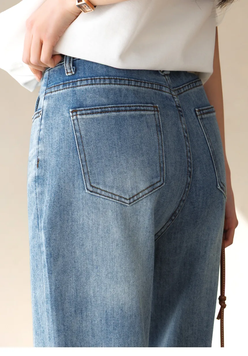 デニムコットンウォッシングポケットリベットバックポケットストレートワイドジップアップバックルループヒドゥンバンディングライトブルーディープブルーデニムパンツ[選べる丈]