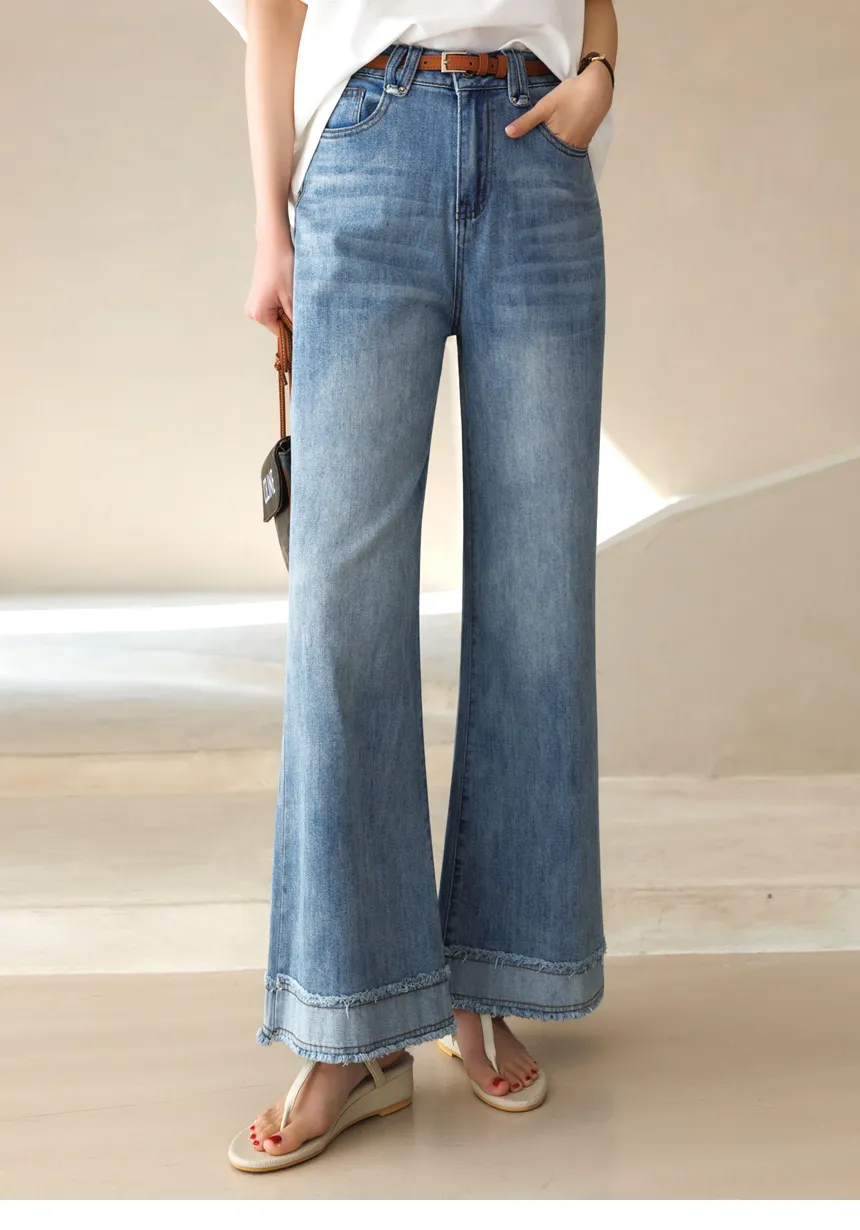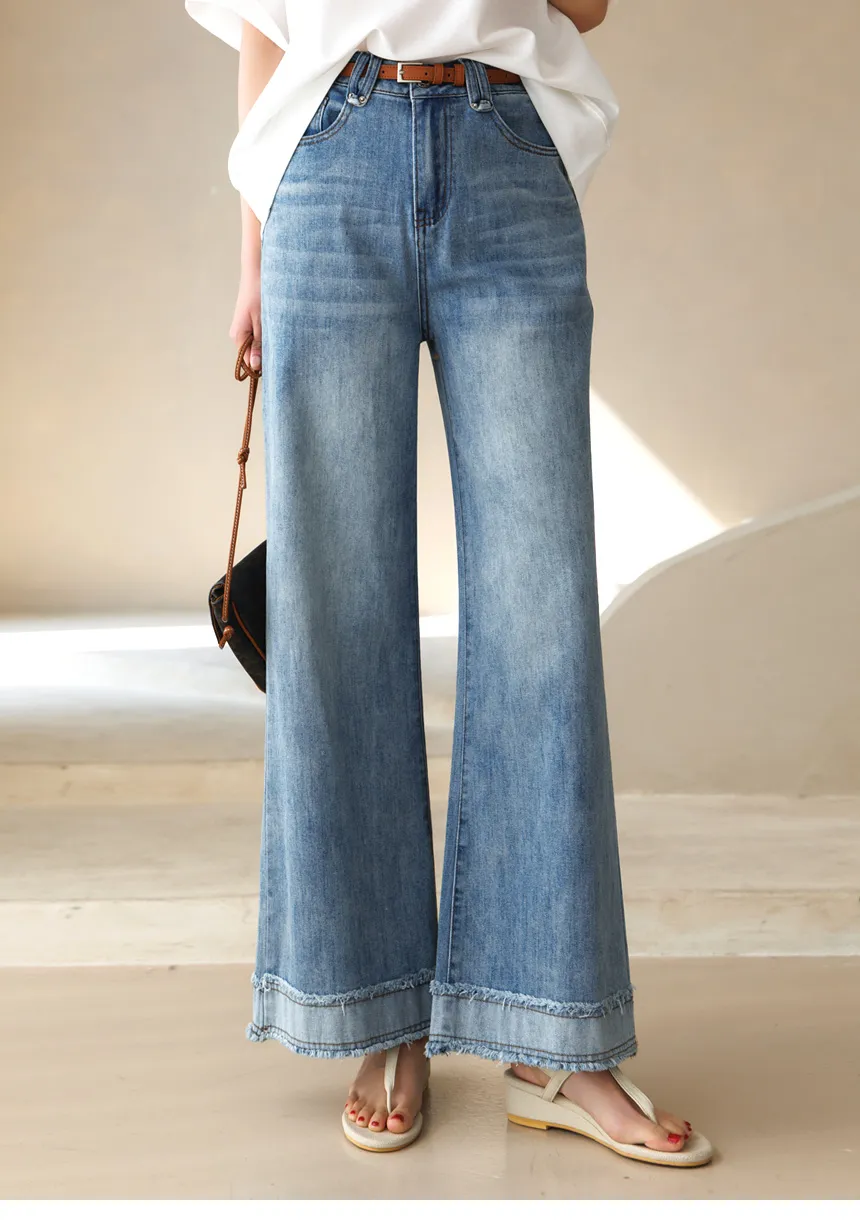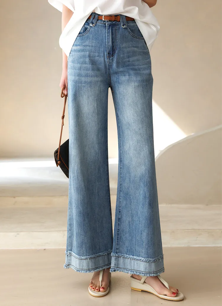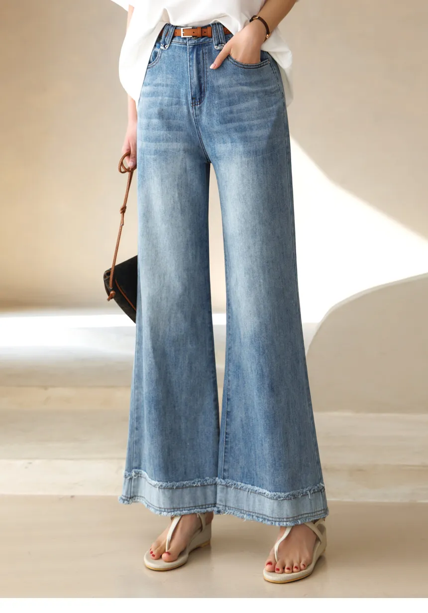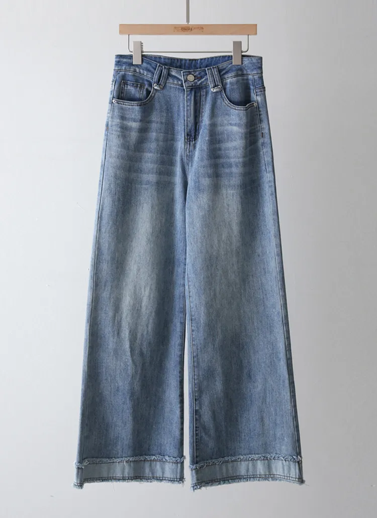 デニムコットンウォッシングポケットリベットバックポケットストレートワイドジップアップバックルループヒドゥンバンディングライトブルーディープブルーデニムパンツ[選べる丈]