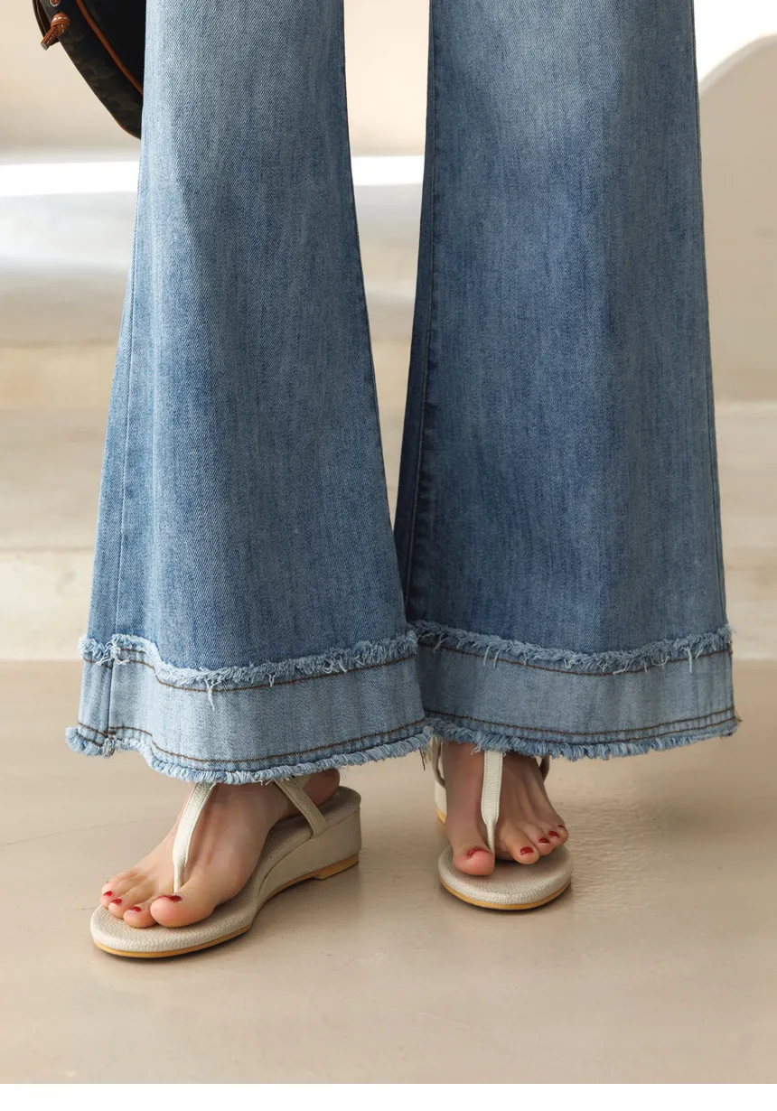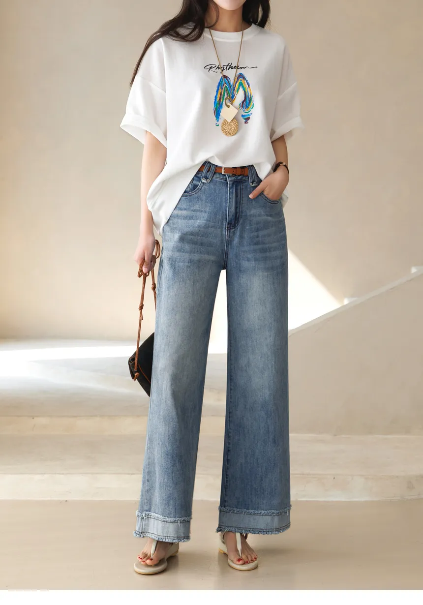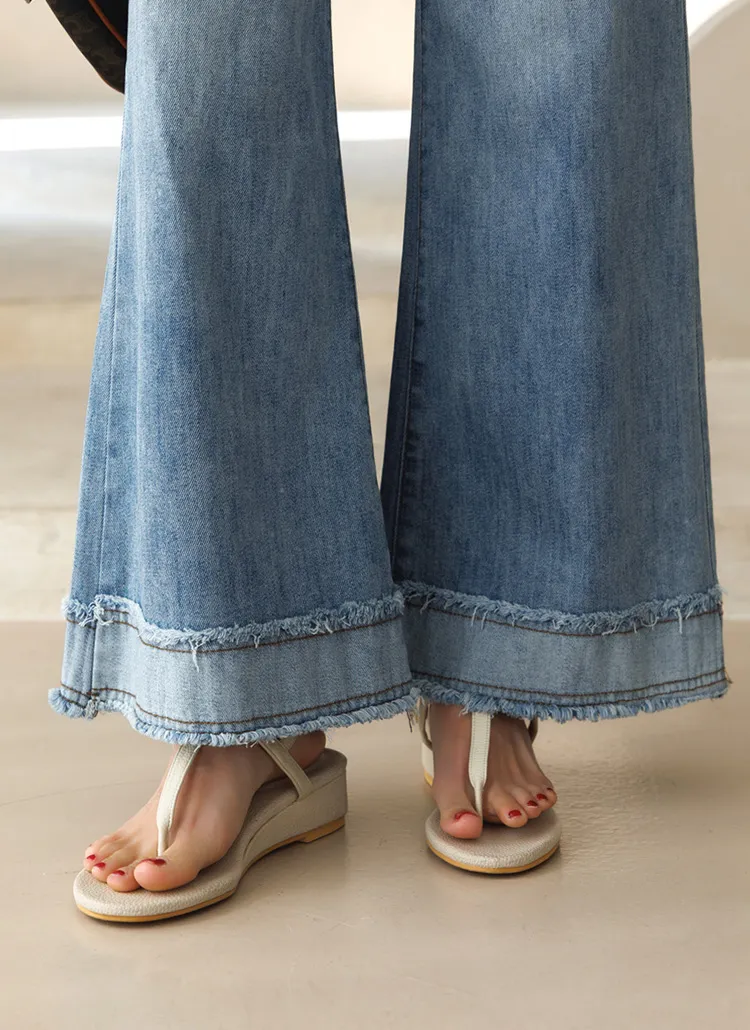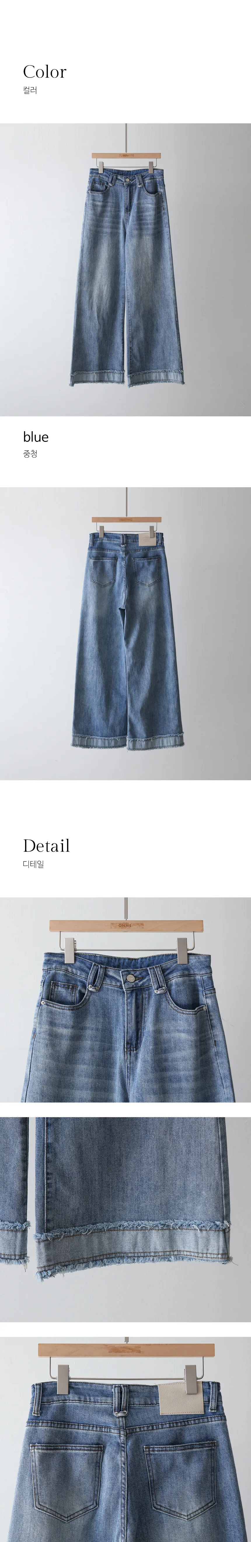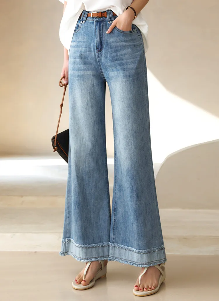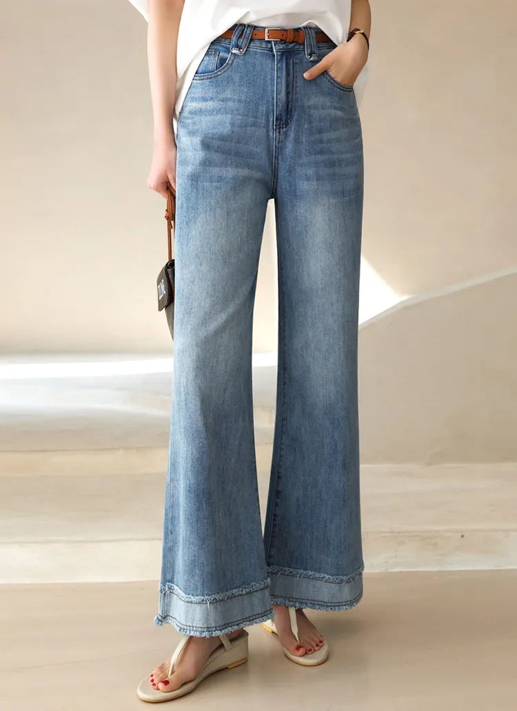 デニムコットンウォッシングポケットリベットバックポケットストレートワイドジップアップバックルループヒドゥンバンディングライトブルーディープブルーデニムパンツ[選べる丈]