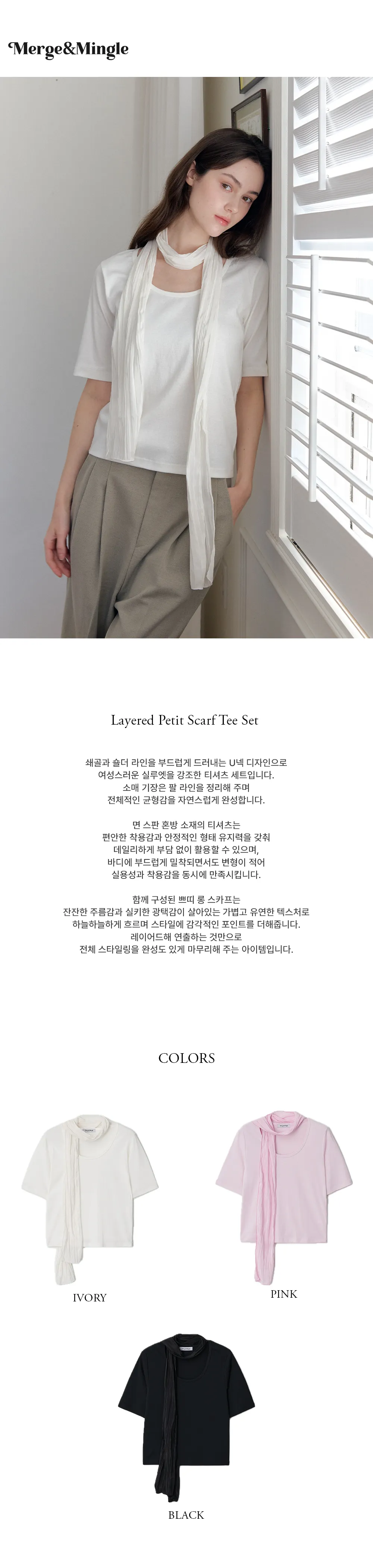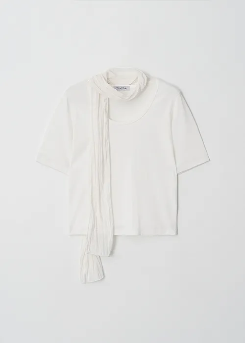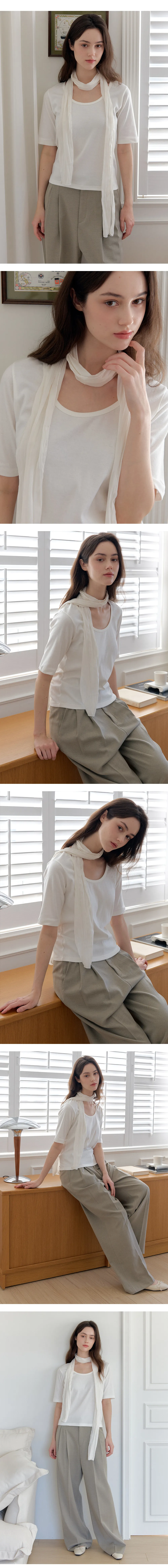 セットのスカーフは、繊細なプリーツ感とほんのりとしたシルクのような光沢が魅力の軽やかな素材。さっと重ねるだけで、スタイリングに奥行きと上品さをプラスし、コーディネートをぐっと引き締めてくれます。