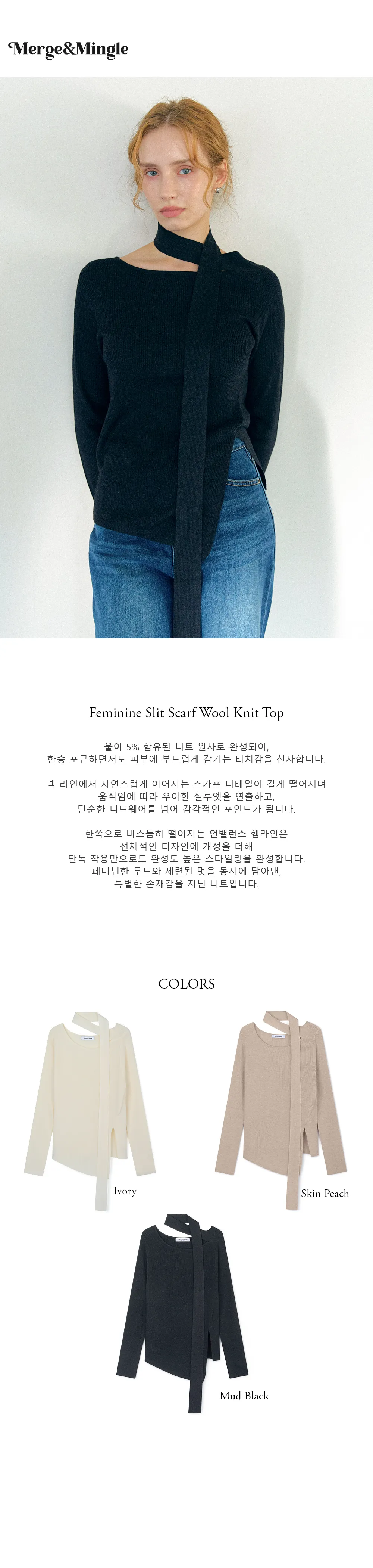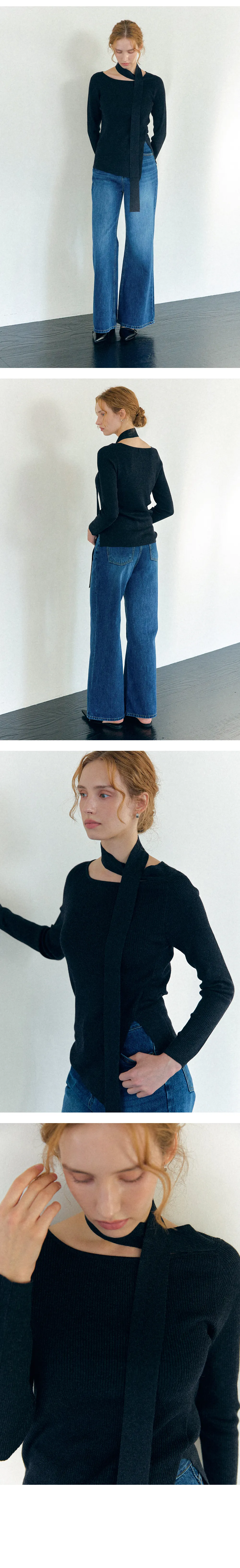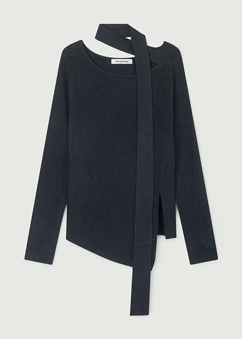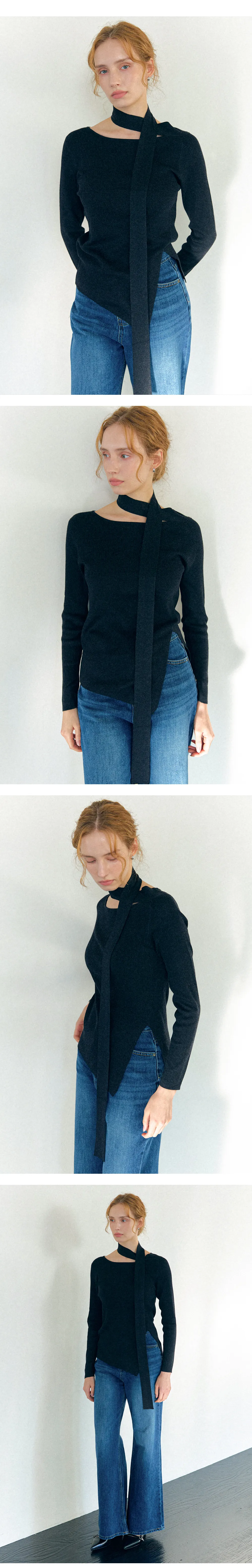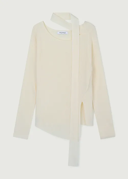 ネックラインから自然につながるスカーフディテールが美しく流れ、動くたびに優雅なシルエットを演出。シンプルなニットに洗練されたアクセントを添えます。