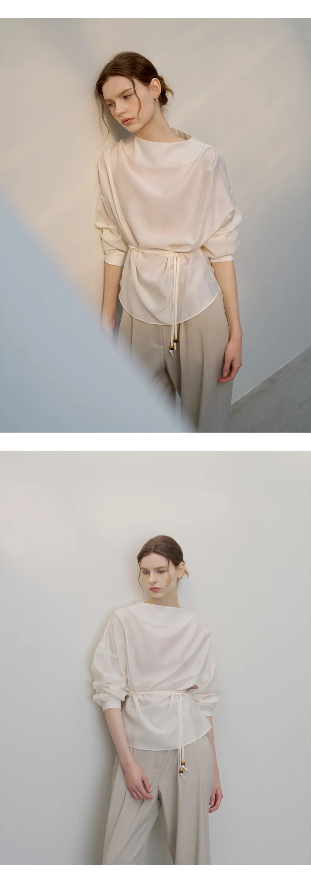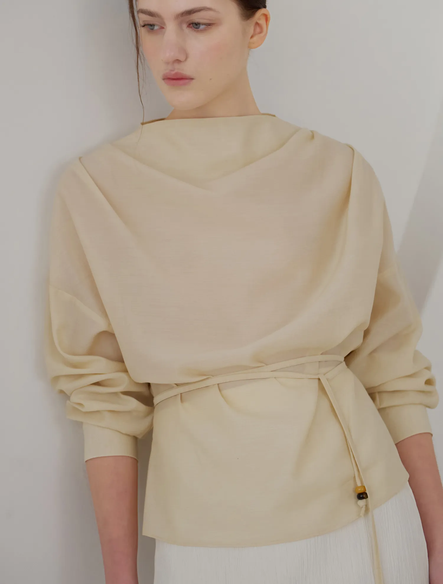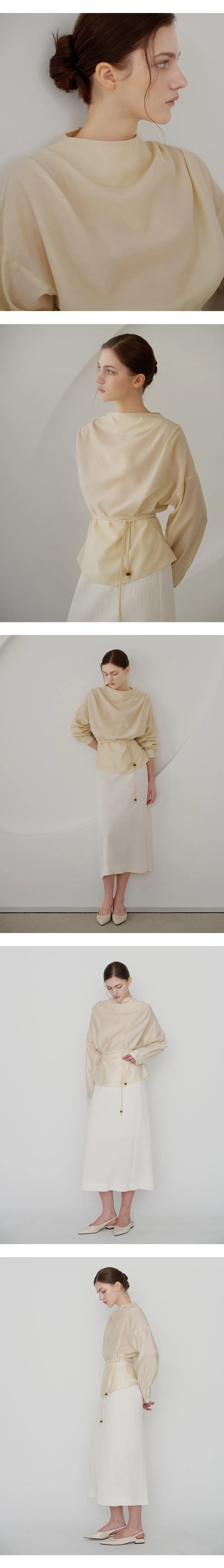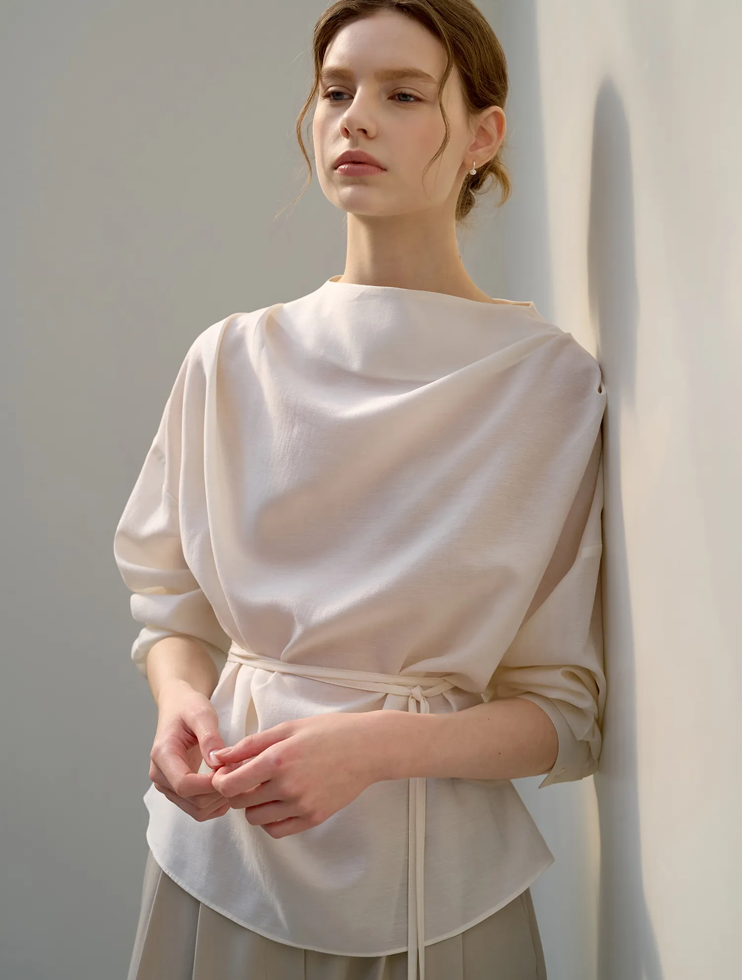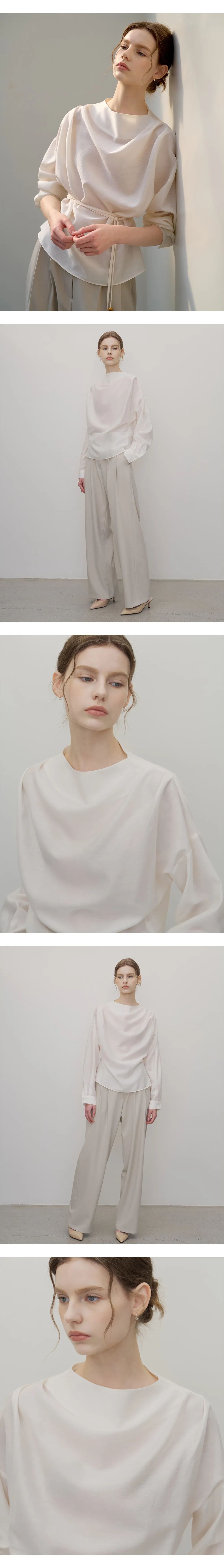 首元に沿って自然に流れるドレープシルエットが、フェミニンでエレガントなムードを引き立てるブラウスです。