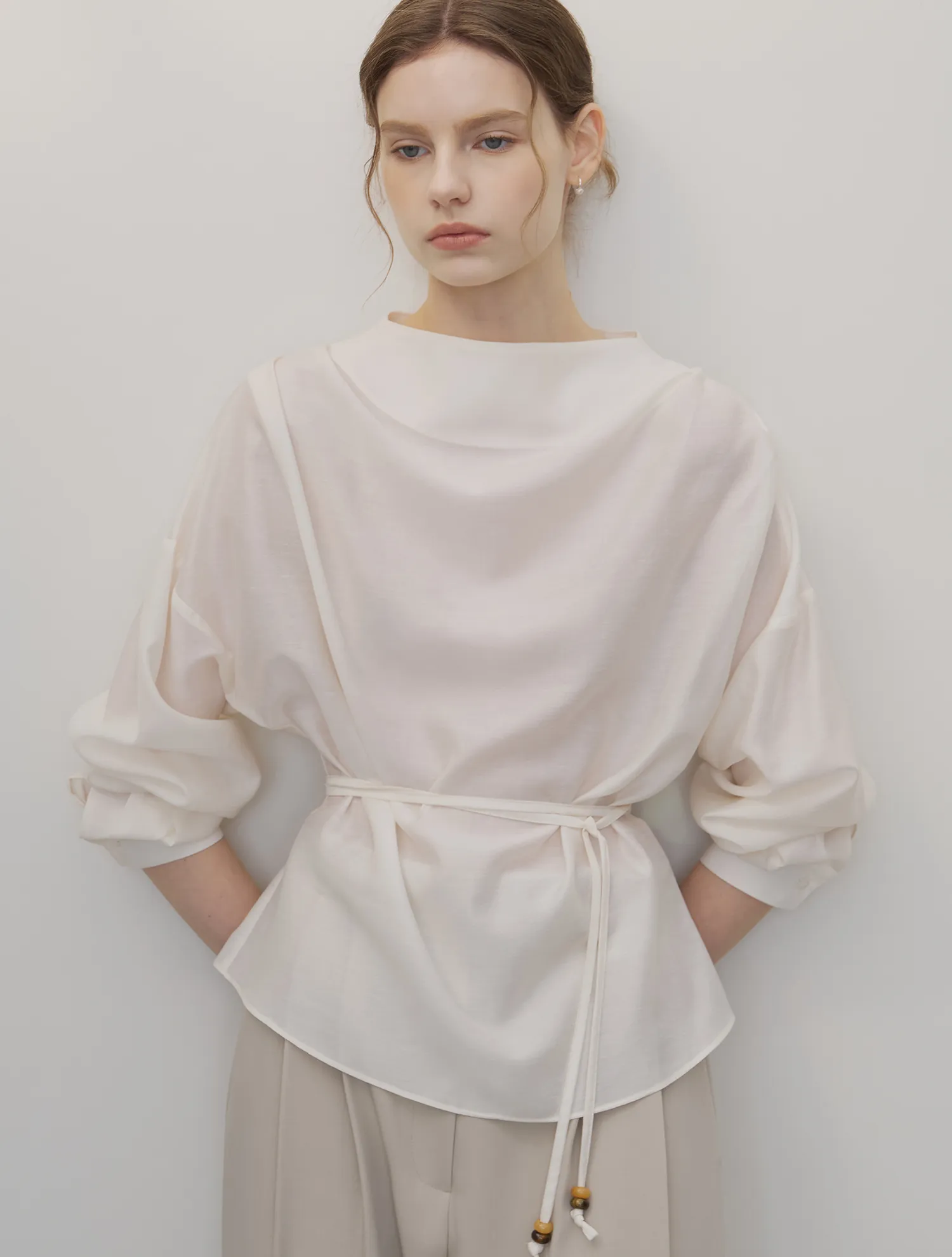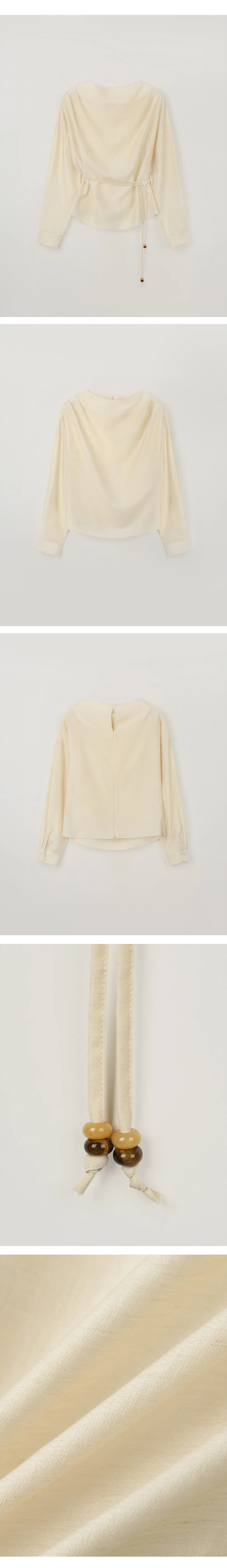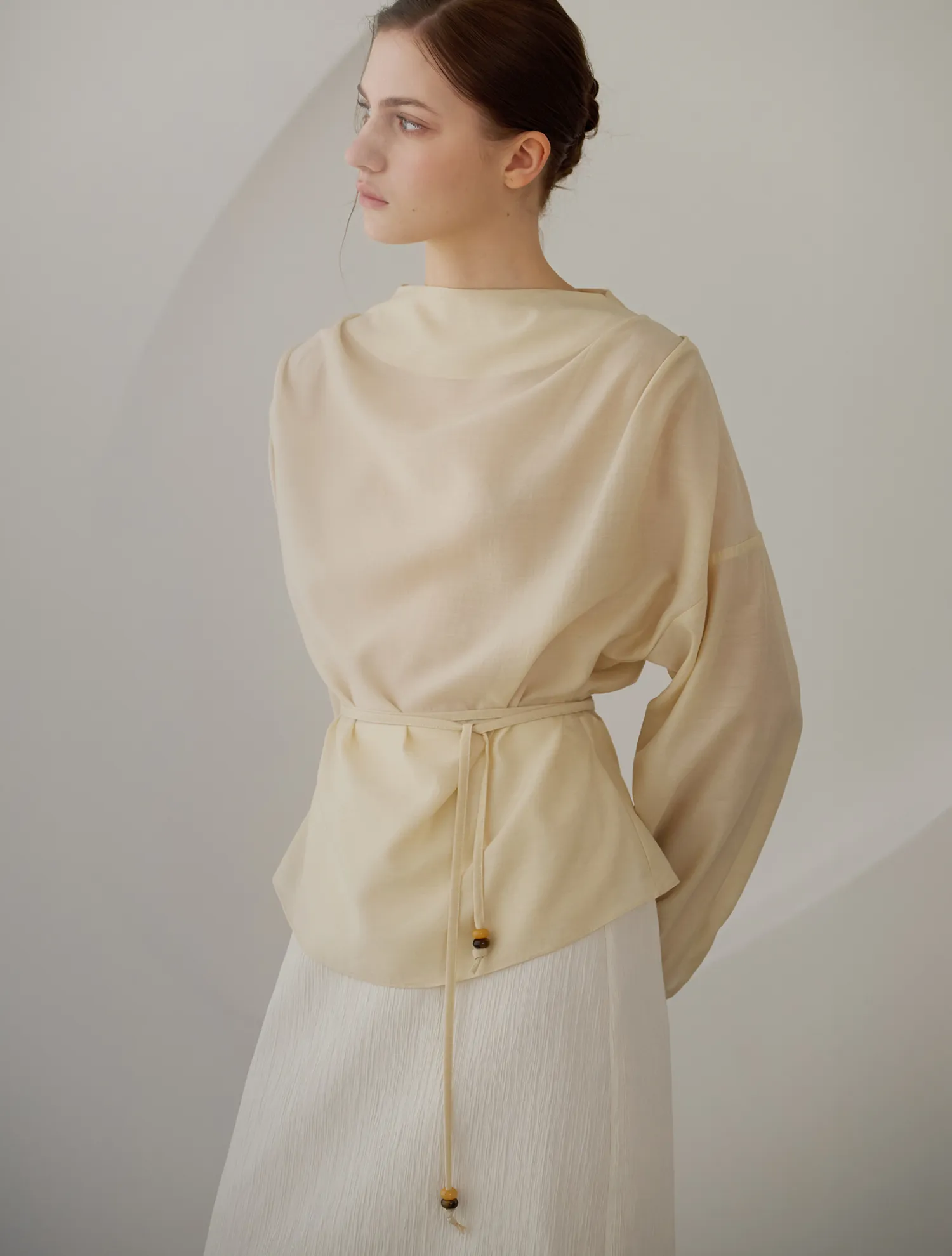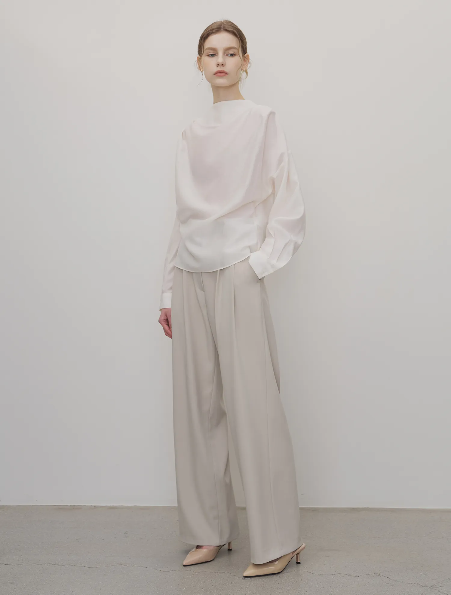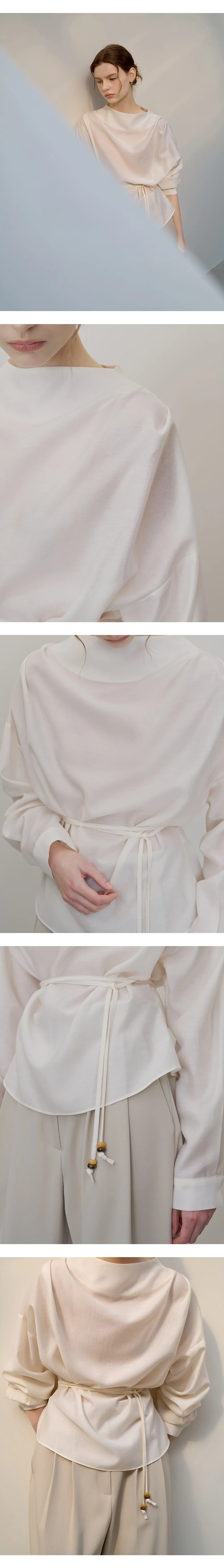 首元に沿って自然に流れるドレープシルエットが、フェミニンでエレガントなムードを引き立てるブラウスです。