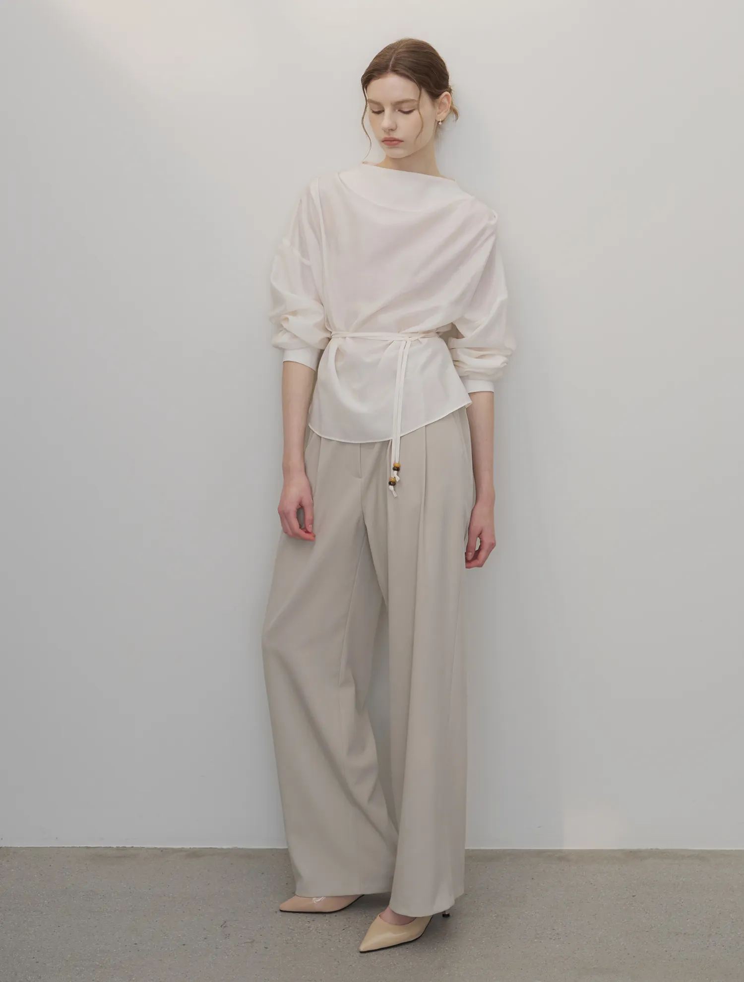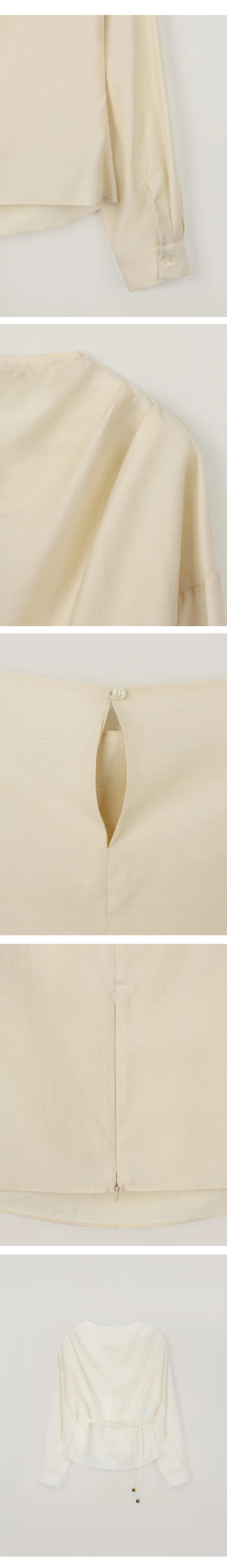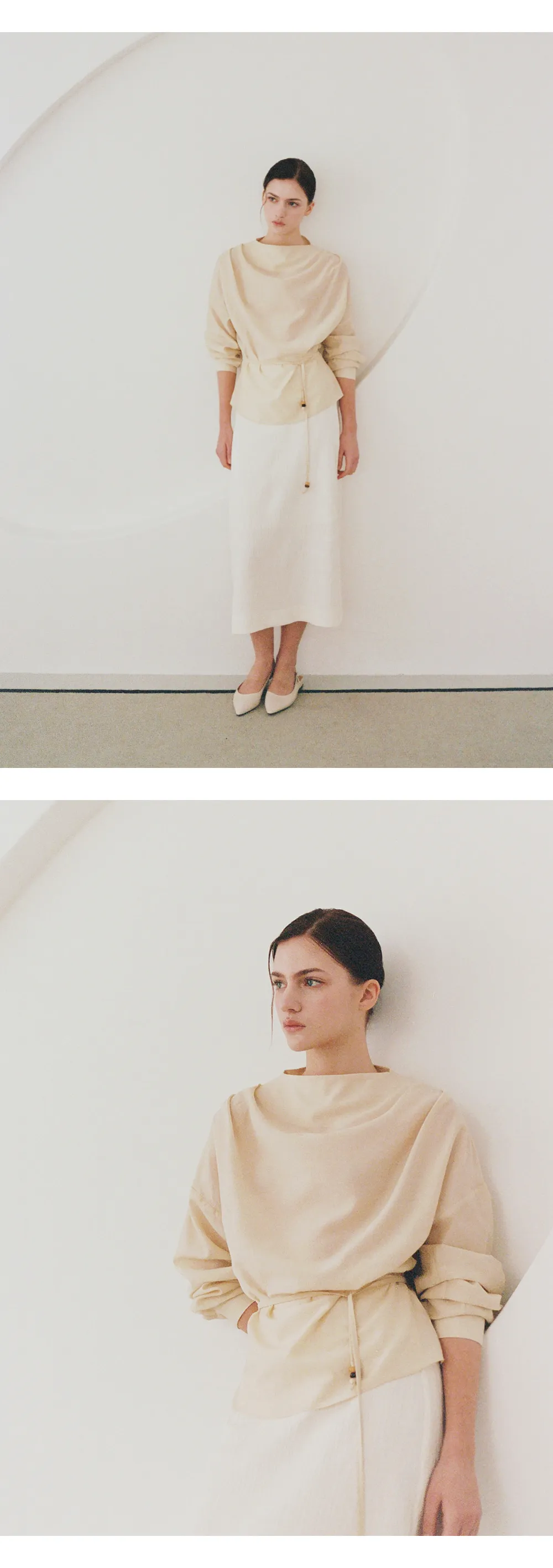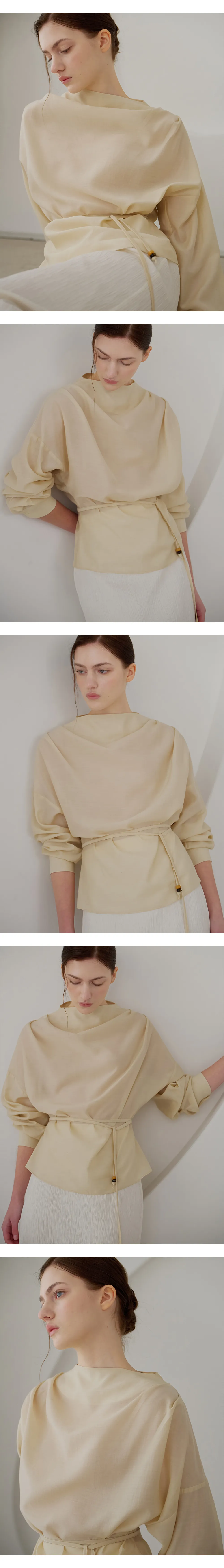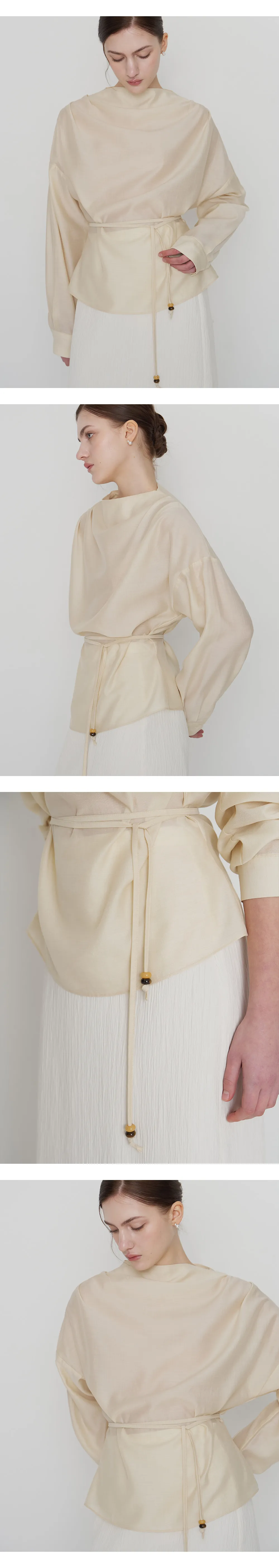 首元に沿って自然に流れるドレープシルエットが、フェミニンでエレガントなムードを引き立てるブラウスです。