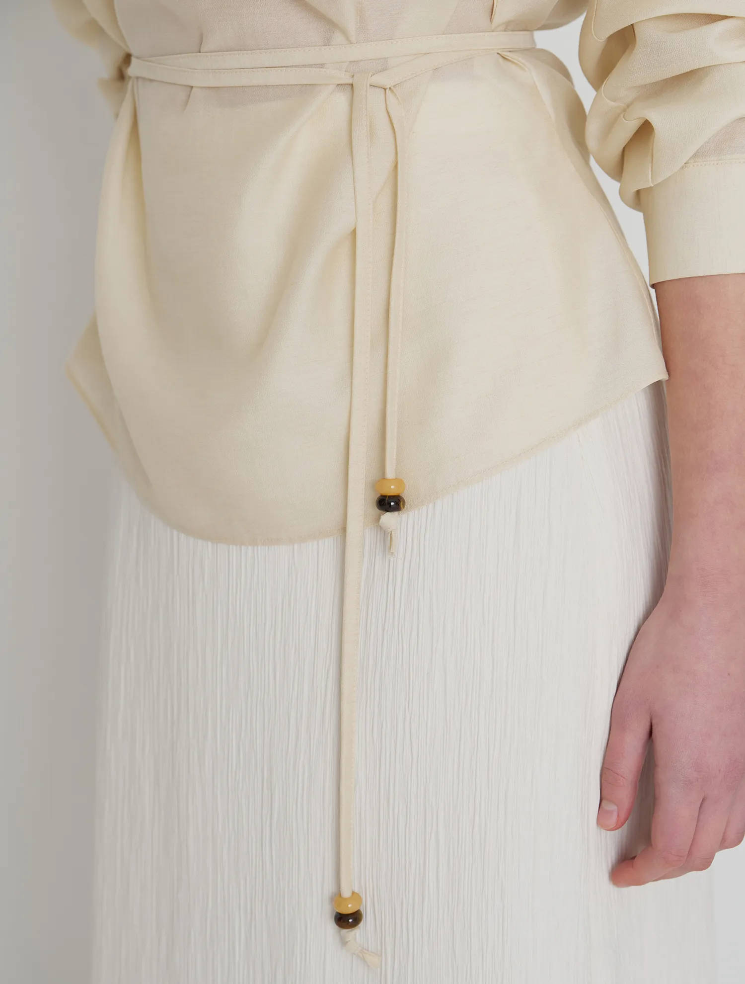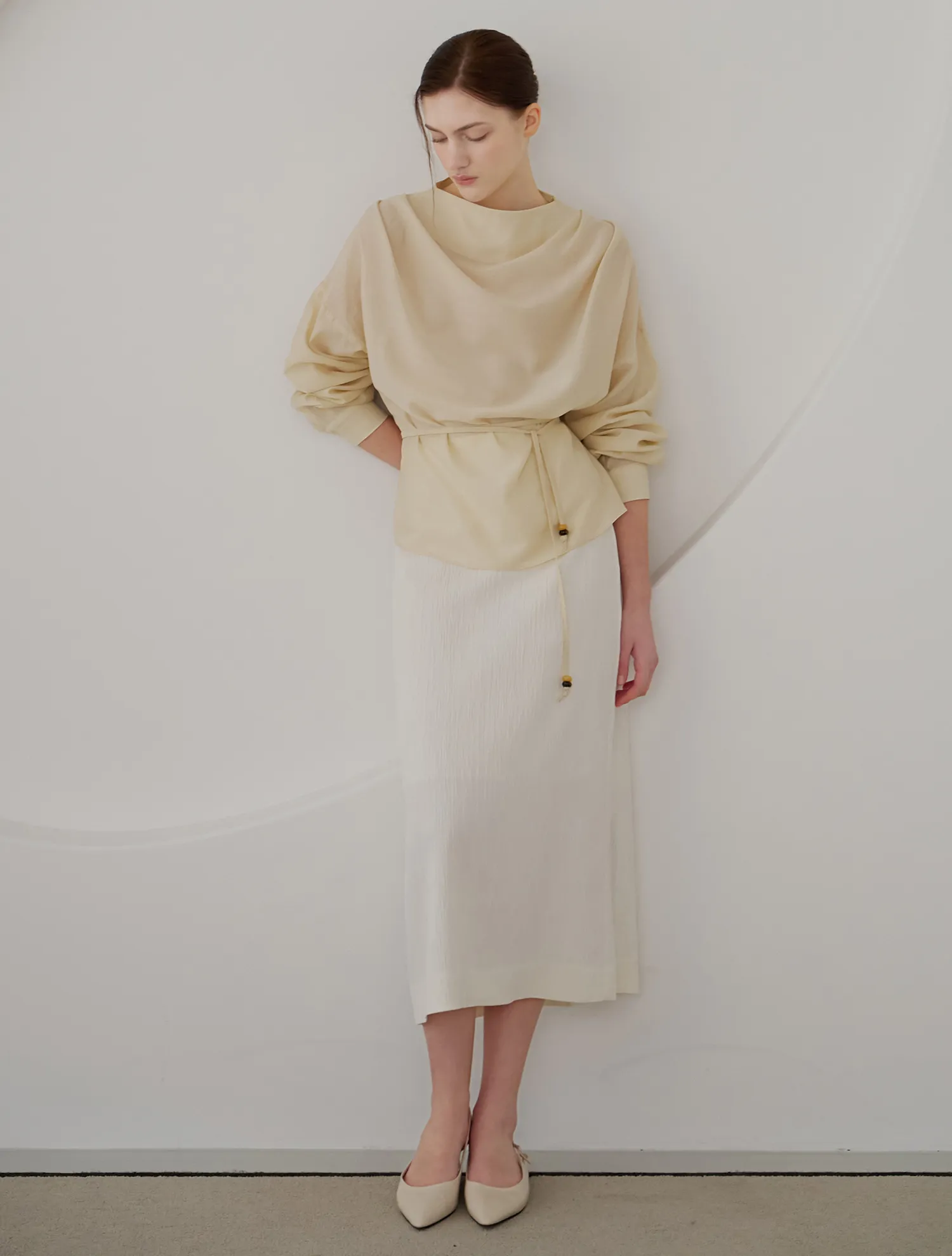 - シアーなテクスチャー素材で、動きに合わせて繊細で柔らかなドレープ感を演出