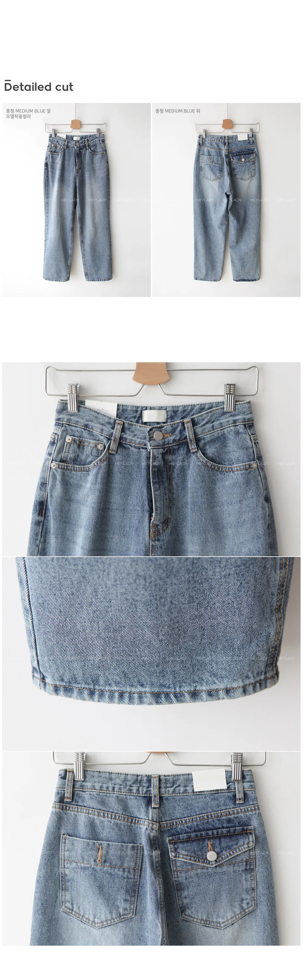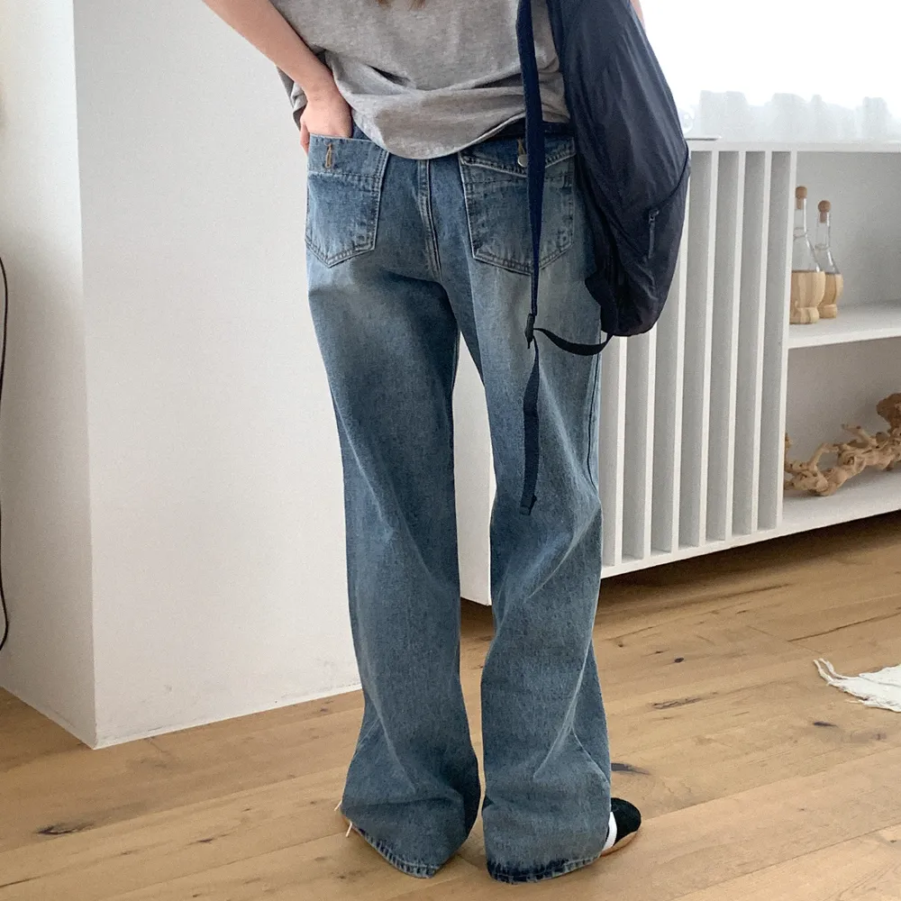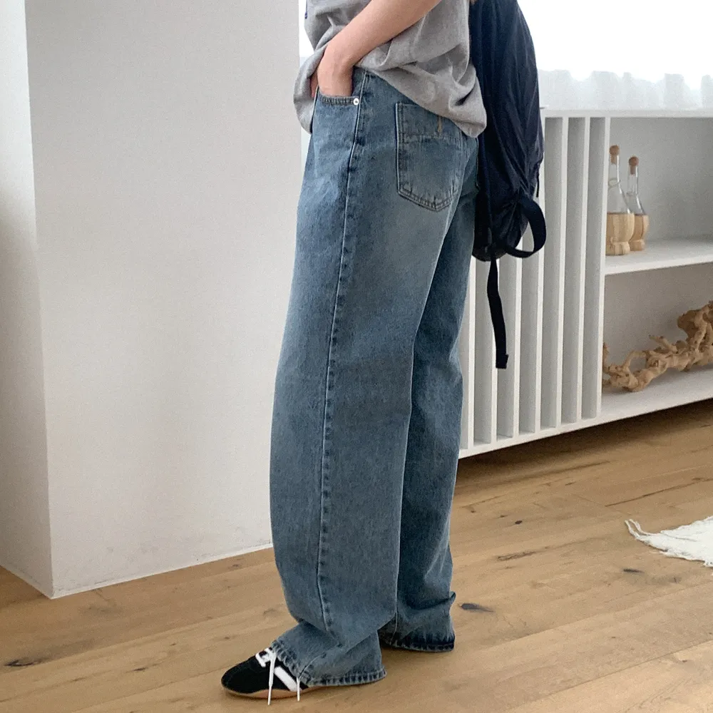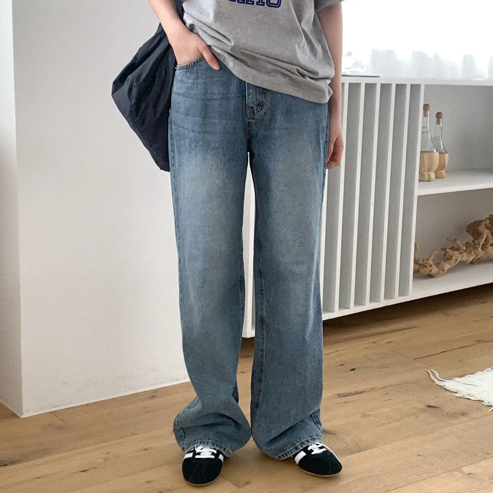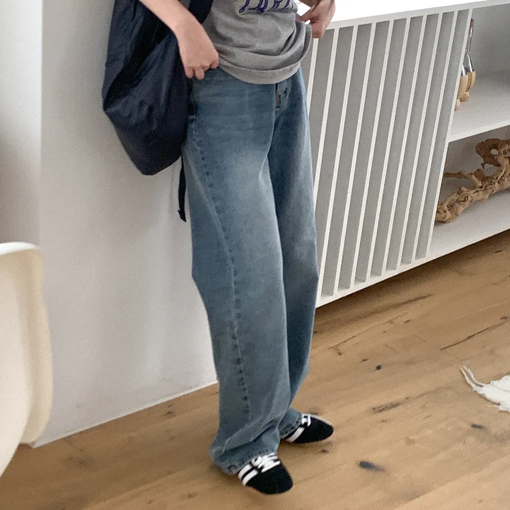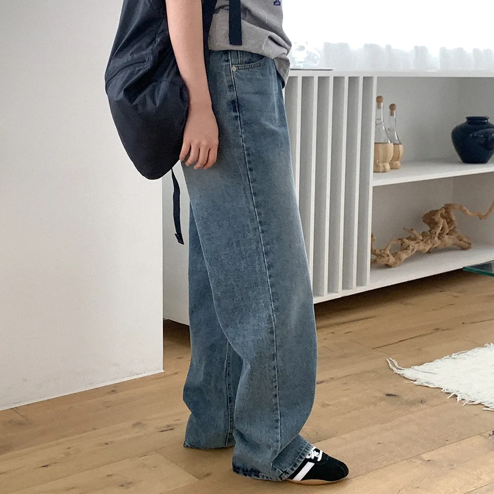 デニムコットンウォッシングポケットリベットバックポケットストレートワイドジップアップバックルループヒドゥンバンディングライトブルーディープブルーデニムパンツ[選べる丈]