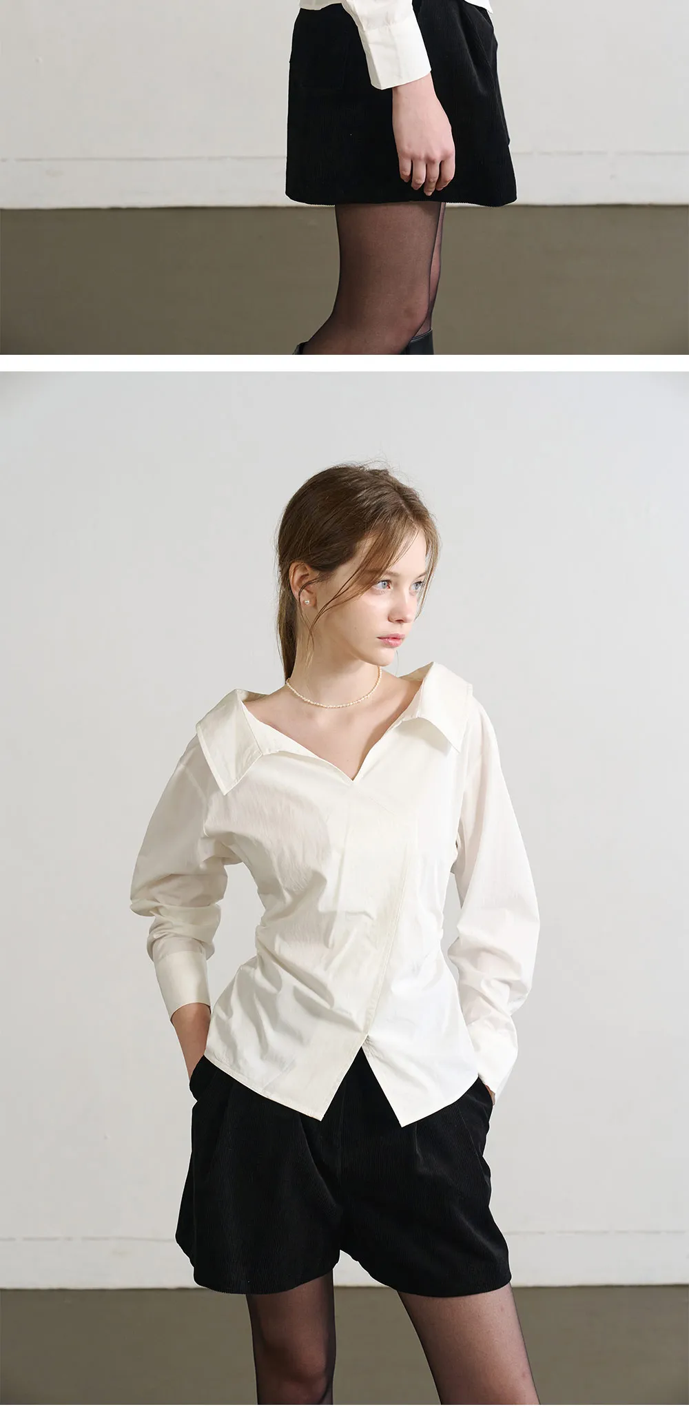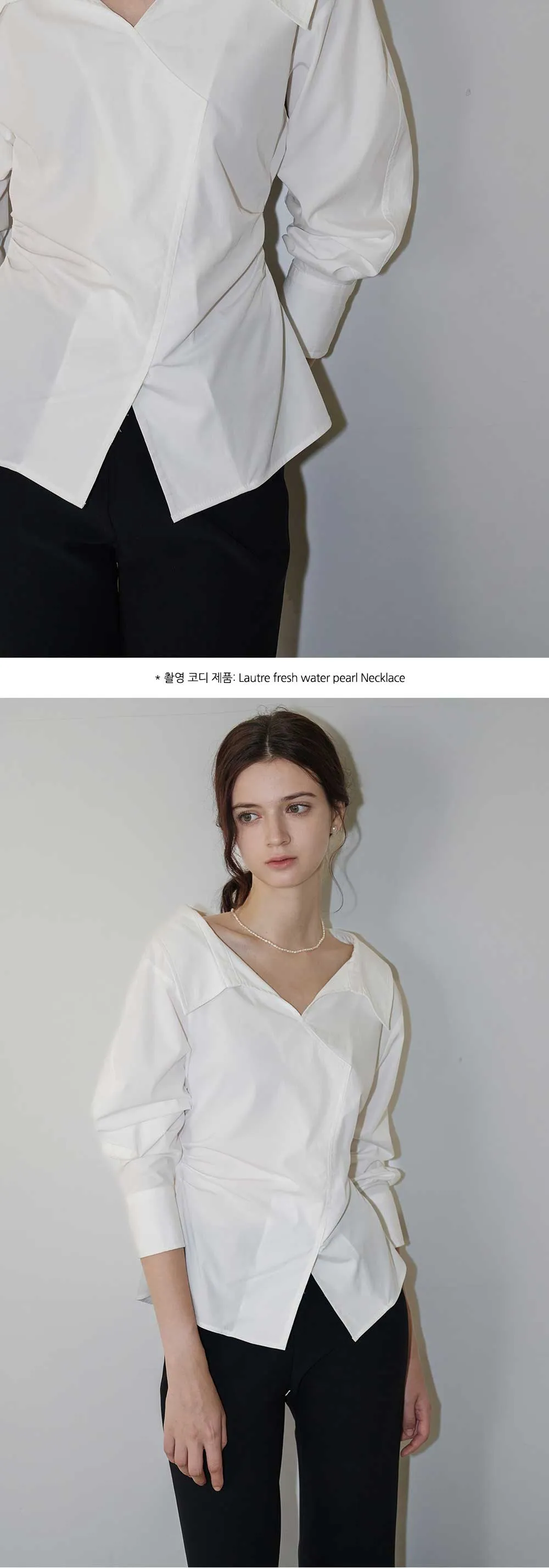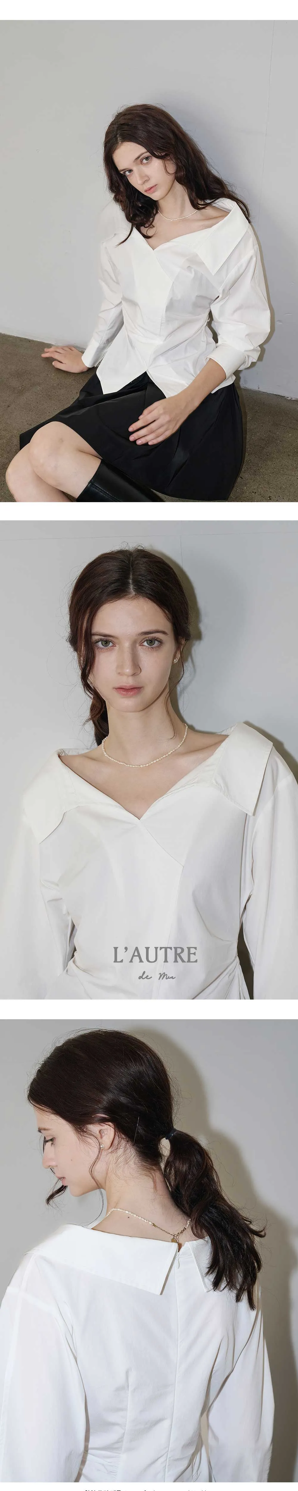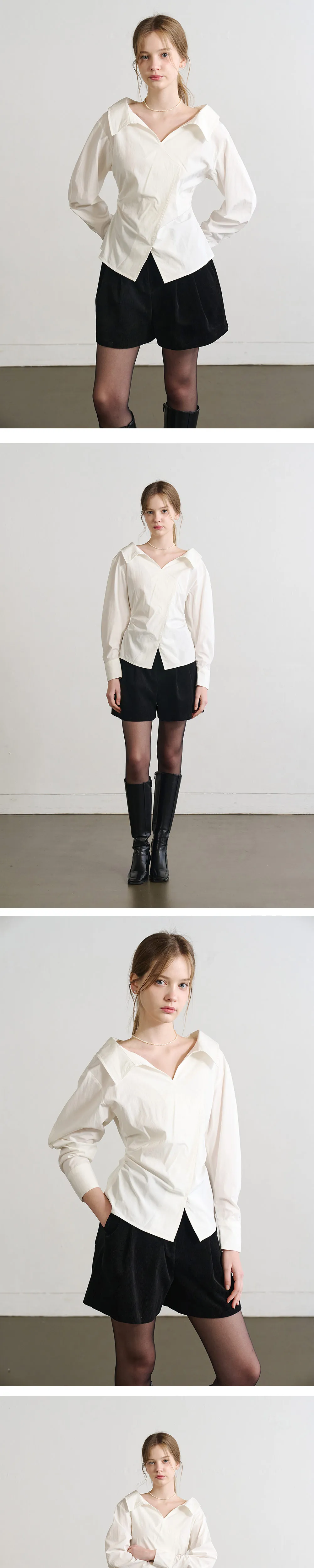 やわらかなネックラインが特徴のホワイトシャツ。