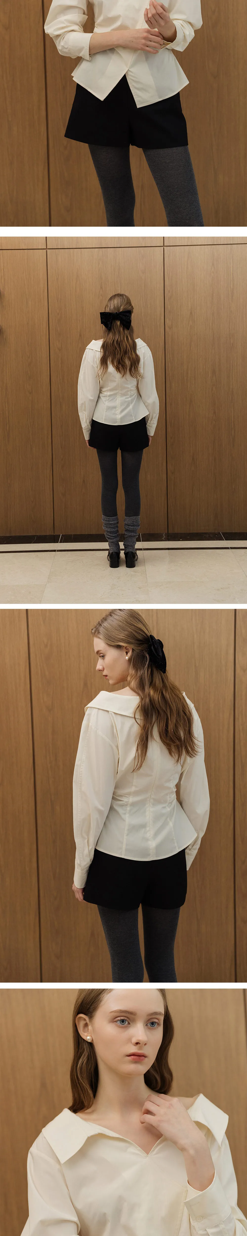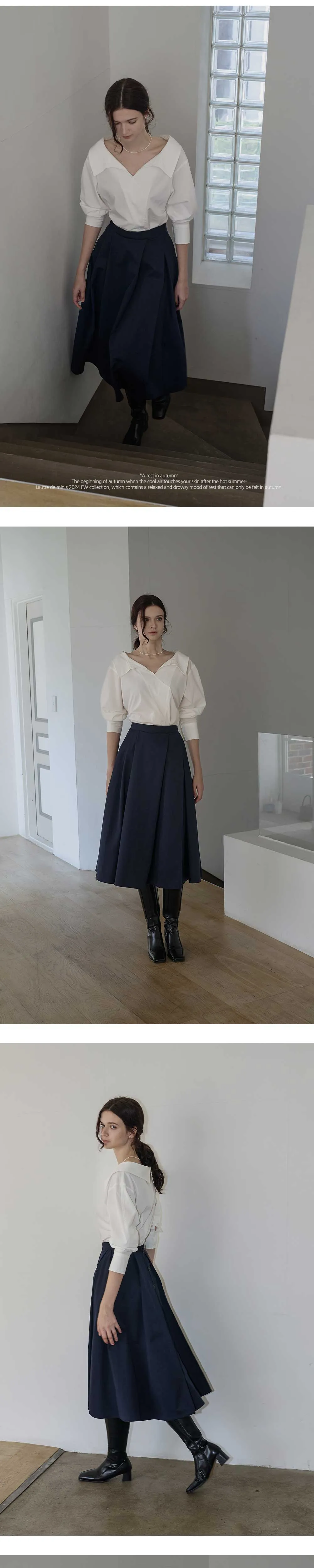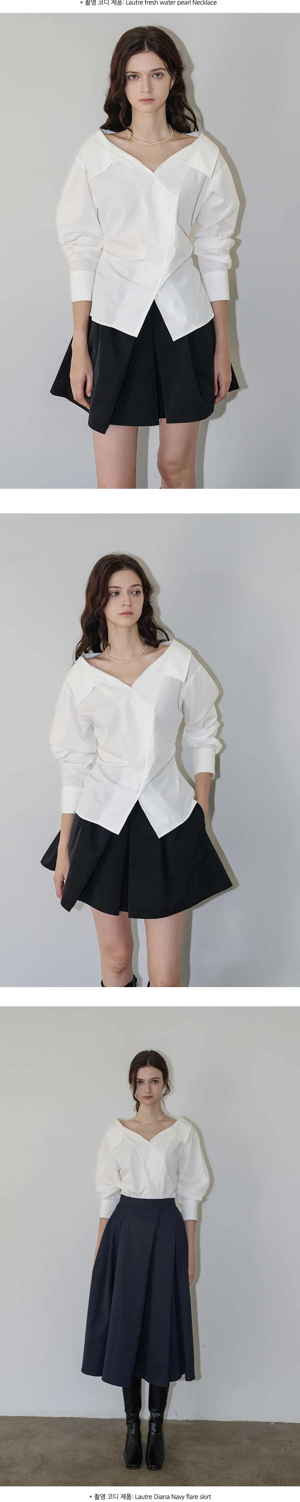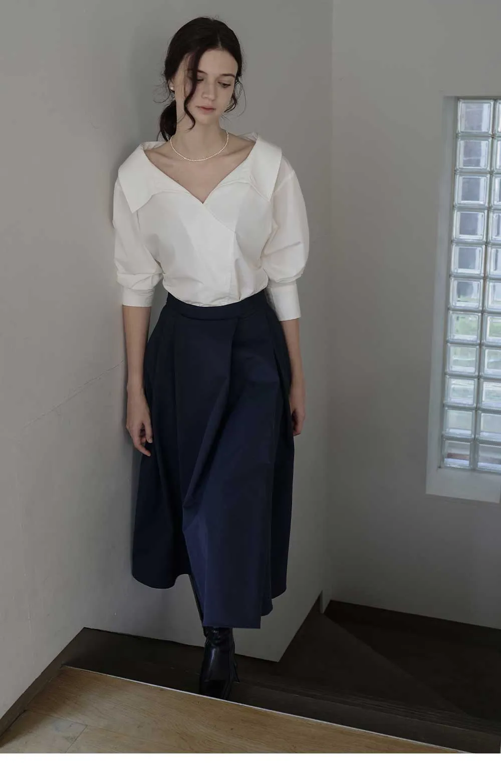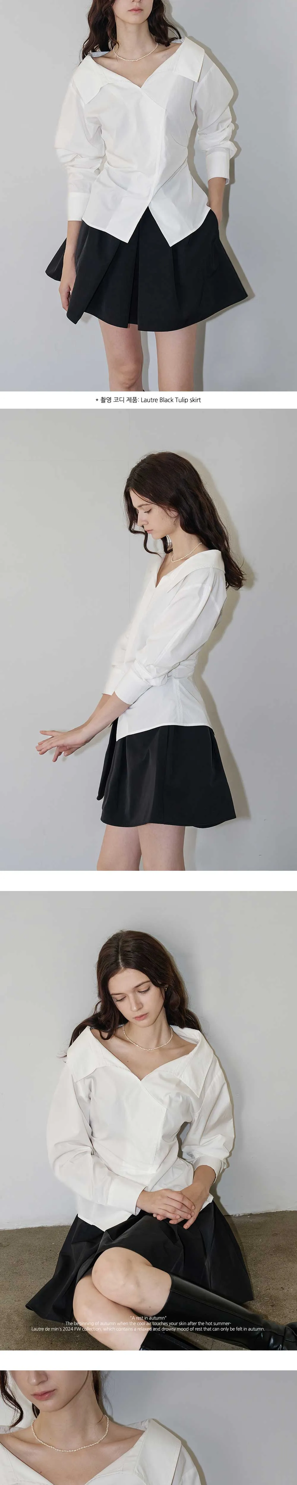 やわらかなネックラインが特徴のホワイトシャツ。