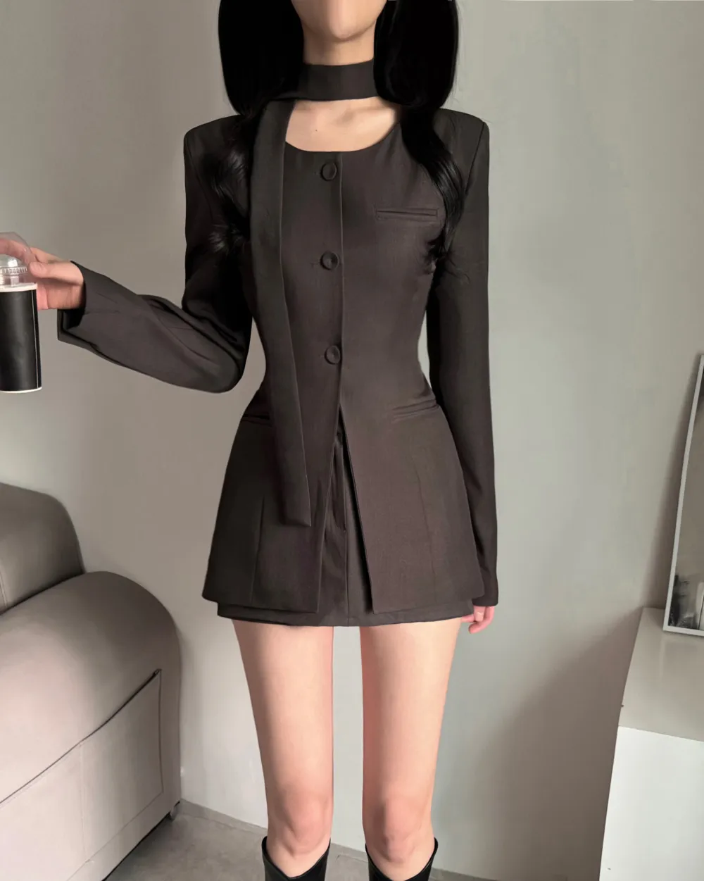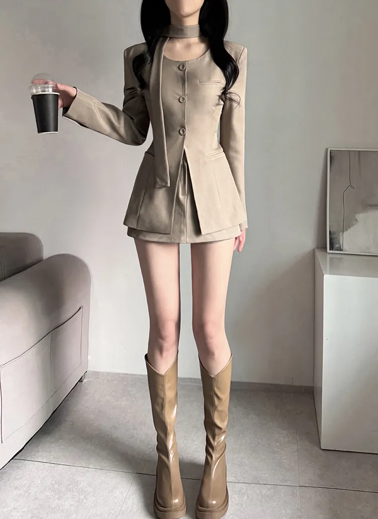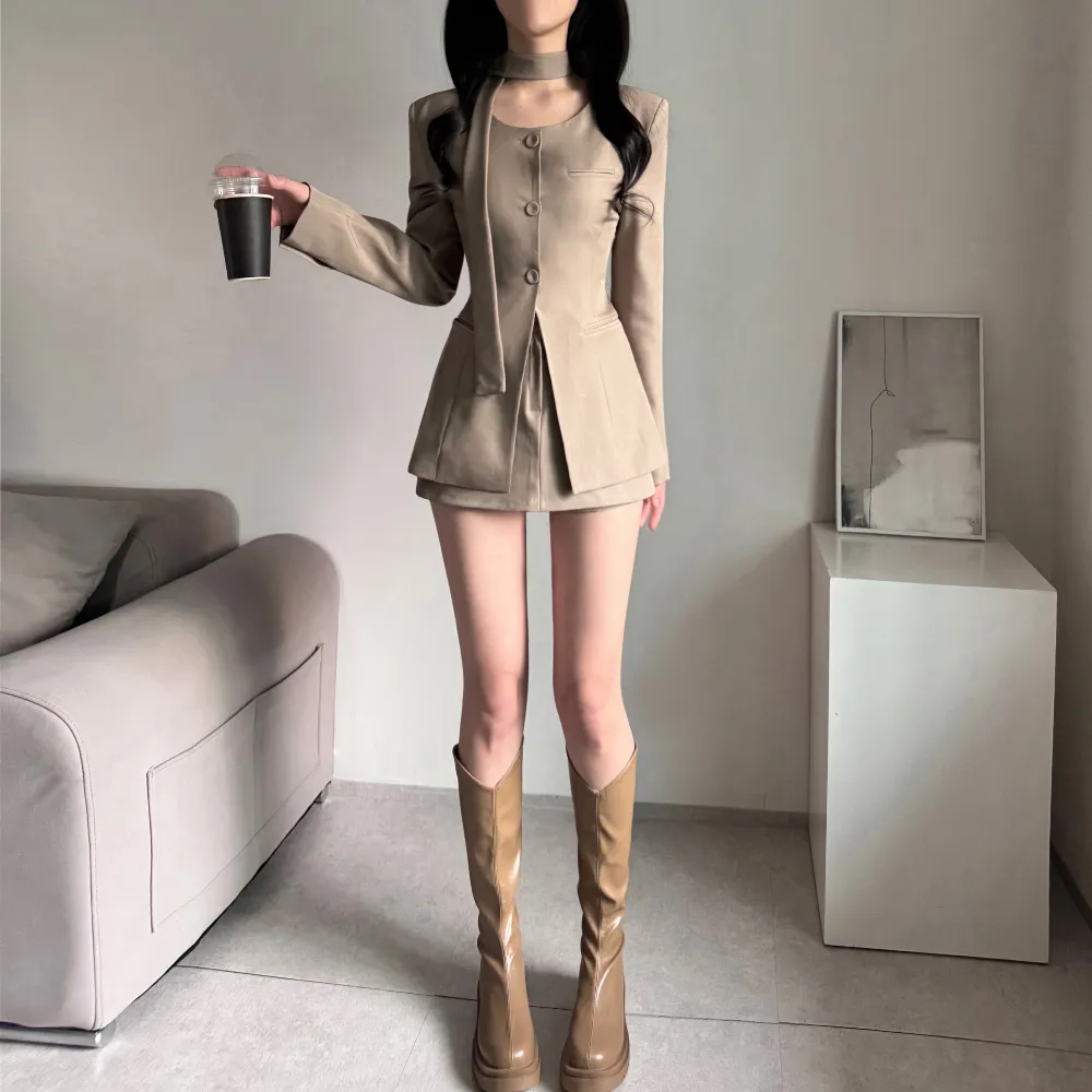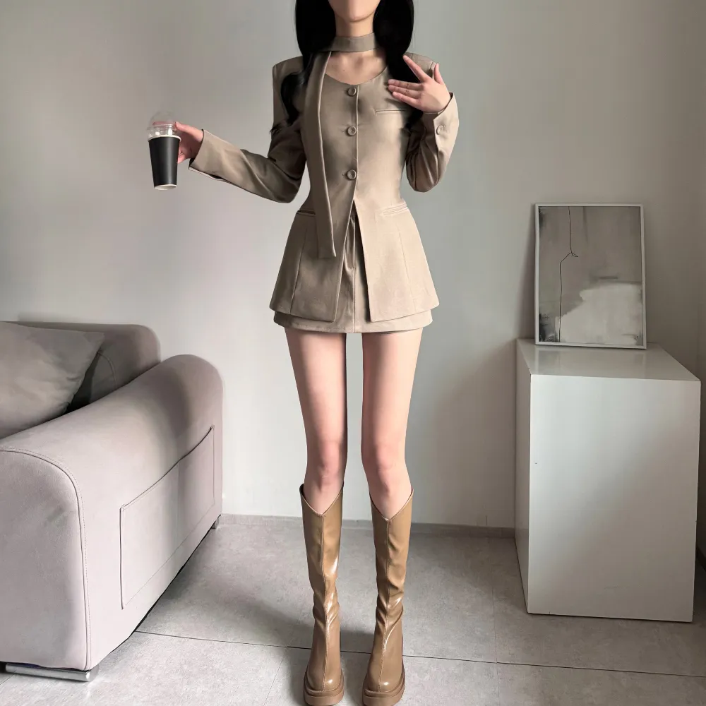 コットンジップアップハイネックラグランライン長袖ルーズプリーツAラインミニドローストリングポケットウエストゴム無地ジャンパースカートツーピース(トップス、ボトムス)