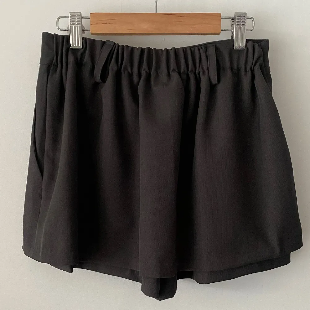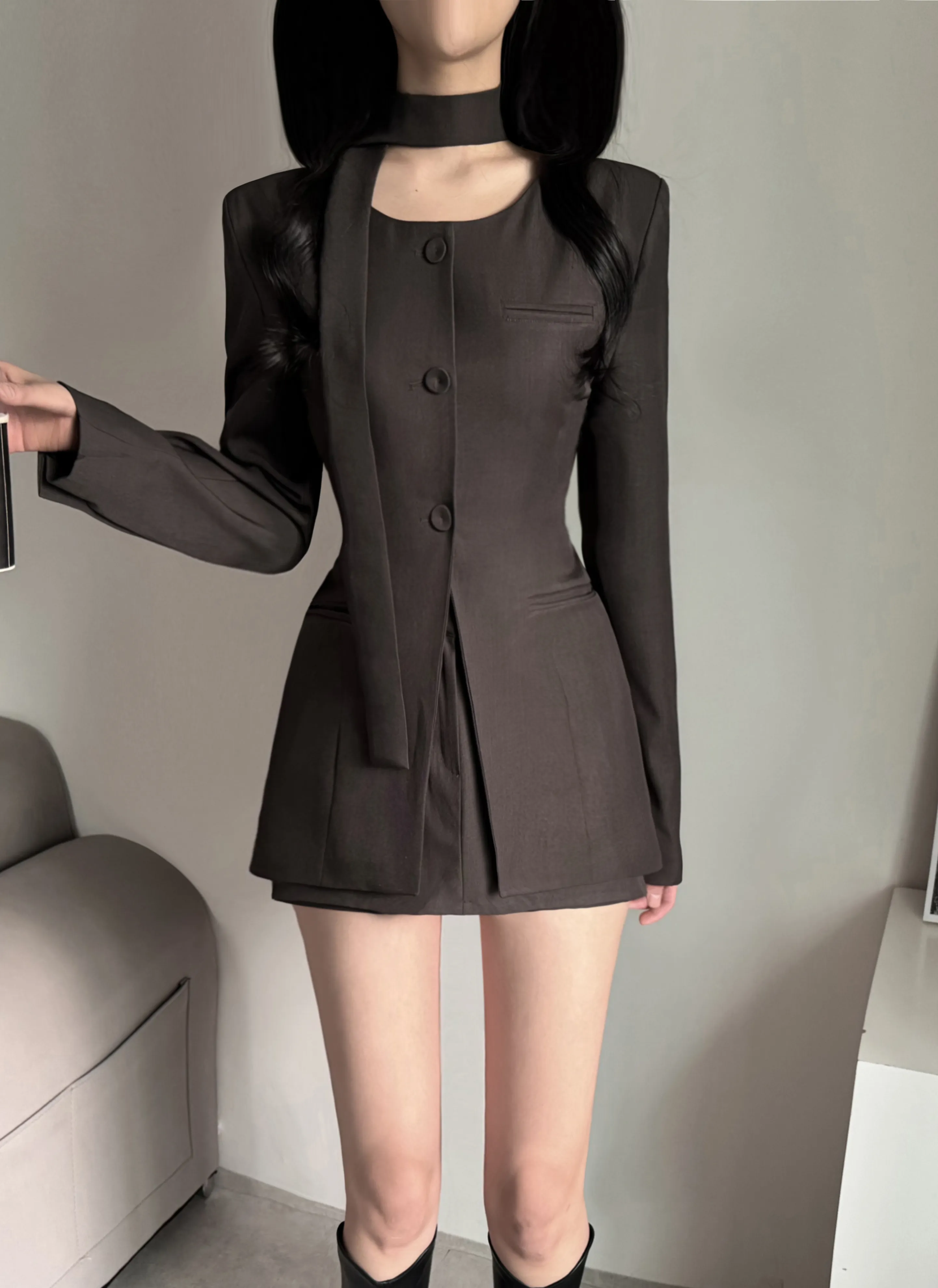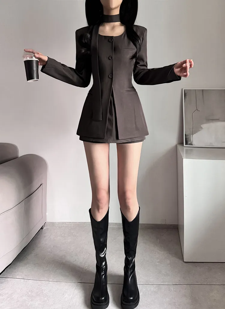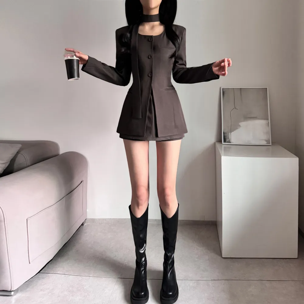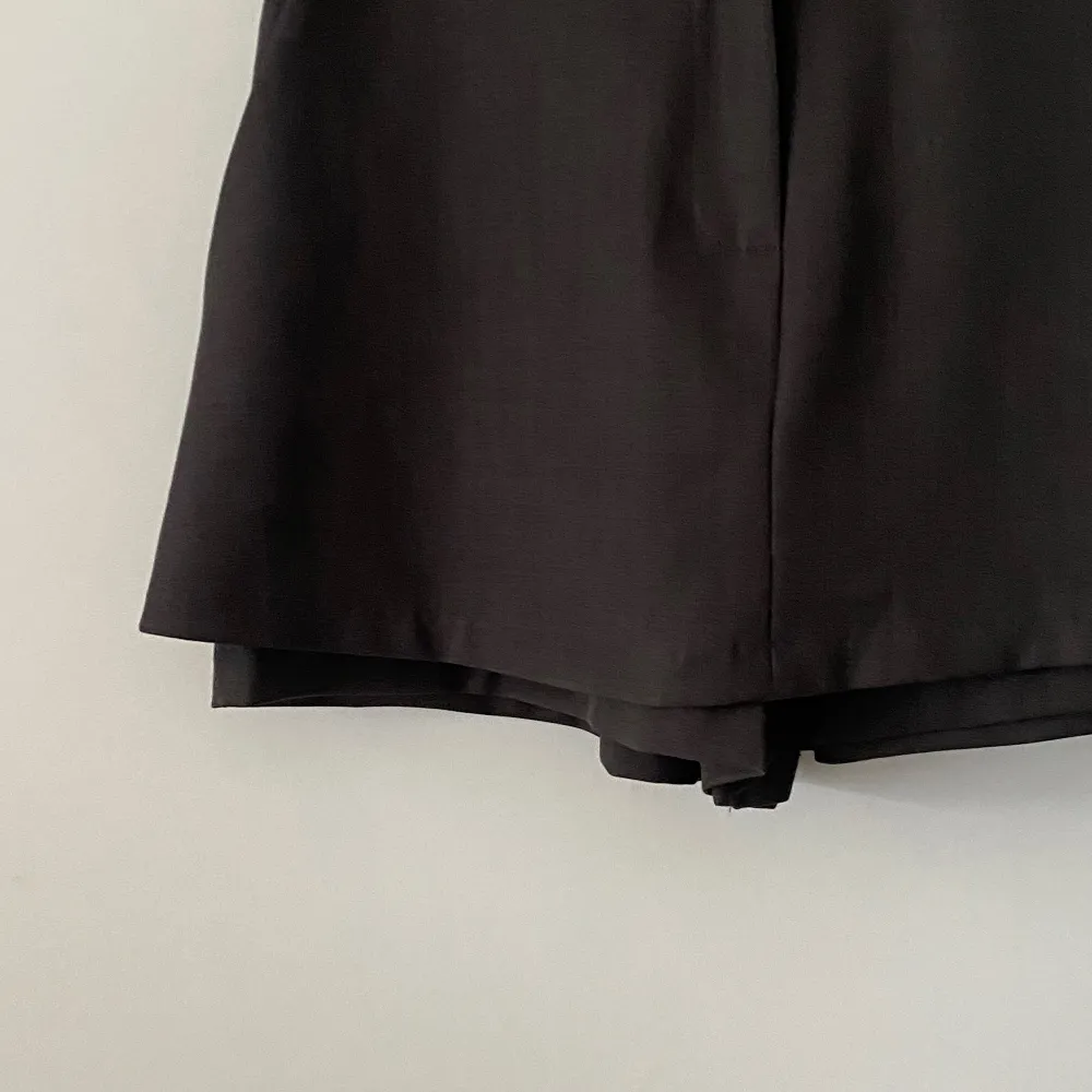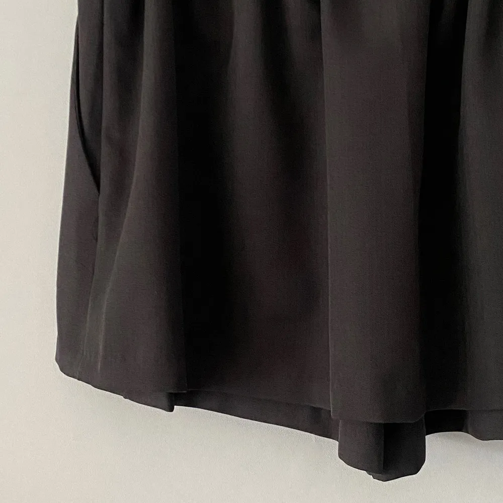 シースルーボタンスクエアネックラインウエストゴムパフスリーブスリムショート長袖ギャザーフレアAライン無地ツーピース(トップス、ボトムス)ブラウスショートパンツ