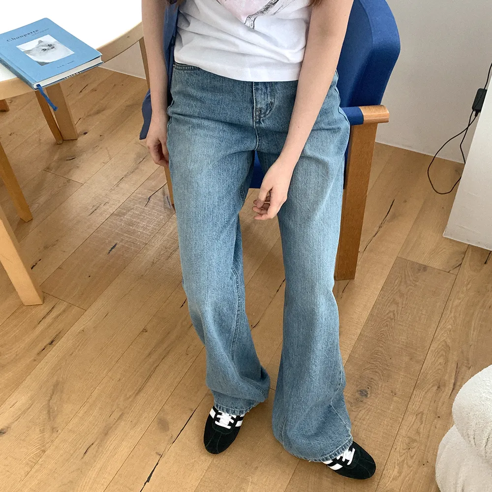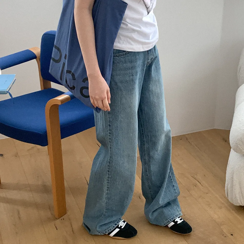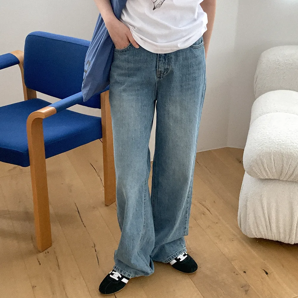 デニムコットンウォッシングポケットリベットバックポケットストレートワイドジップアップバックルループヒドゥンバンディングライトブルーディープブルーデニムパンツ[選べる丈]