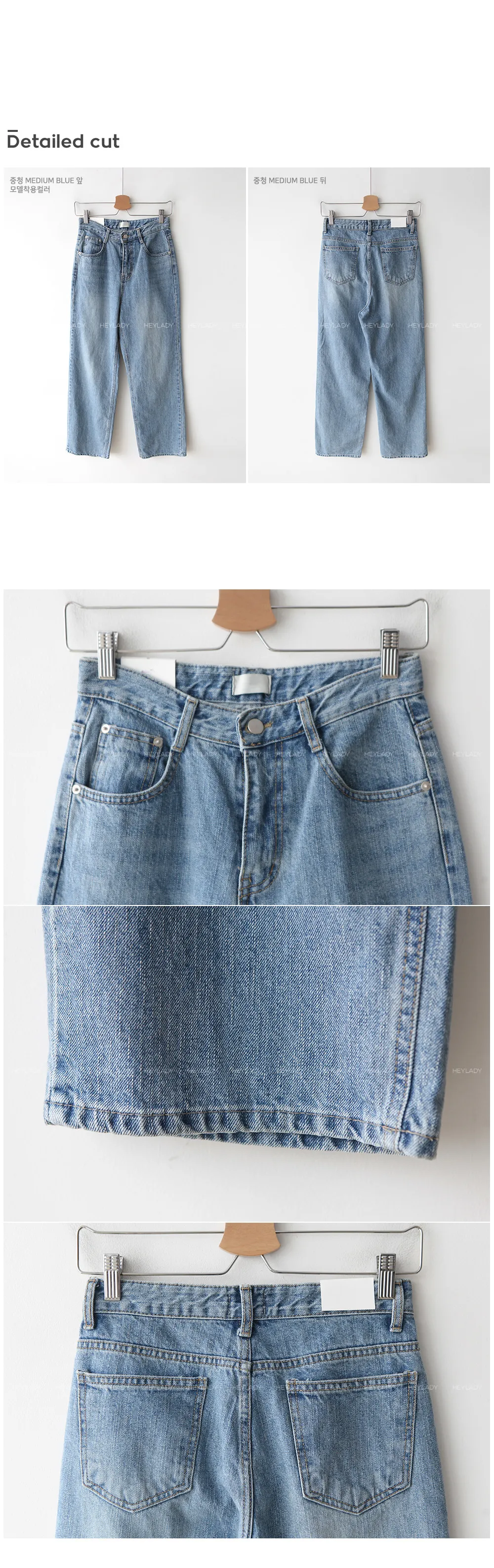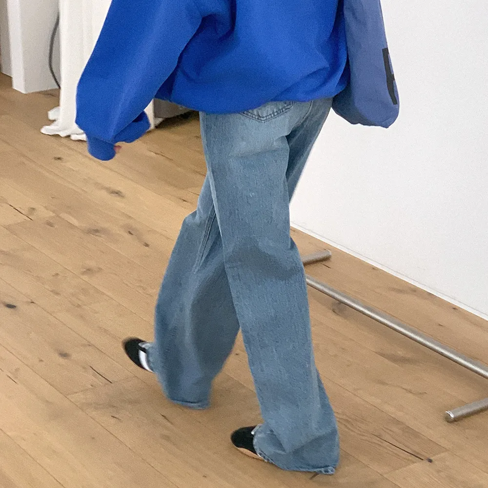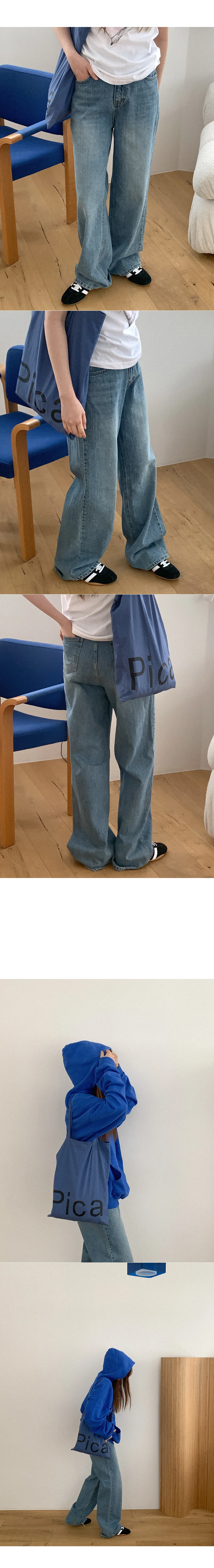 デニムコットンウォッシングポケットリベットバックポケットストレートワイドジップアップバックルループヒドゥンバンディングライトブルーディープブルーデニムパンツ[選べる丈]