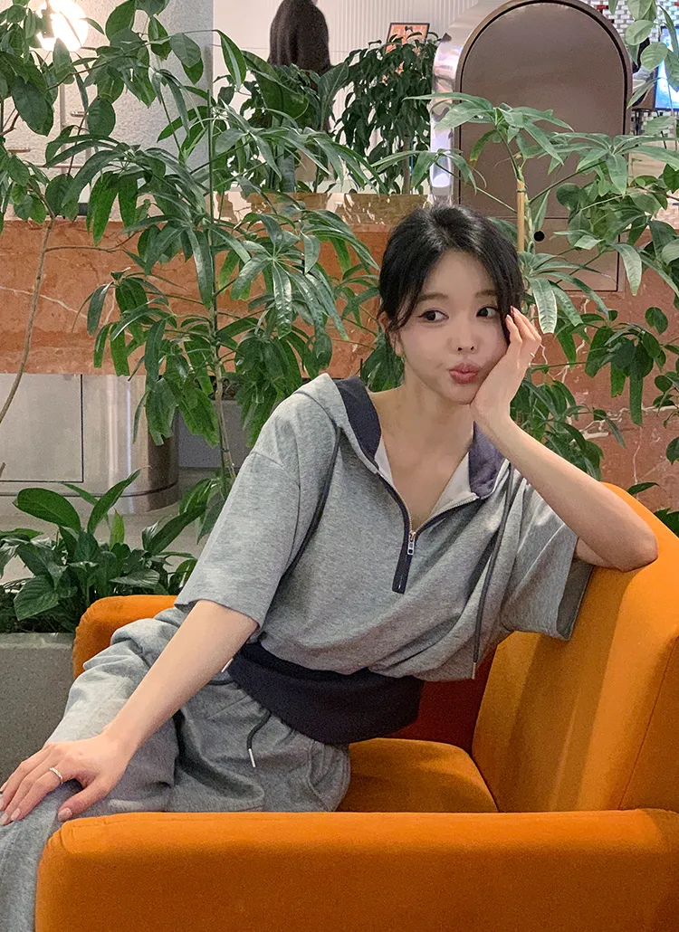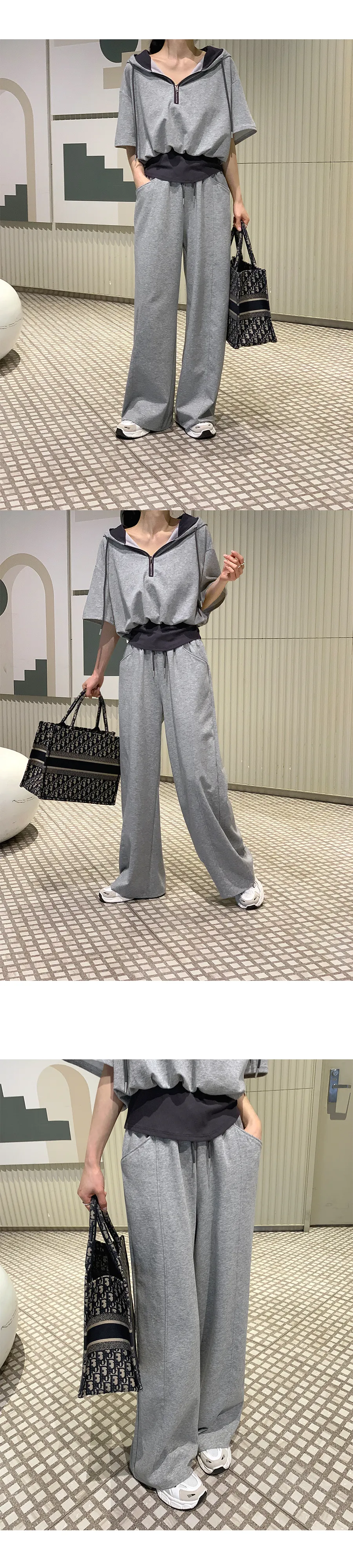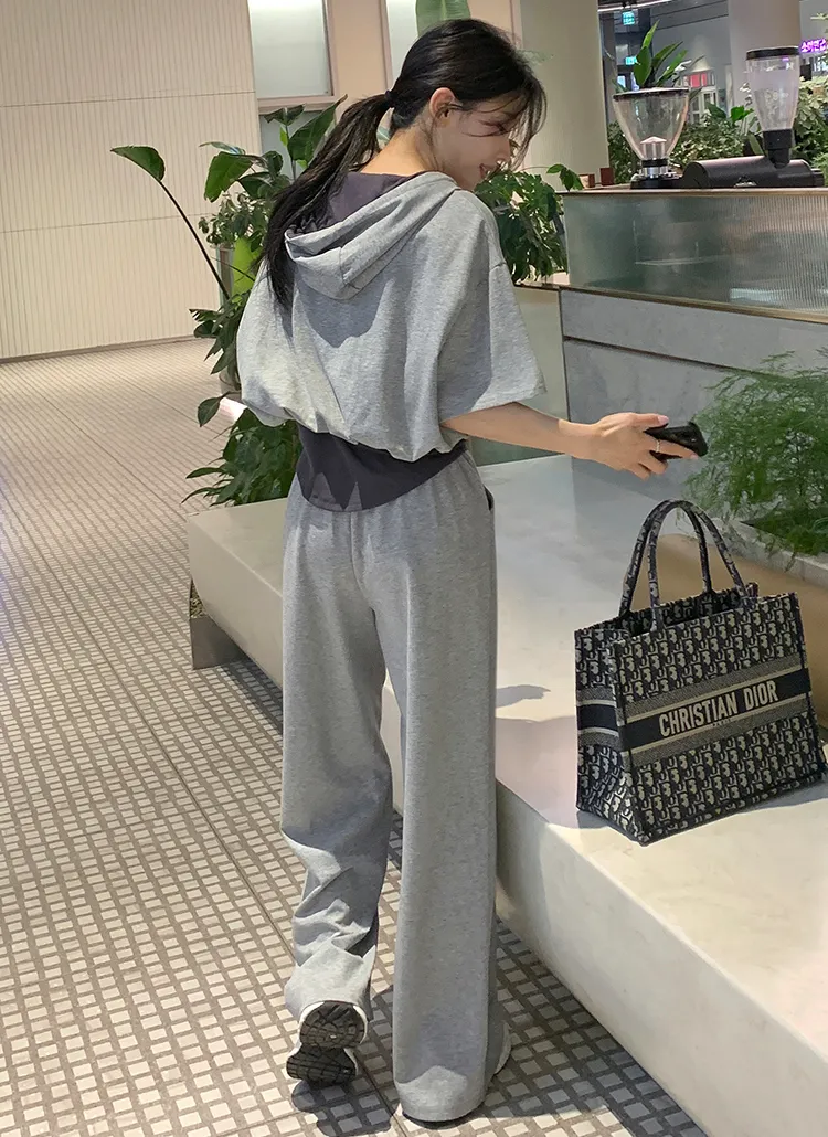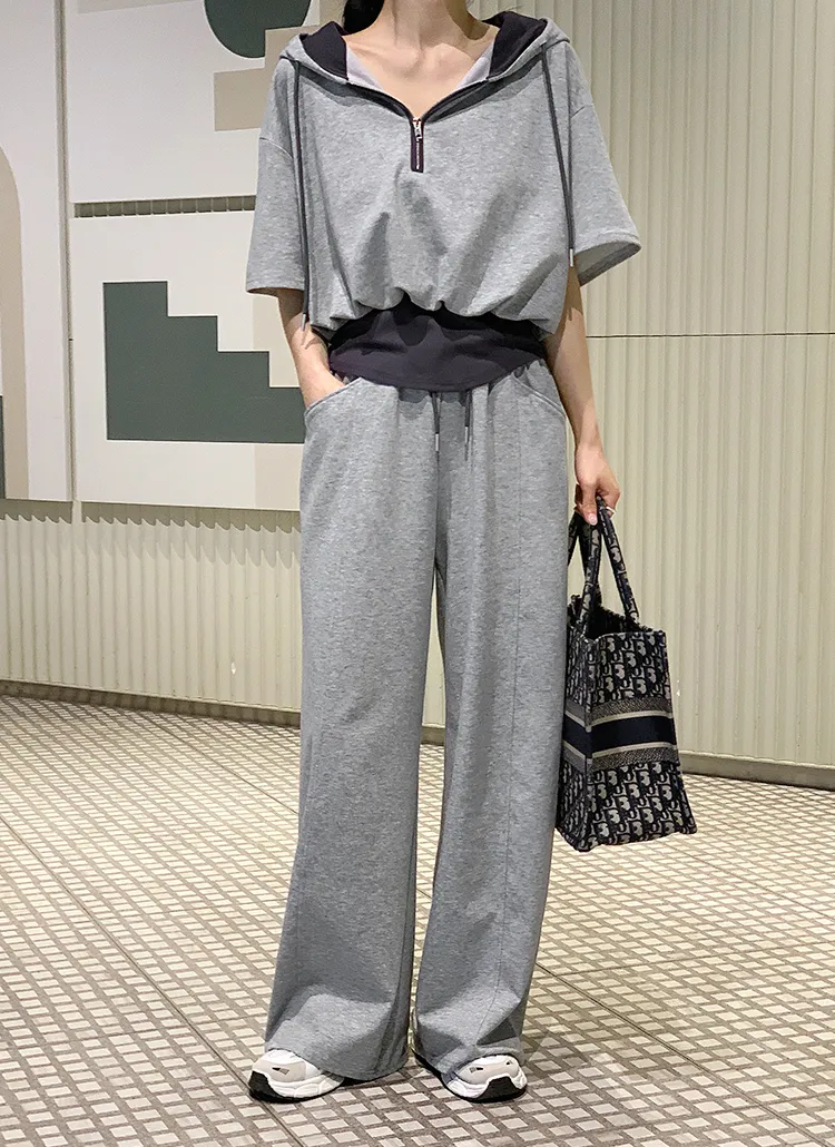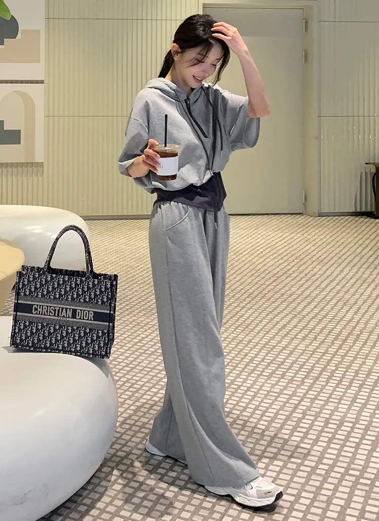ジップアップフードドローストリングポケットラインウエストゴムスリム長袖バックストラップバックポケットブーツカット無地ツーピース(トップス、ボトムス)パンツジップパーカー