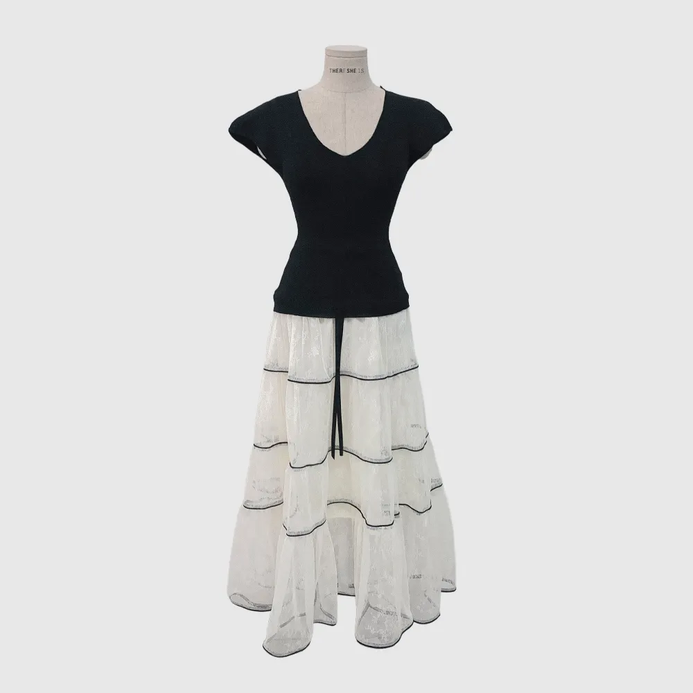 シルキーピンタックギャザースリムVネックドレープカウルネックヒドゥンジッパーストラップフレアAライン無地ノースリブラウススカートツーピース(トップス、ボトムス)