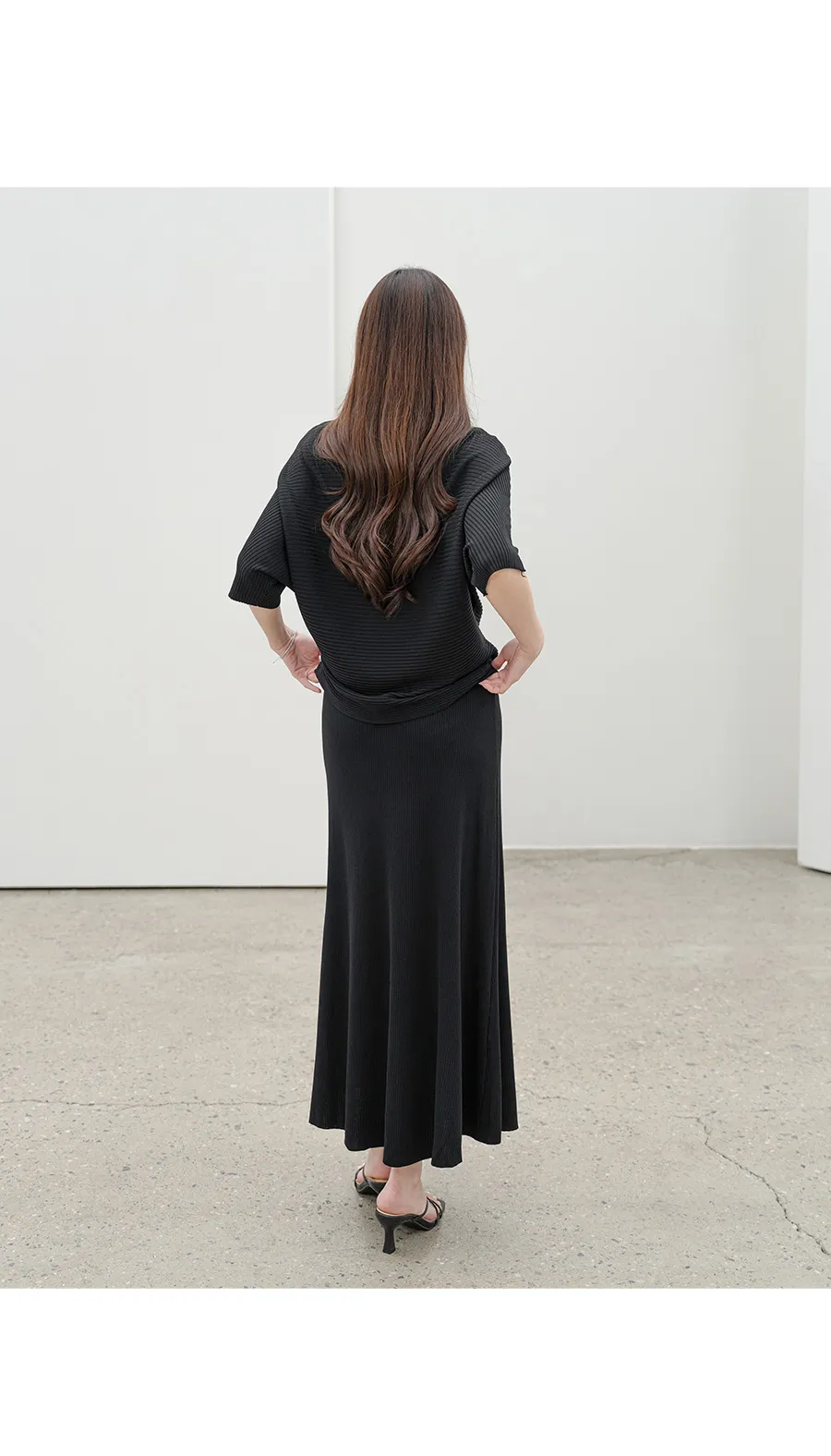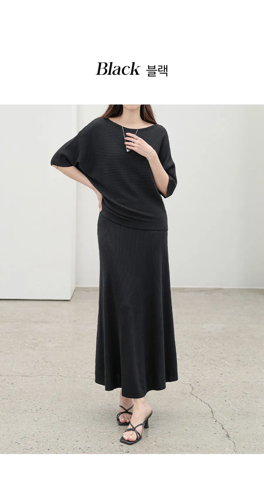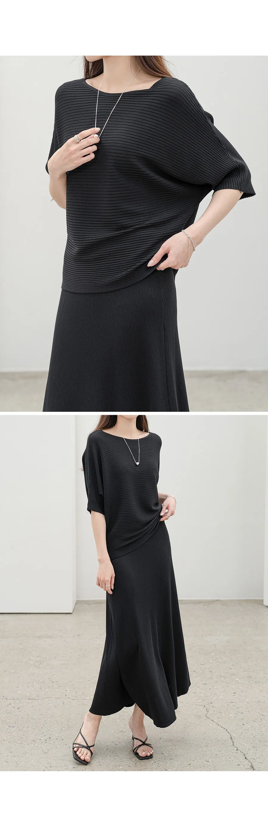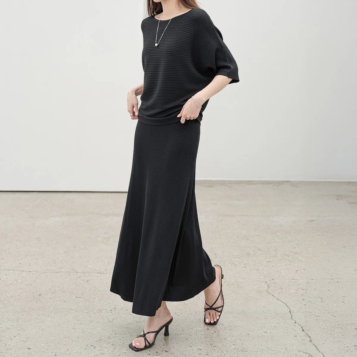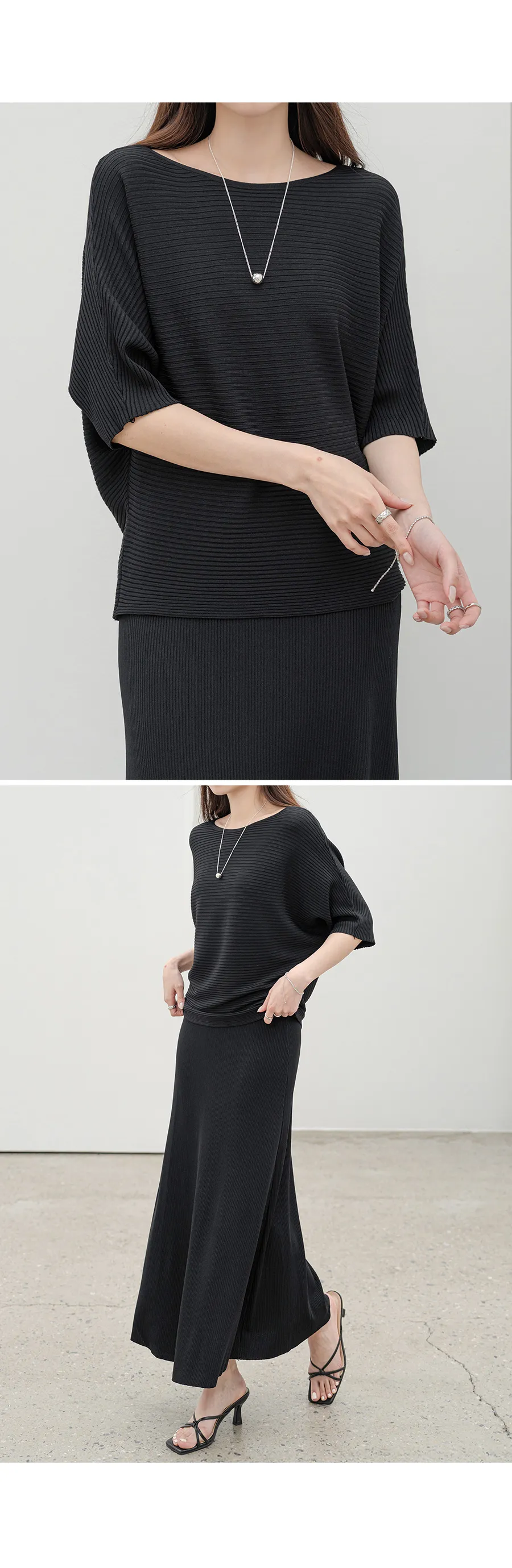 シルキーピンタックギャザースリムVネックドレープカウルネックヒドゥンジッパーストラップフレアAライン無地ノースリブラウススカートツーピース(トップス、ボトムス)