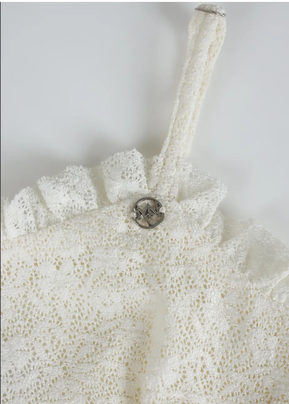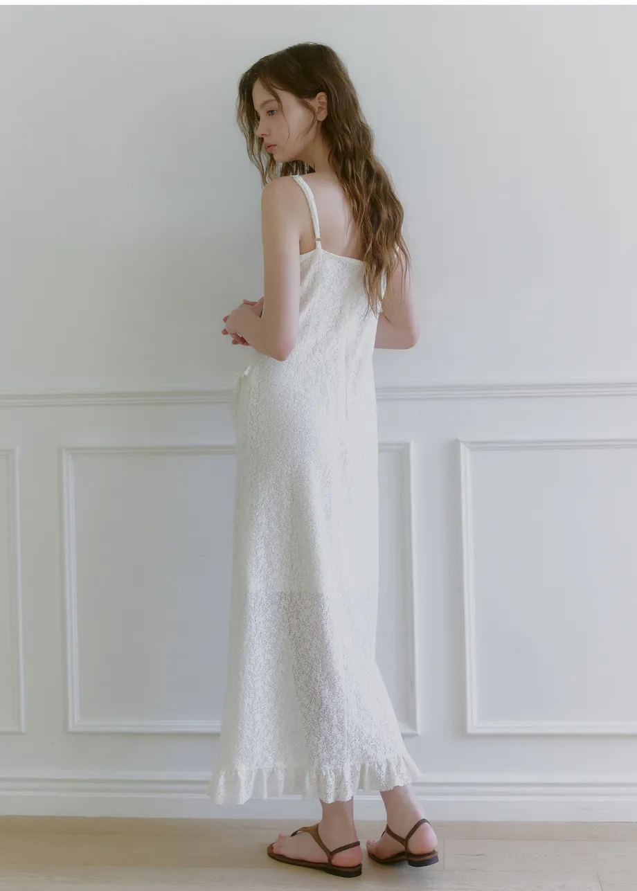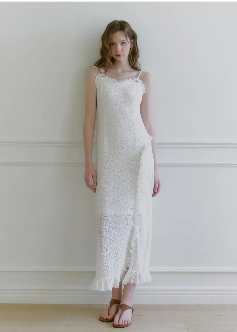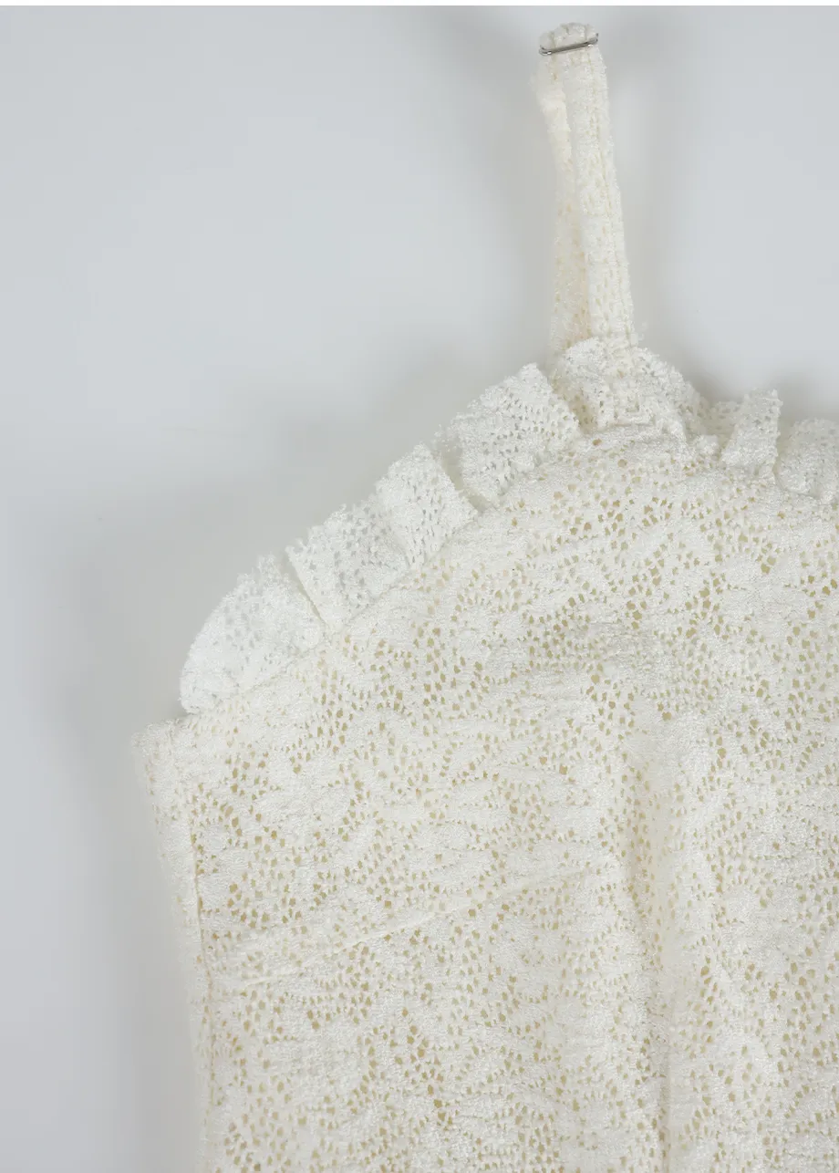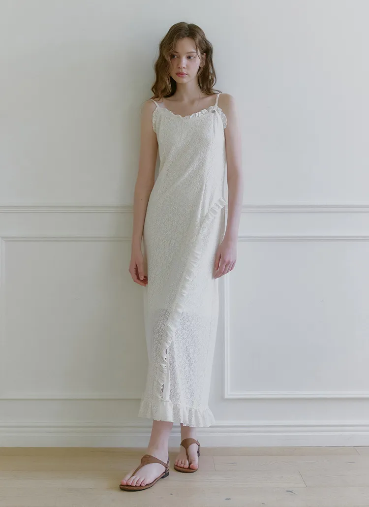 ヴィンテージバカンスムードで着用できるレースフリルドレスです。