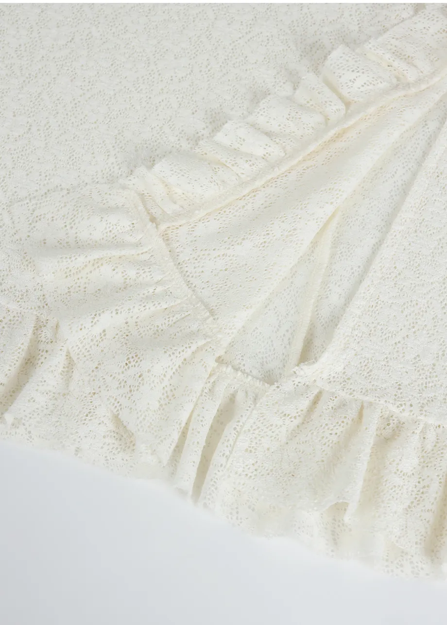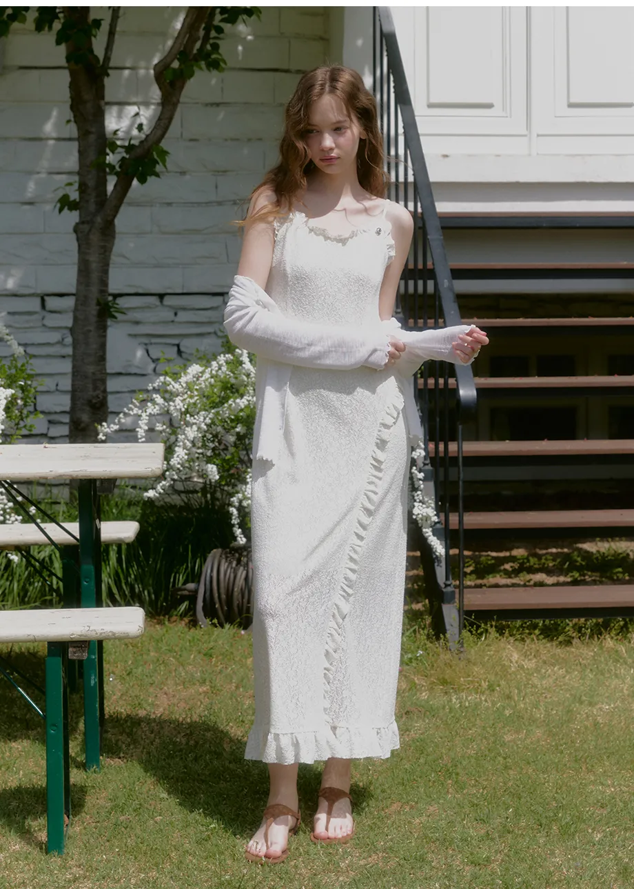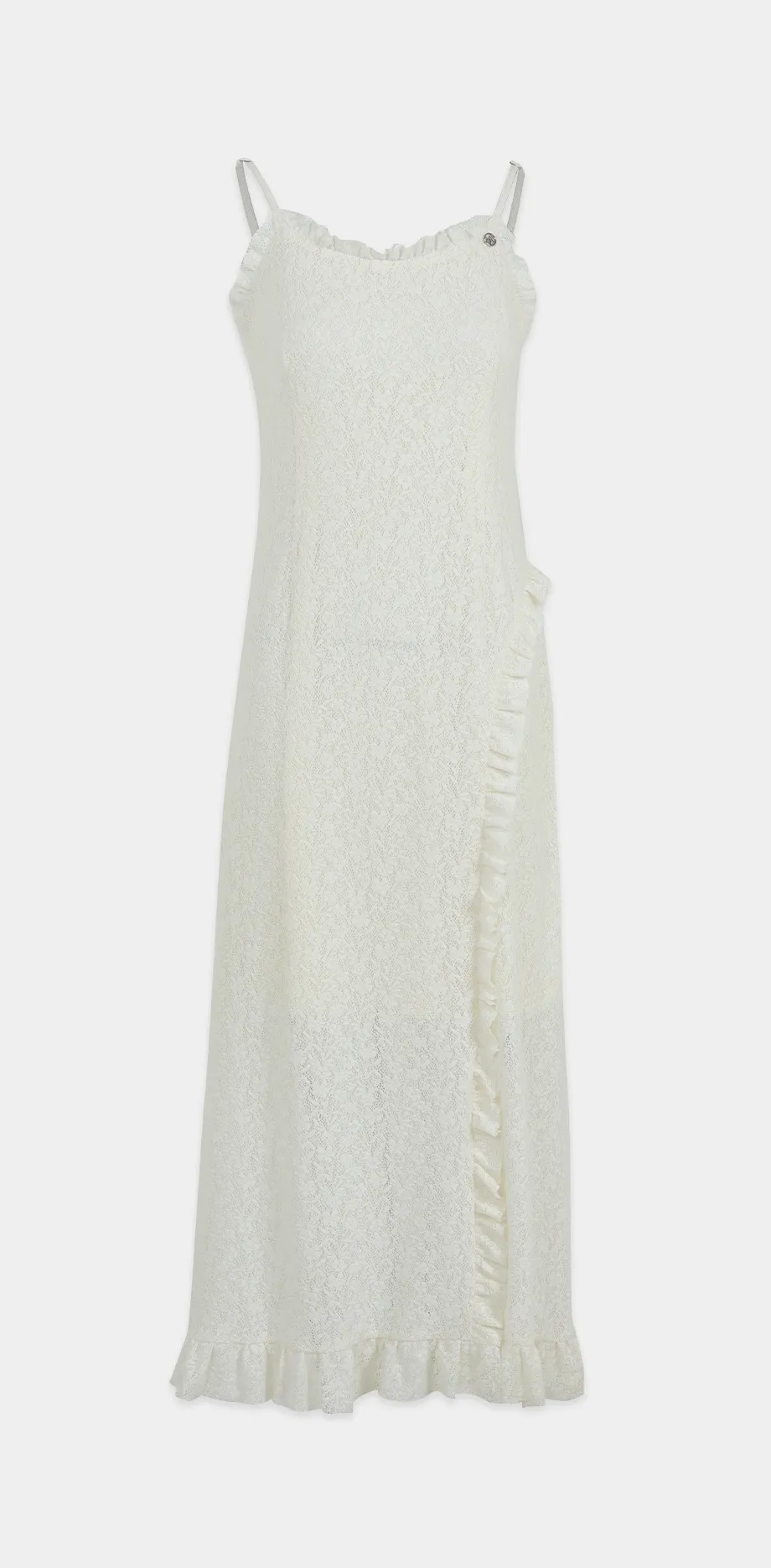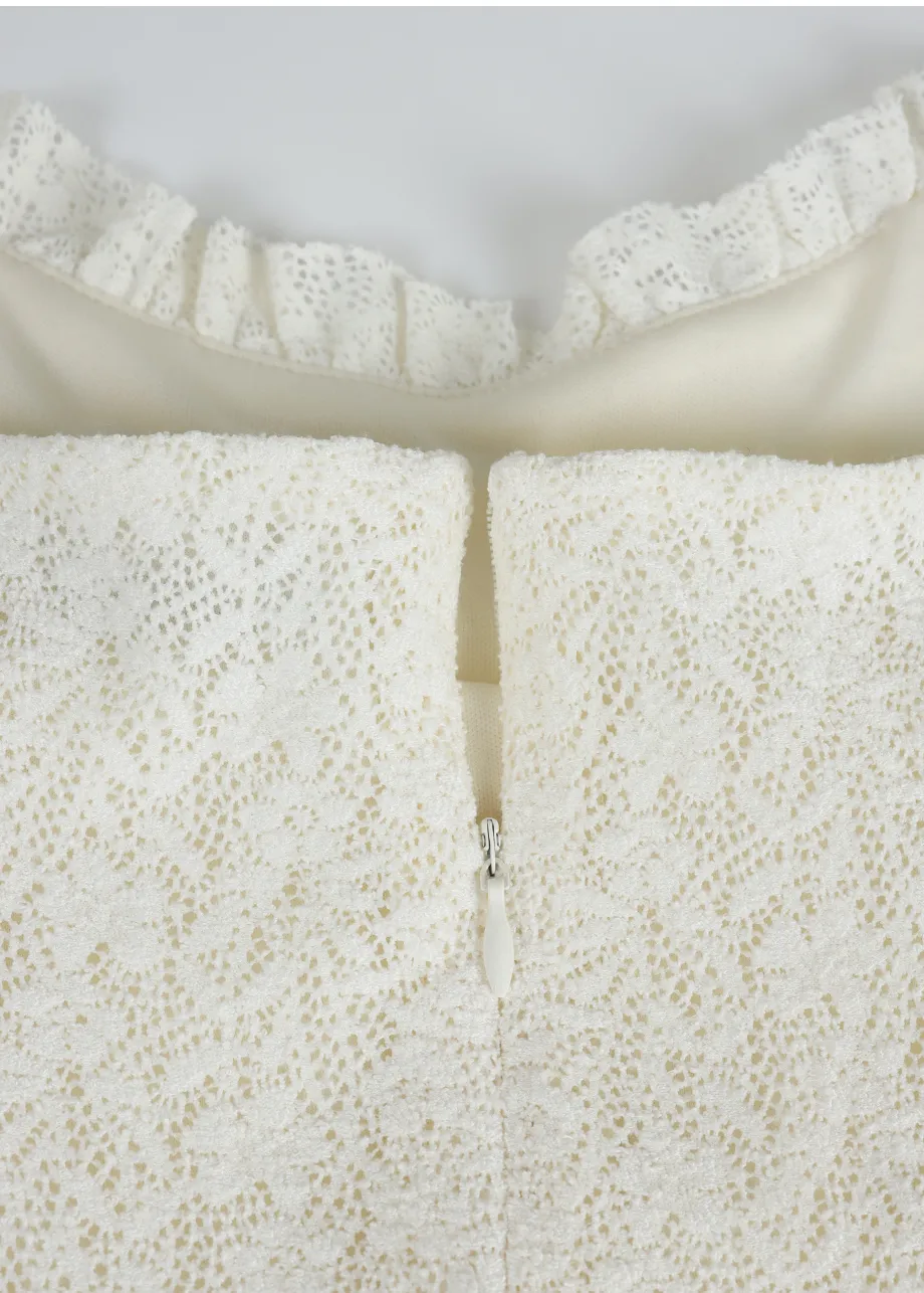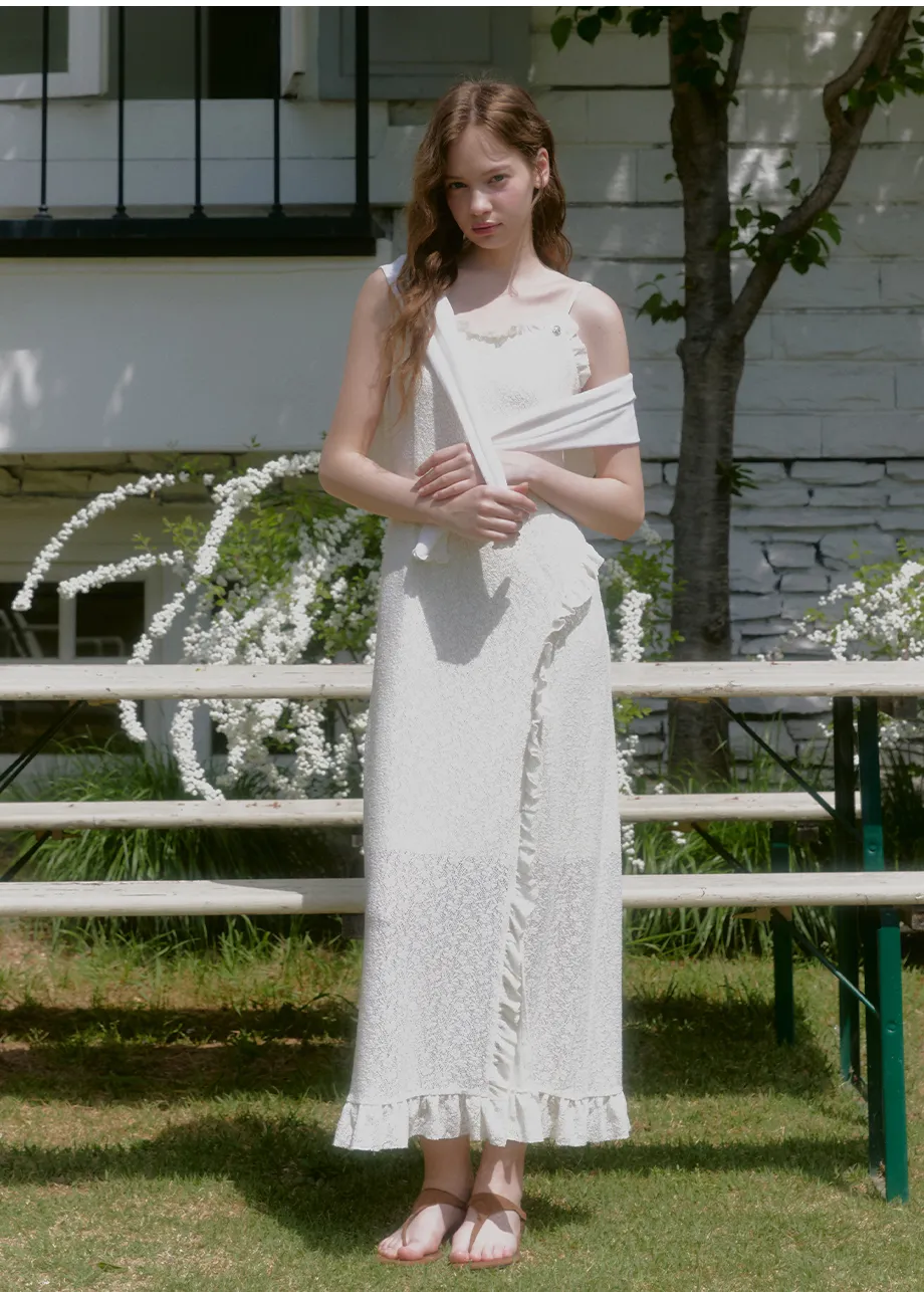 ヴィンテージバカンスムードで着用できるレースフリルドレスです。