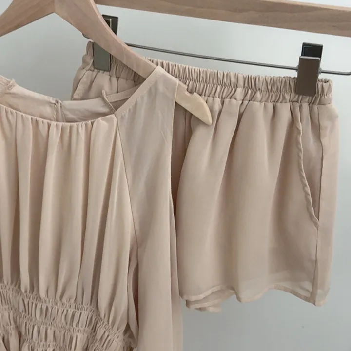 シアサッカーリンクル半袖ギャザーラウンドネックルーズオーバーサイズポケットAラインロングスリット後ボタンウエストゴムメロウブラウススカートツーピース(トップス、ボトムス)