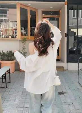 シースルーカラー長袖ルーズボタンリンクルシャツ