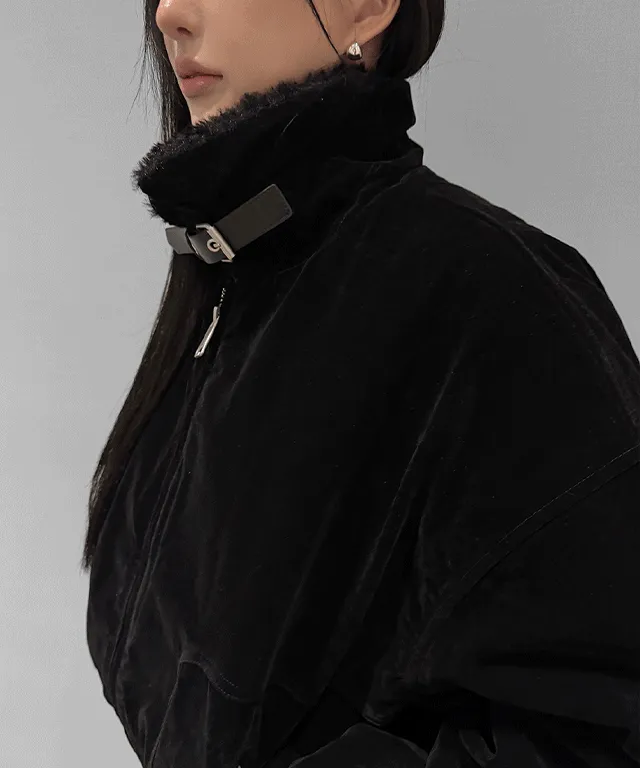 ファー裏地ムートンキルティング中綿ベロアジップアップストラップカラーハイネックポケットオーバーサイズジャンパー