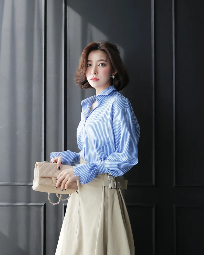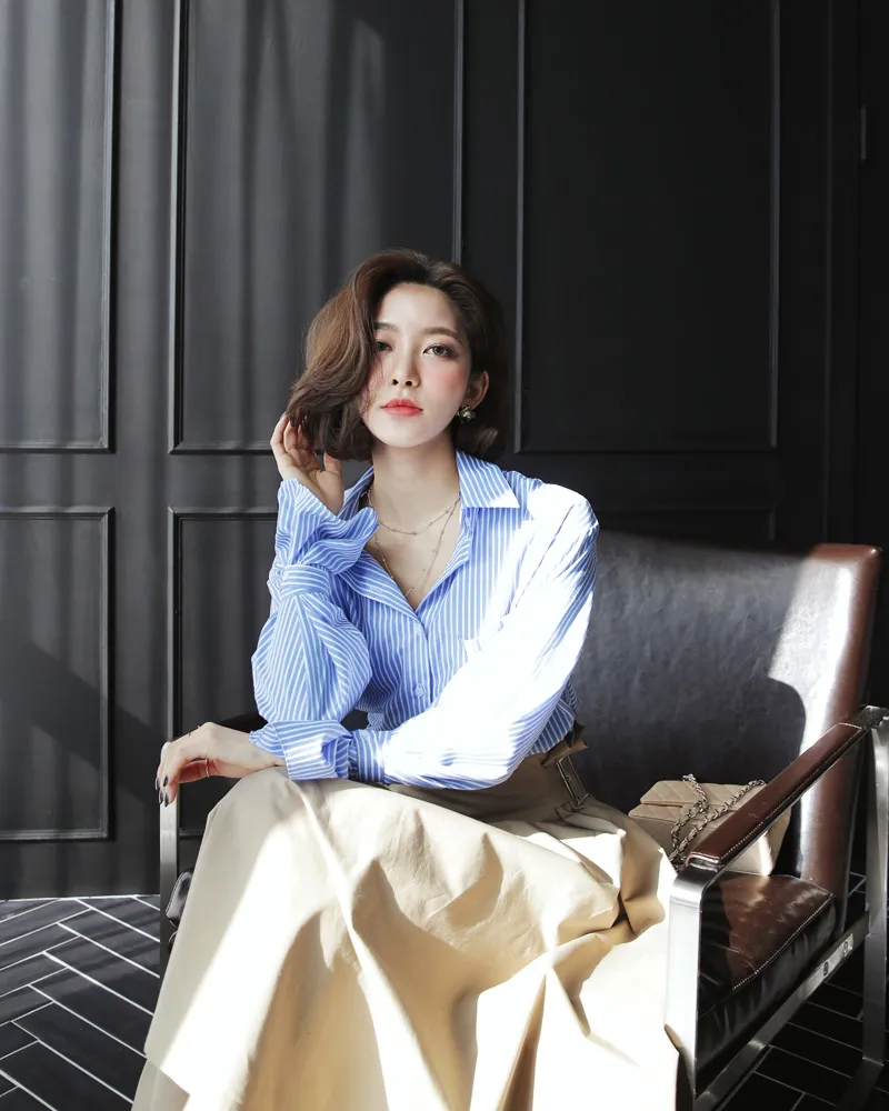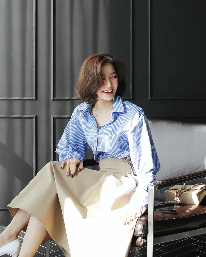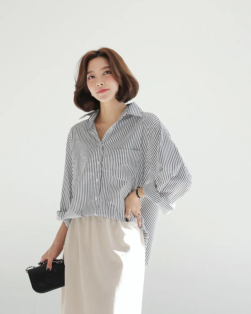 コットンカラーボクシールーズ長袖ストライプ配色シャツ