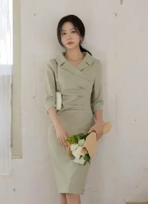 カラースリットラインスリム7分袖ミディビジューボタンフェイクボタンマーメイドヒドゥンジッパー無地ワンピース