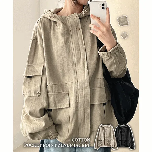 コットンハイネックスナップボタンジップアップドローコード長袖ゴムドロップショルダーカーゴフラップポケットアウトポケットオーバーサイズハーフライン無地ジャンパー