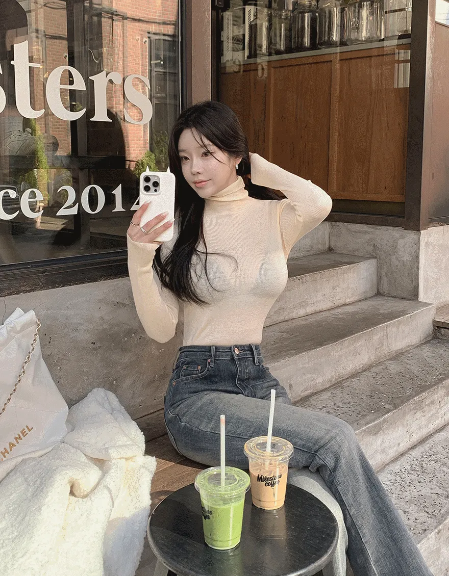 ウール混リブタートルネックスリムシンプルベーシックTシャツ