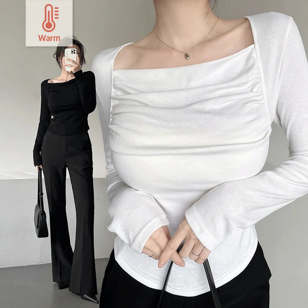 裏起毛ストレッチ長袖スリムスクエアネックドレープギャザーTシャツ