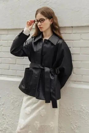 レザー調ボタンカラーポケットボクシールーズ長袖ジャンパーベルト付