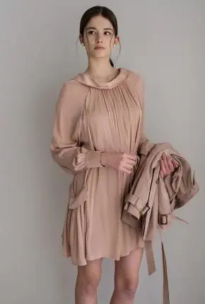 シフォンラウンドネックルーズ長袖ミニワンピーススカーフ付