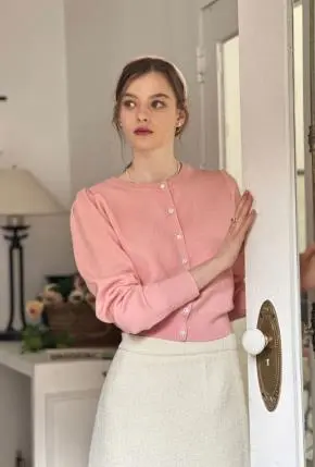 ニットラウンドネックベーシックパフスリーブ長袖ビジューボタンカーディガン