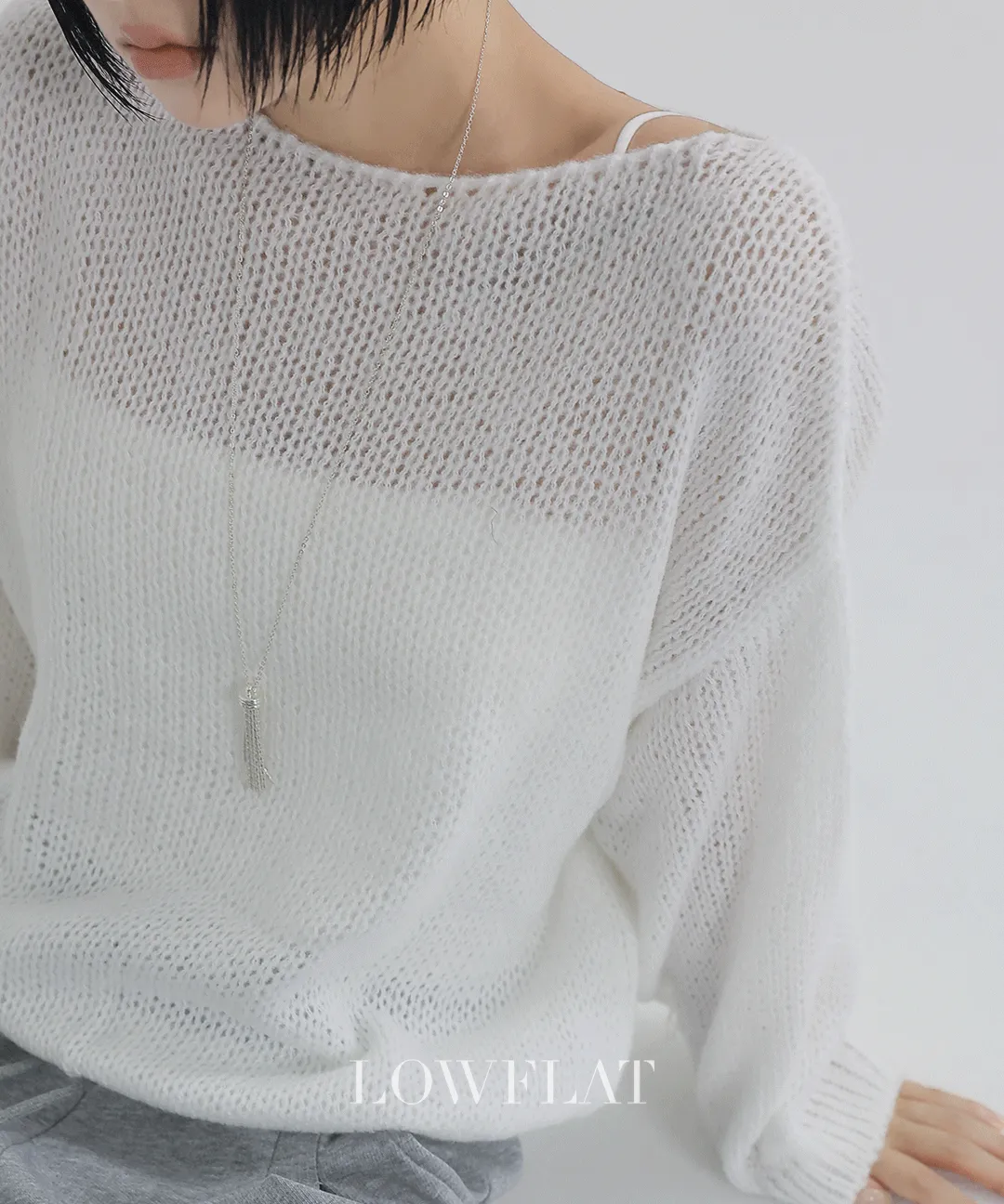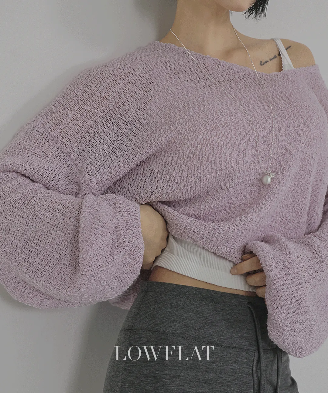 ブークレバルーンルーズ長袖ワイドネックドロップショルダー無地ニット