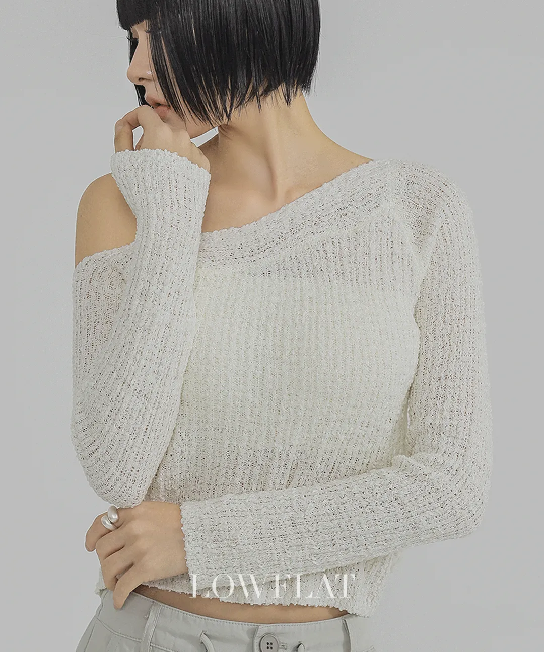 ワンショルダースリムアンバランス長袖セミクロップド無地ニット