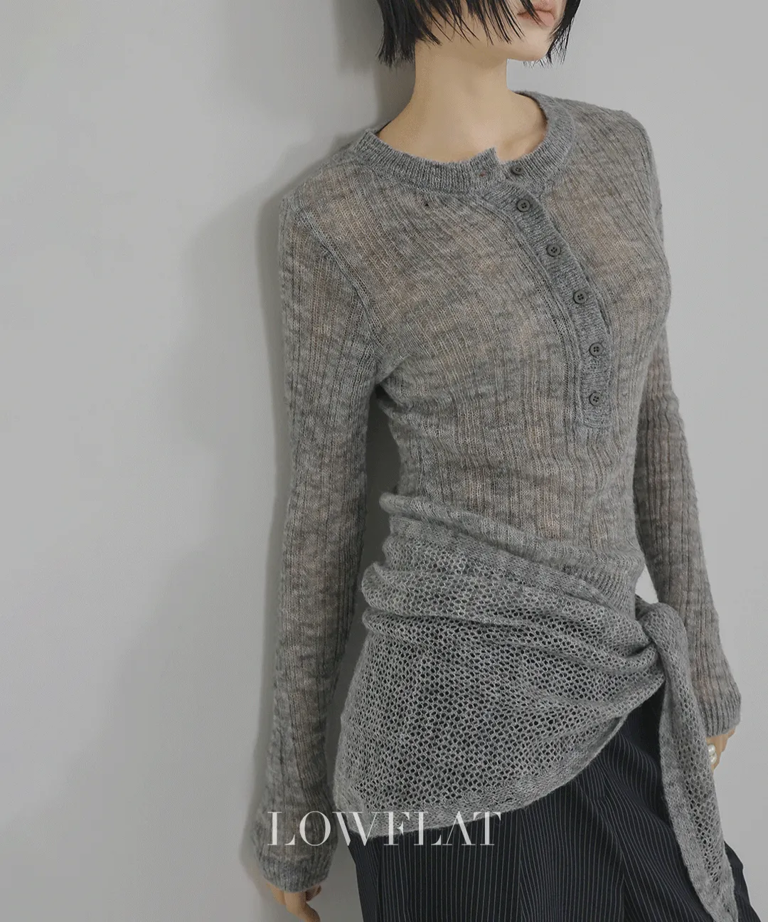 シャギーラウンドネックヘンリーネックスリムハーフボタン長袖無地スカートニットスカート付
