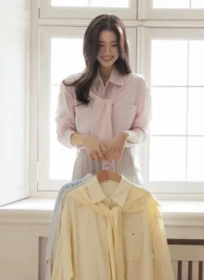 長袖リボンボタンカラーカラーシャツ