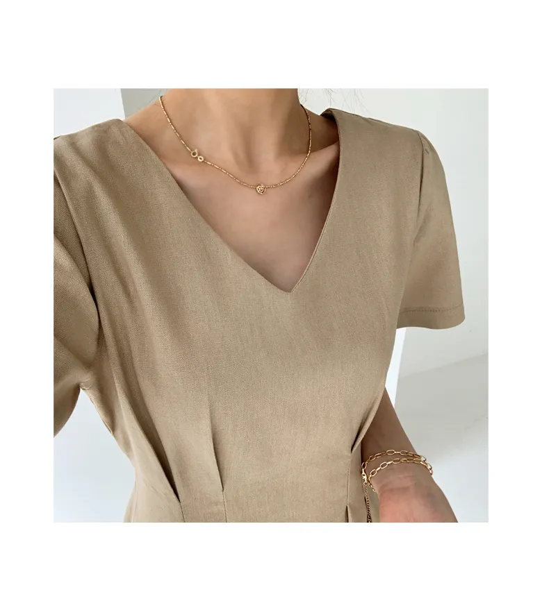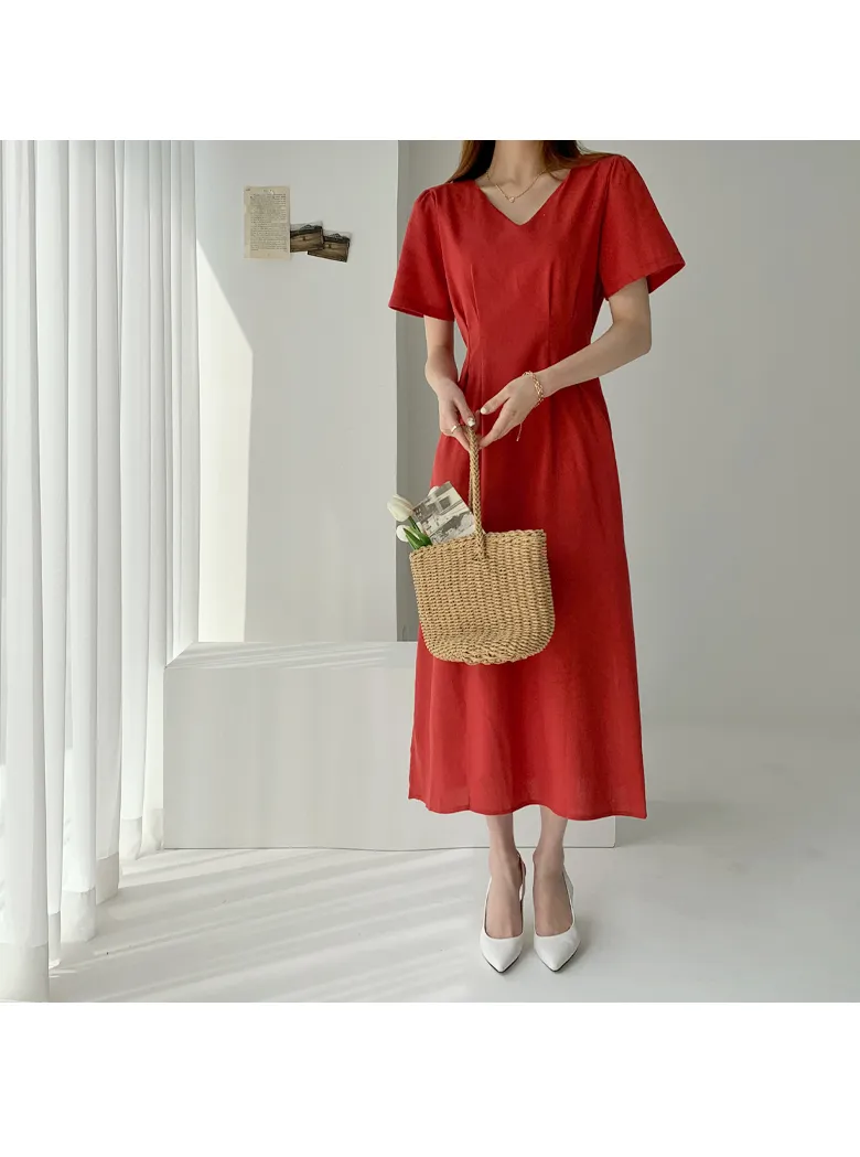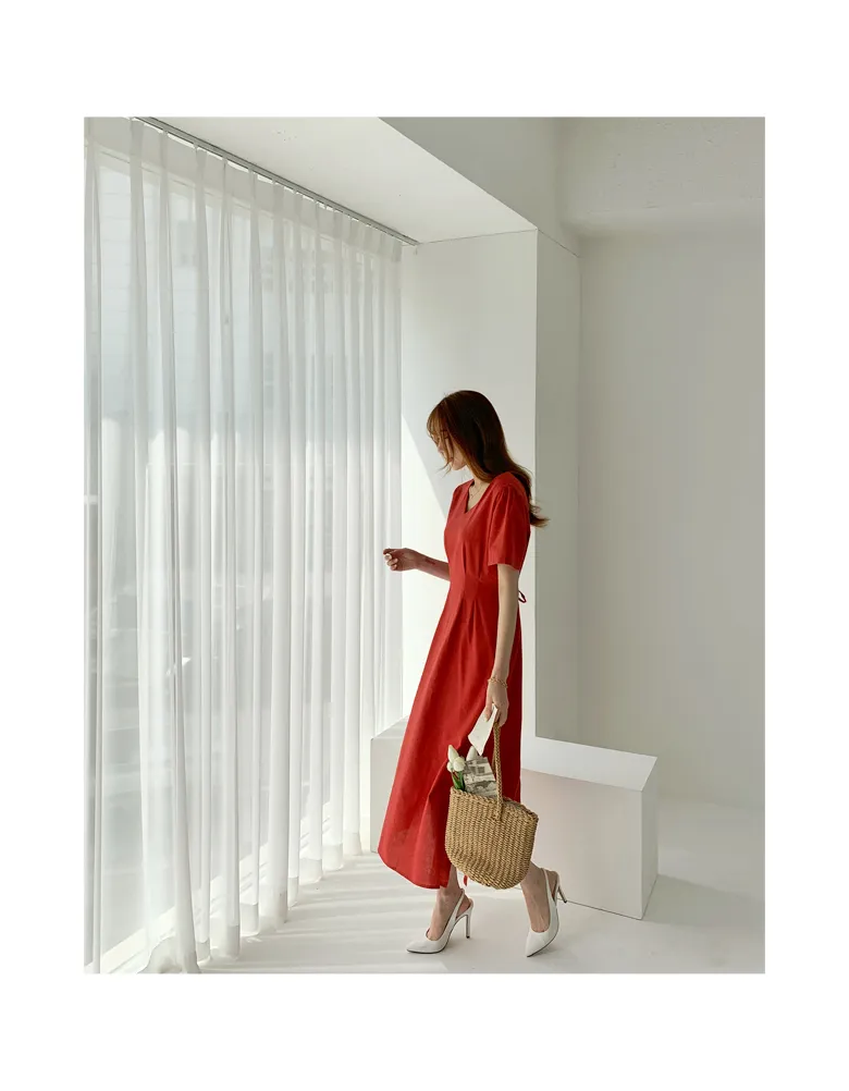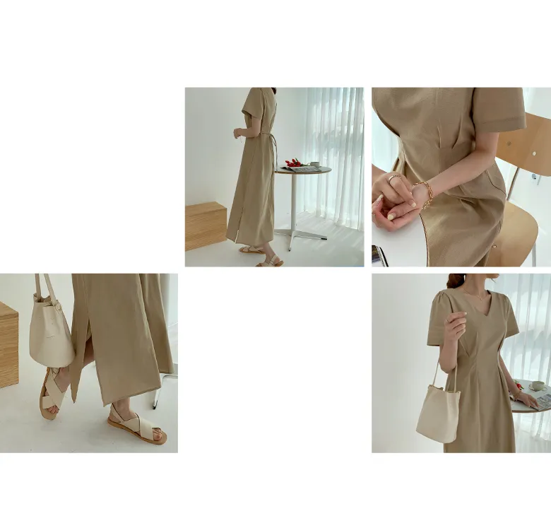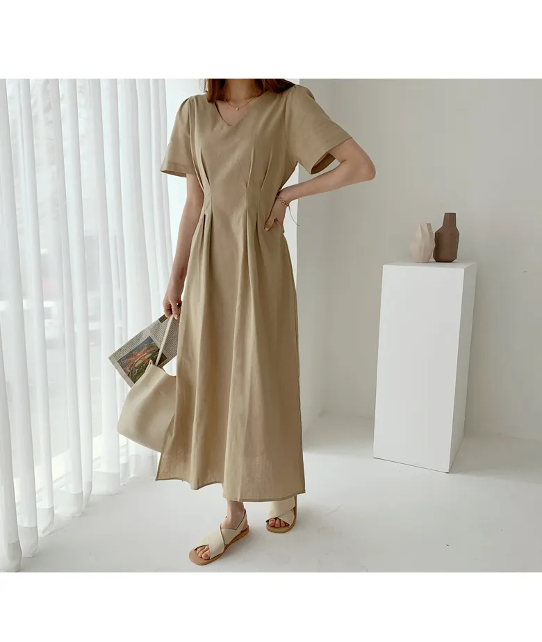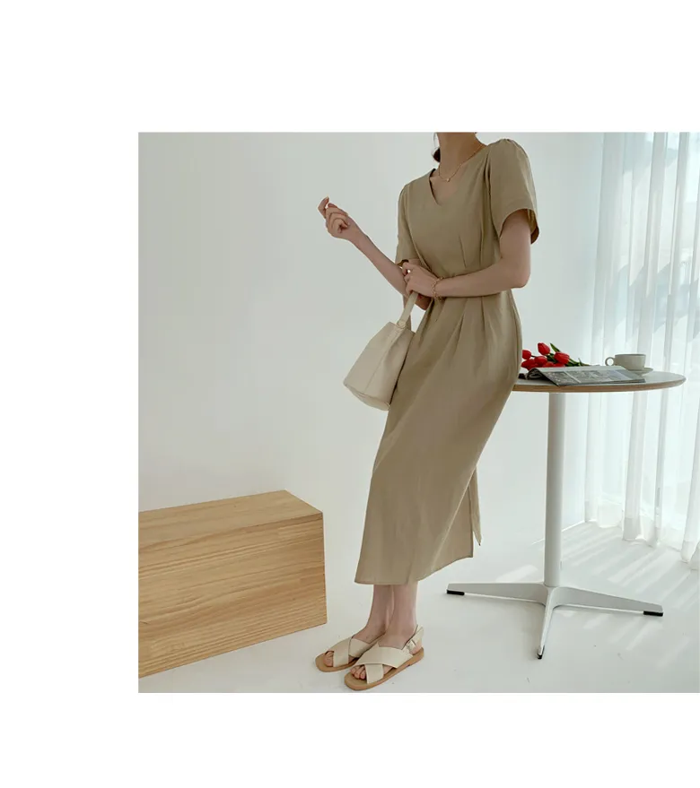 リネン混ラウンドネックスリットマキシレイヤード風Hライン(ロング丈)リンクルフリーヒドゥンジッパー無地ワンピース