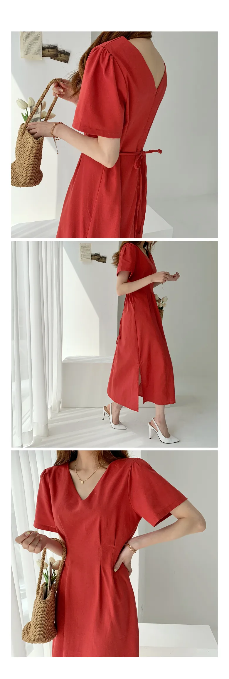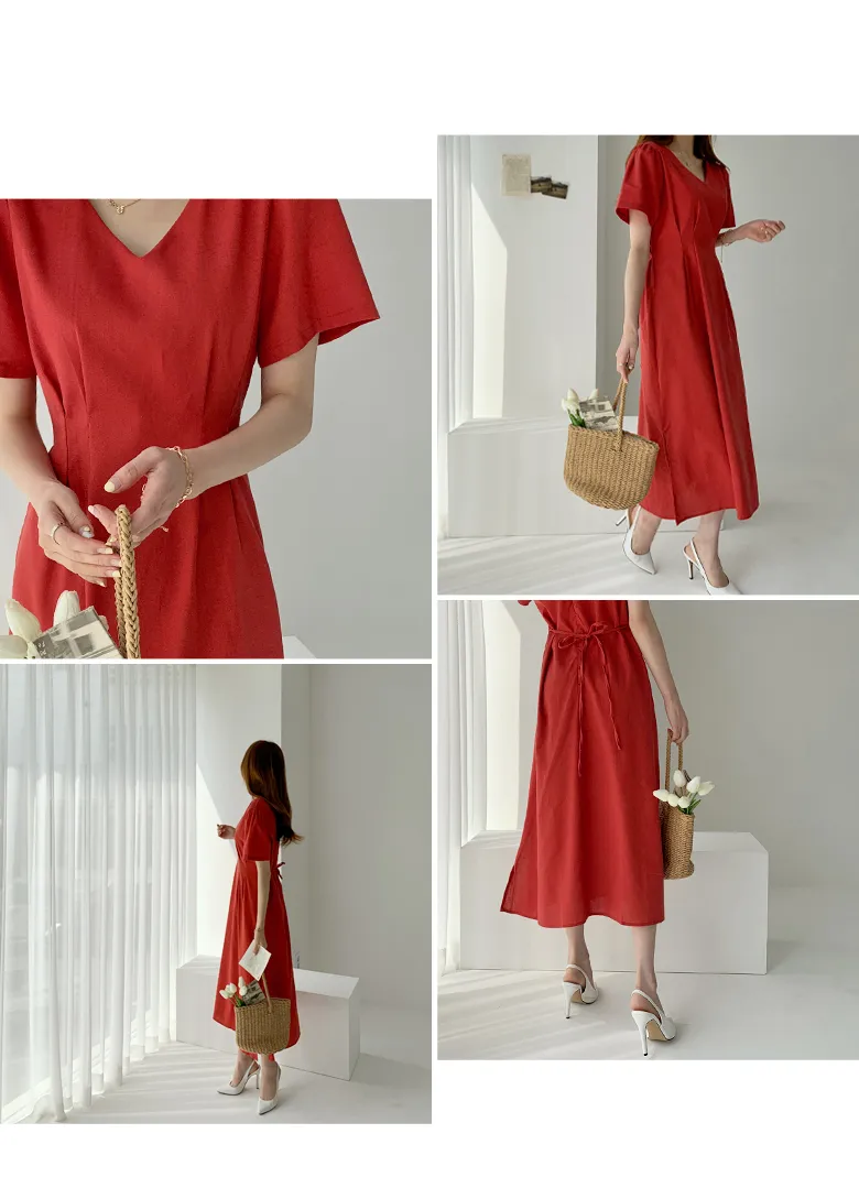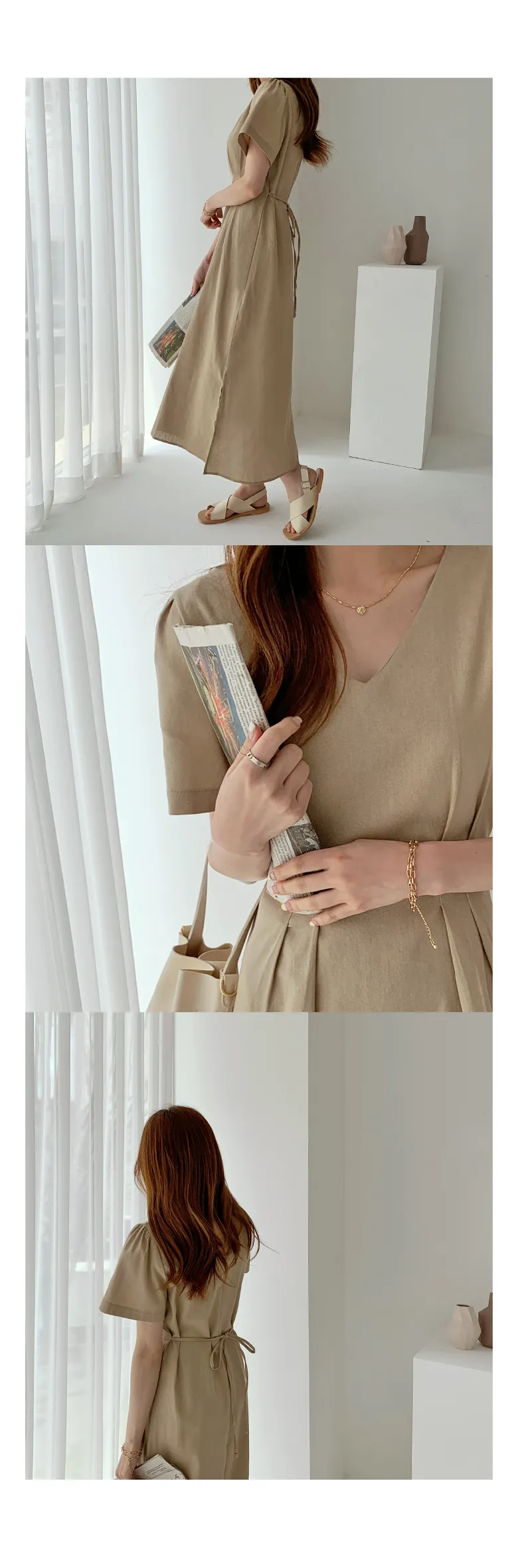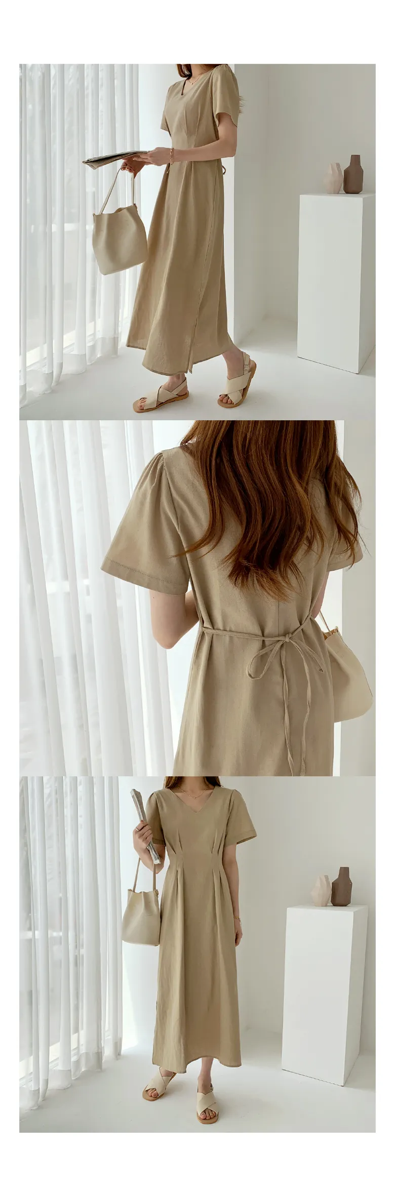 リネン混ラウンドネックスリットマキシレイヤード風Hライン(ロング丈)リンクルフリーヒドゥンジッパー無地ワンピース