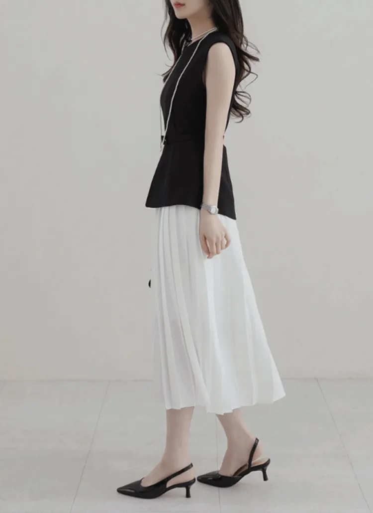 ラウンドネックプリーツロング配色ノースリワンピースベルト付