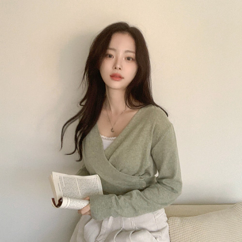 メランジVネックスリムラップ調長袖セミクロップドニット