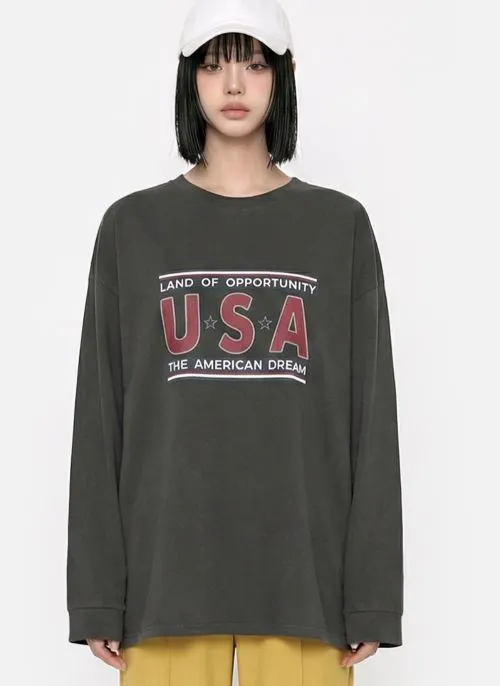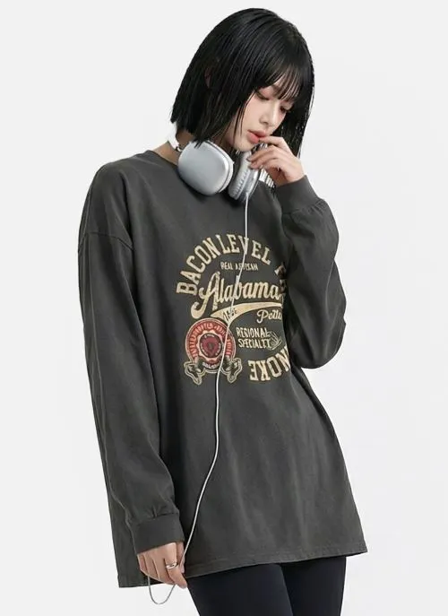 コットンラウンドネックオーバーサイズ長袖ビッグプリントTシャツ・B1961514