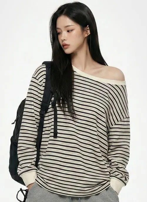 コットンボートネックワンショルダー長袖ボーダーTシャツ・B1961547
